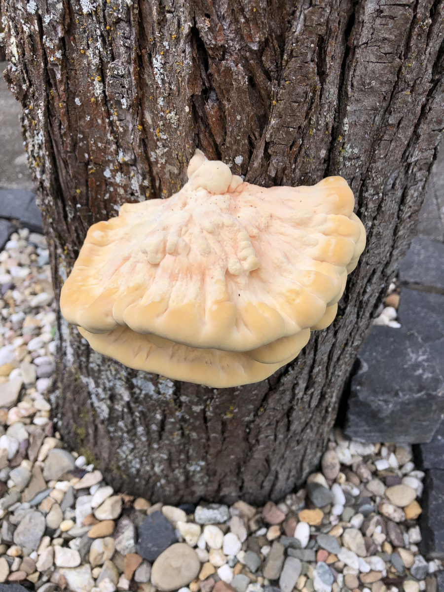 vor drei Tagen ist mir dieser Pilz an einem Pflaumenbaum in meinem Garten aufgefallen. Er wächst recht schnell, ist handgroß und wird bei Anschnitt etwas dunkler. Er riecht nach Moos oder Erde, nach dem Anschnitt deutlicher als vorher.