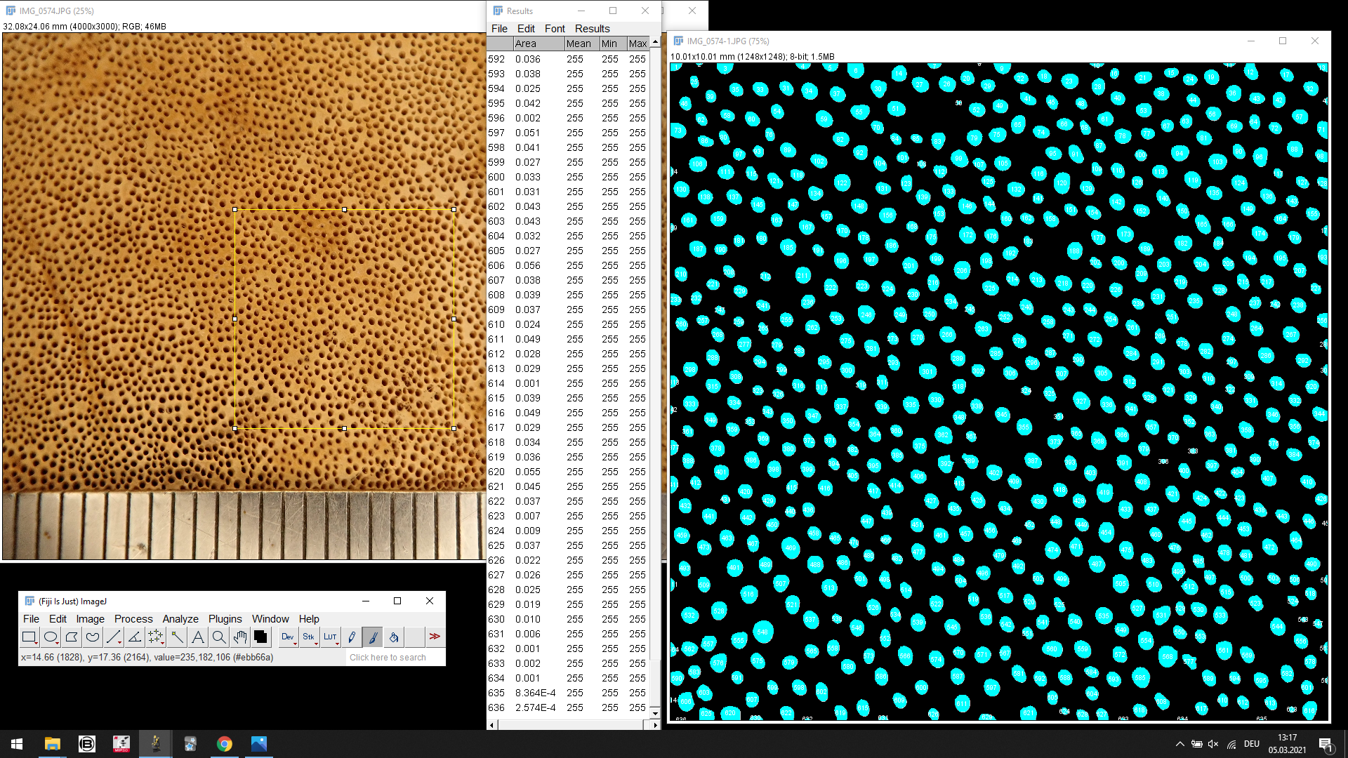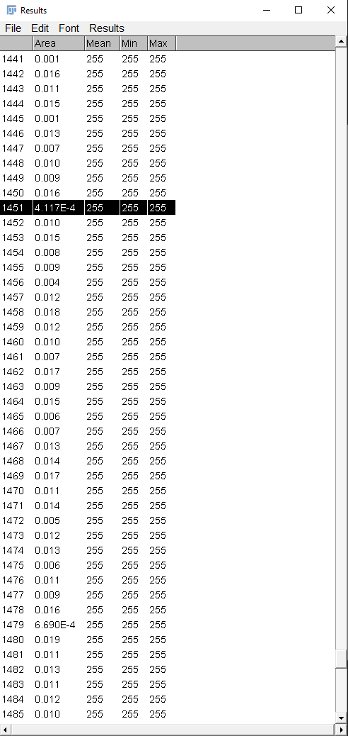 Mir ist gerade aufgefallen, dass man die Fehlerquote in der Auszählung ganz einfach abschätzen kann. In den Messresultaten wird auch die Fläche der gezählten Objekte angezeigt. Alle Werte die viel kleiner sind wie der markierte können keine Poren sein. Wenn ich dort alles durchscrolle ist die Fehlerquote Pi mal Handgelenk aber ziemlich klein und spielt auch keine grosse Rolle wenn es nachher sowieso auf mm oder mm^2 runterrechnet. (€ Ich sehe zwar grad, dass da doch ziemlich viele Objekte sind, die in der Fläche deutlich abweichen, aber nicht so deutlich wie File 1451. File 1441, 1445,1456 zum Beispiel.) Man könnte die Fehlerquote sicher auch noch weiter runter bringen indem man das Bild mehr bearbeitet und in Analyze Particles ein Häkchen setzt bei Exclude on edges.