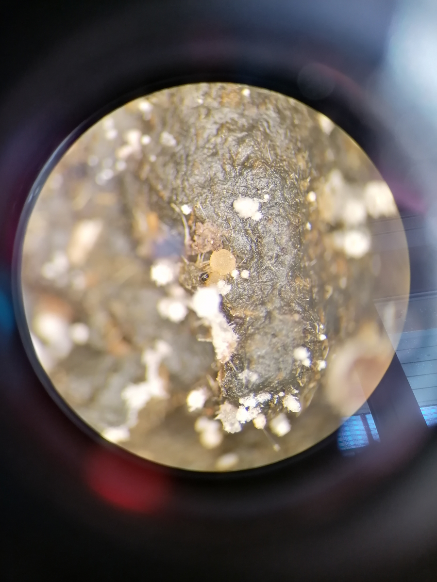 Ich mache mit meiner Freundin schon länger Witze darüber, dass ich bald noch anfange Dungproben einzusammeln. Vor einigen Wochen hab ich dann tatsächlich mal nicht näher bestimmten Dung von irgendeinem pflanzenfressenden Waldbewohner mitgenommen und unter der Stereolupe betrachtet. Da waren kleine weisse Punkte zu sehen und viele kleine transparente Würmer. Das war erstmal zu viel für mich und so hab ich das Zeug wieder versorgt und erstmal vergessen.