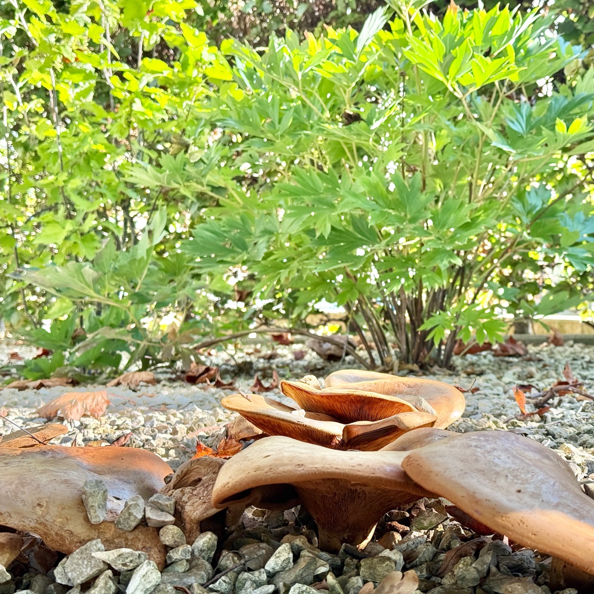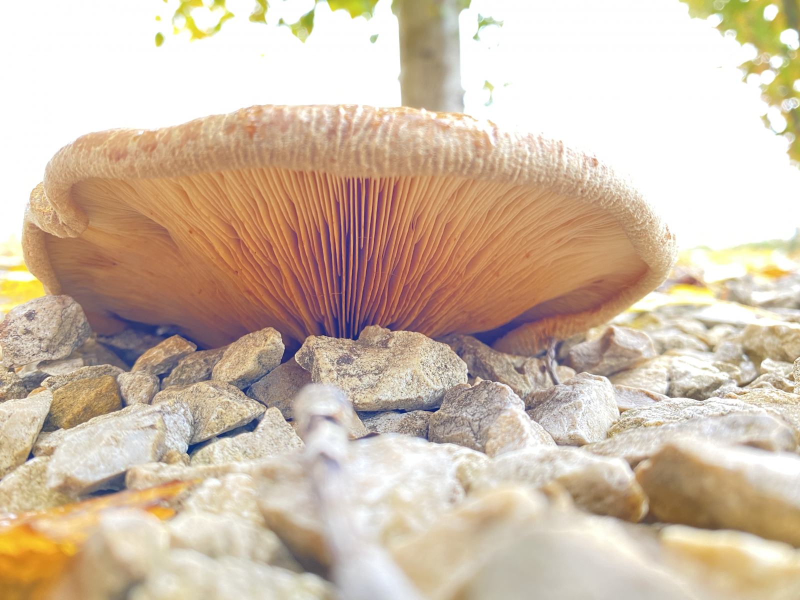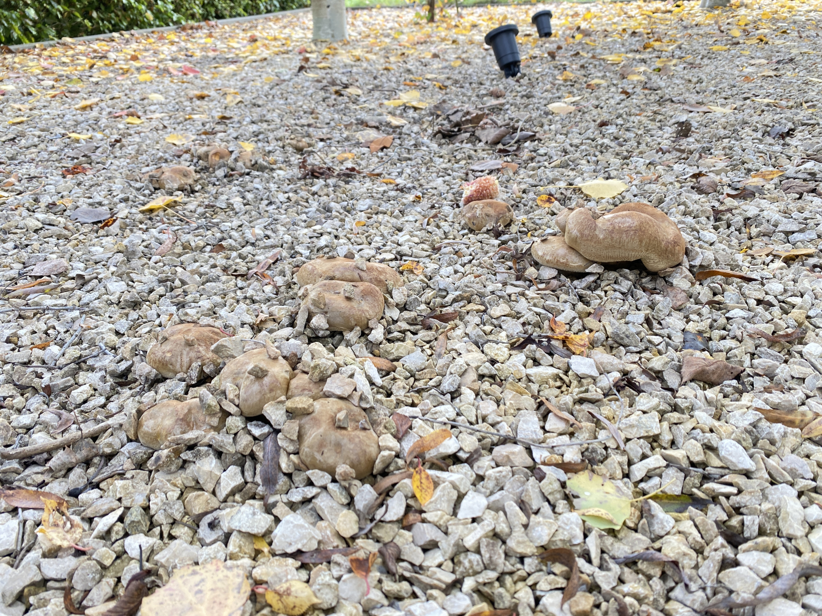 mein Pilz ist offenbar riesig, auf einer Fläche von ca. 30 Quadratmetern auf der Ebene oberhalb dieser Trockenmauer schieben sich jetzt insgesamt etwa 50 Fruchtkörper durch den Splitt. Darunter liegt eigentlich ein massives Kunststoff-Vlies auf Lehmboden.