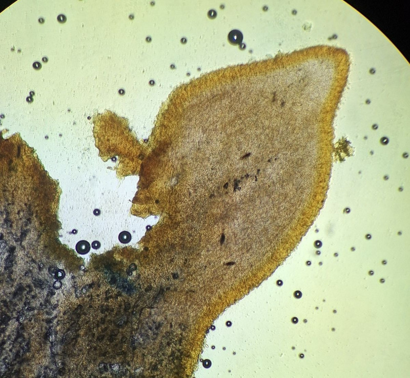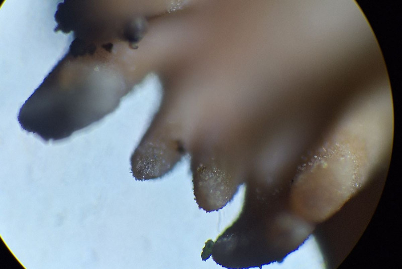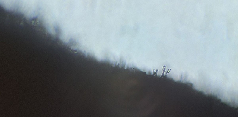 Bei den dazwischen liegenden Stecknadelflechten meine ich in Bezug auf das Erscheinen und die Frische der Apothecien auch Saisonalität zu erkennen. Das Scheunentor mit Ch. phaeocephala etwa hatte kaum noch junge bunte Apothecien und der ganze Belag war mit Spinnennetzen (oder so, den Urheber habe ich nicht gefunden) verwoben und das Ganze deutlich schwerer als Stecknadelflechte zu erkennen. Sowas wie Calicium glaucellum, die ich auch im Sommer und frühen Herbst reichlich gefunden hatte, wies fast nur leere Beere Becher auf, ohne Mazaedium und auch im Präparat oft nur mit ganz wenigen Sporenresten.