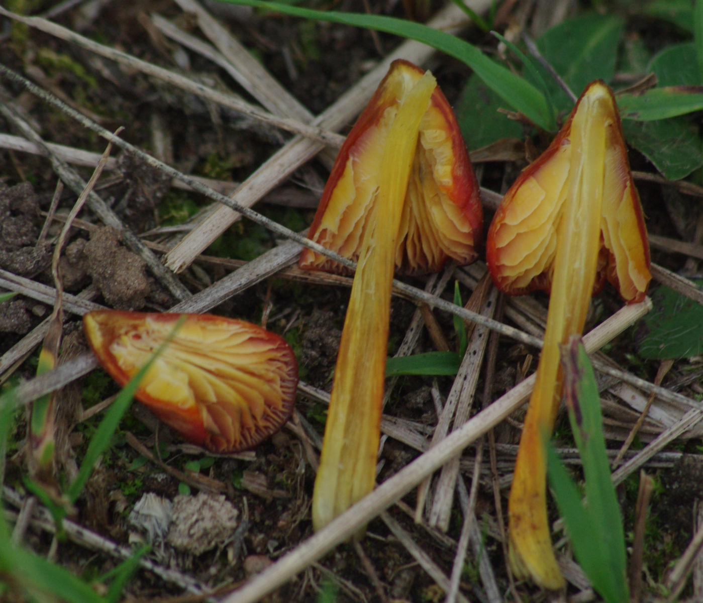 Gelb, orange, rot. Deutlich schwärzend, alter Pilz komplett schwarz. Oberfläche nicht feucht, nicht schleimig. Geschmack mild, Geruch unspezifisch, schwach. Bis 5 cm hoch. Bilder vom 14. und 17. 9. - Datum im Dateinamen.