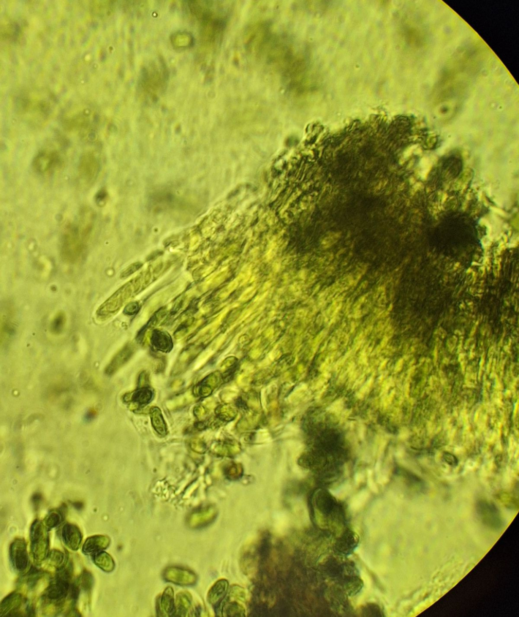 Sporen sind etwa 3 µm im Durchmesser, in erster Nährung kreisrund, glatt. Am Glas war ich mir nicht sicher, ob die Sporen pigmentiert sind oder nicht/schwach. Nach den Fotos (und Vergleich zu den anderen Arten) tendiere ich eher zu "pigmentiert".