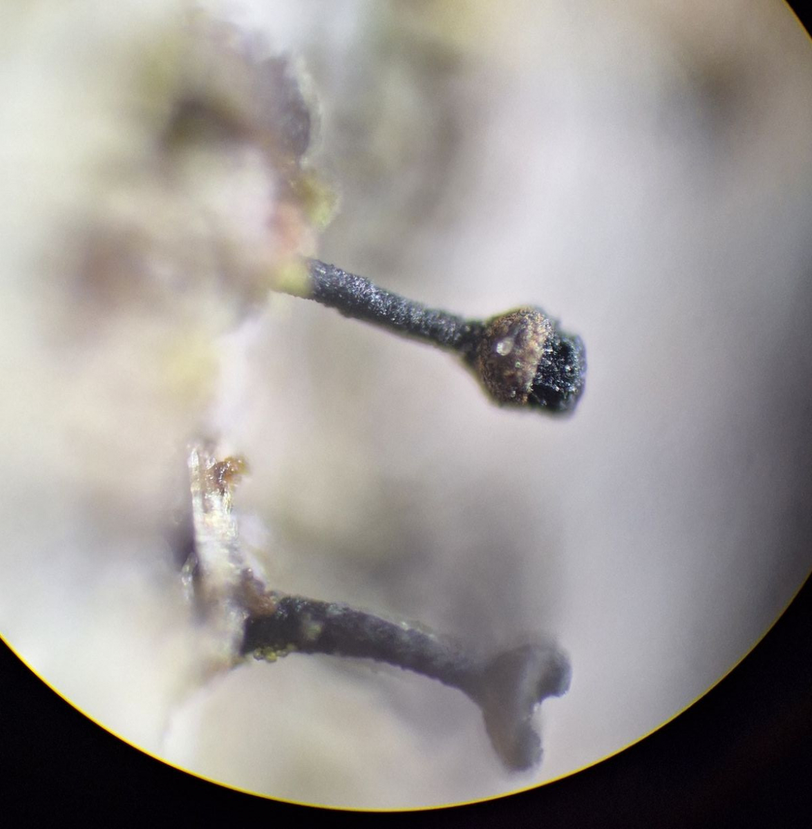 Auflicht, die ältern Köpfchen scheinen wollig zu sein, teils auch mit Algen verclustert, ein Lager ist nicht zu sehen. Kurz gestielt, um 0,5 mm
