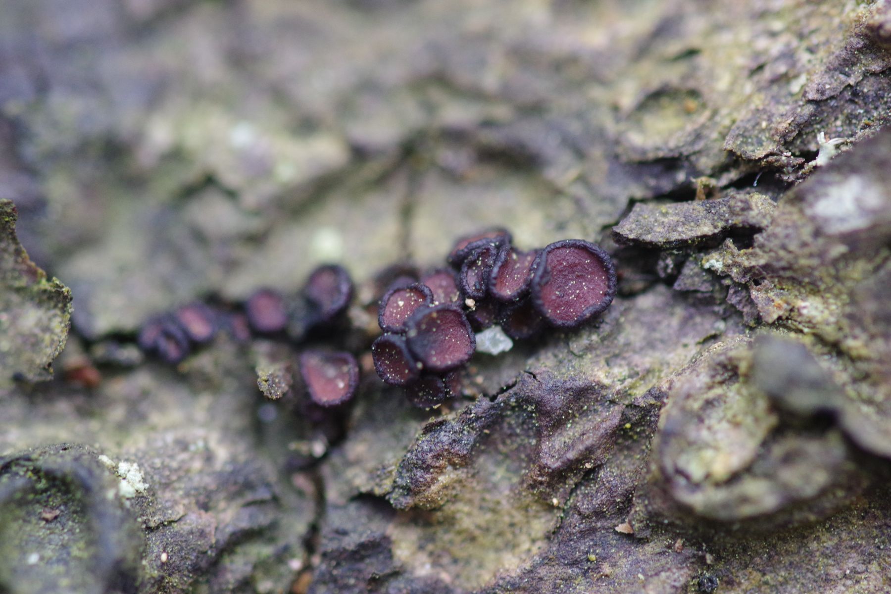 bei einem Waldbrand vor etwa 20 Jahren hat es (u.a.) eine Fichte im Bodenbereich schwer angebrannt, die dann stark harzte, noch ein paar Jahre vor sich hin kränkelte, vor etwa 3-4 Jahren sind die sterblichen Überreste umgefallen. An diesem Stubben, in der harzreichen Fichtenrinde wächst ein dunkler Becher, deutlich gestielt, die größten Exemplar über 2 mm. In Büscheln.