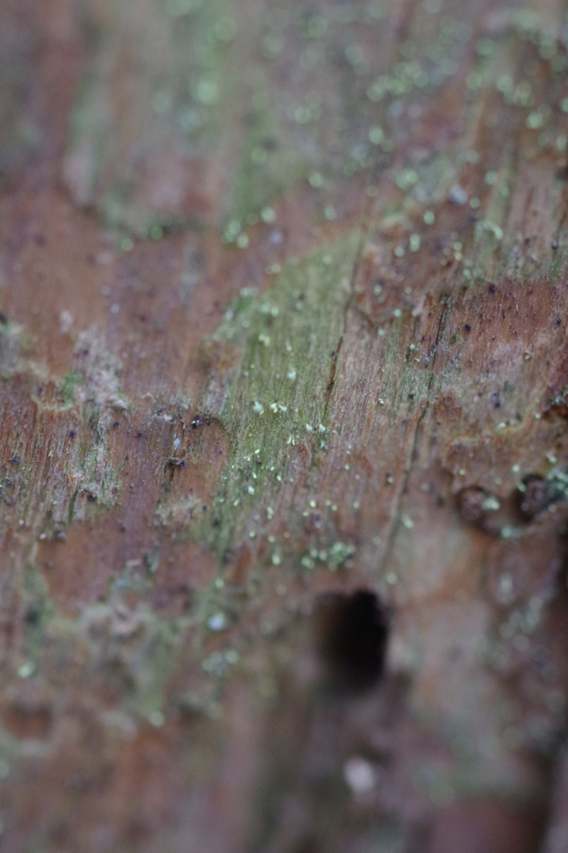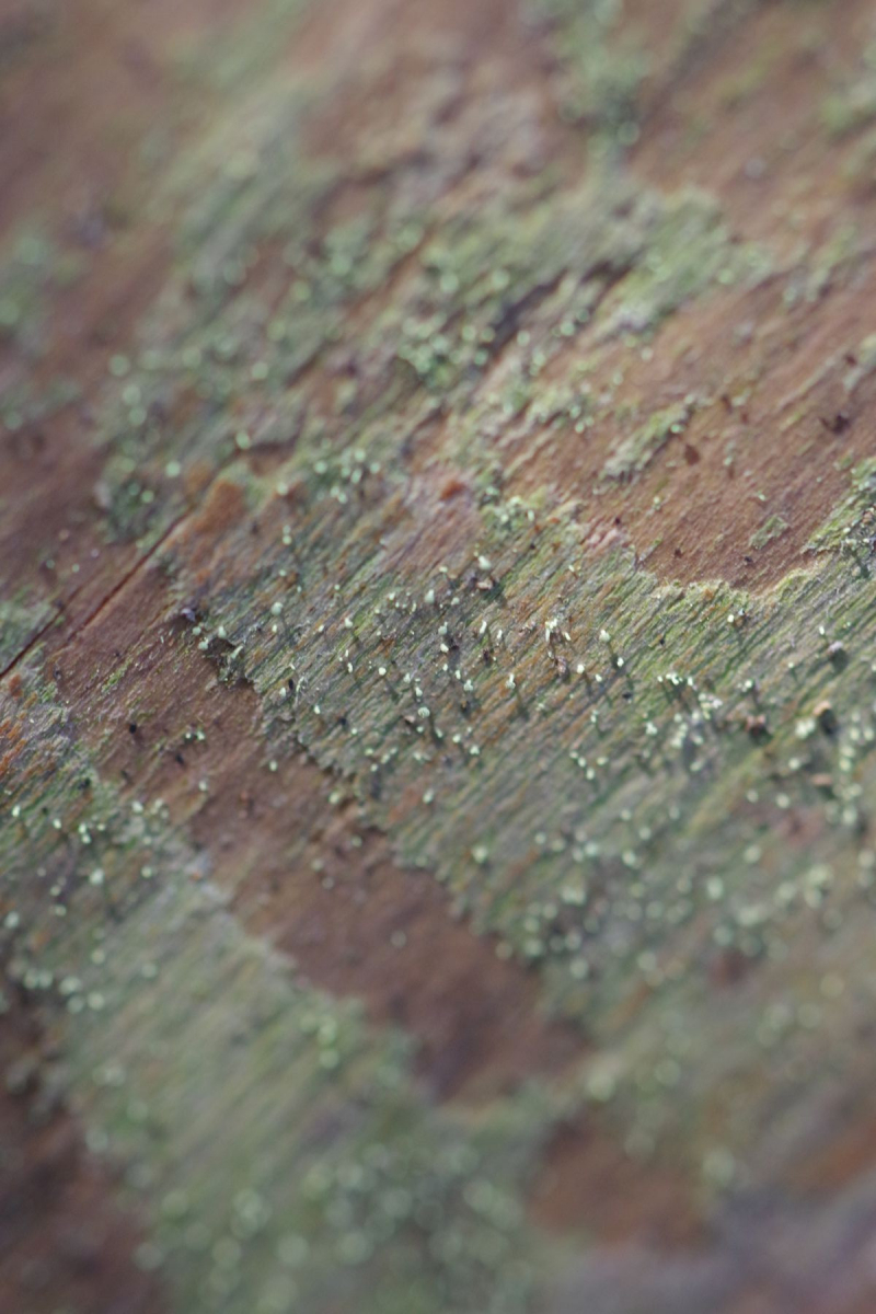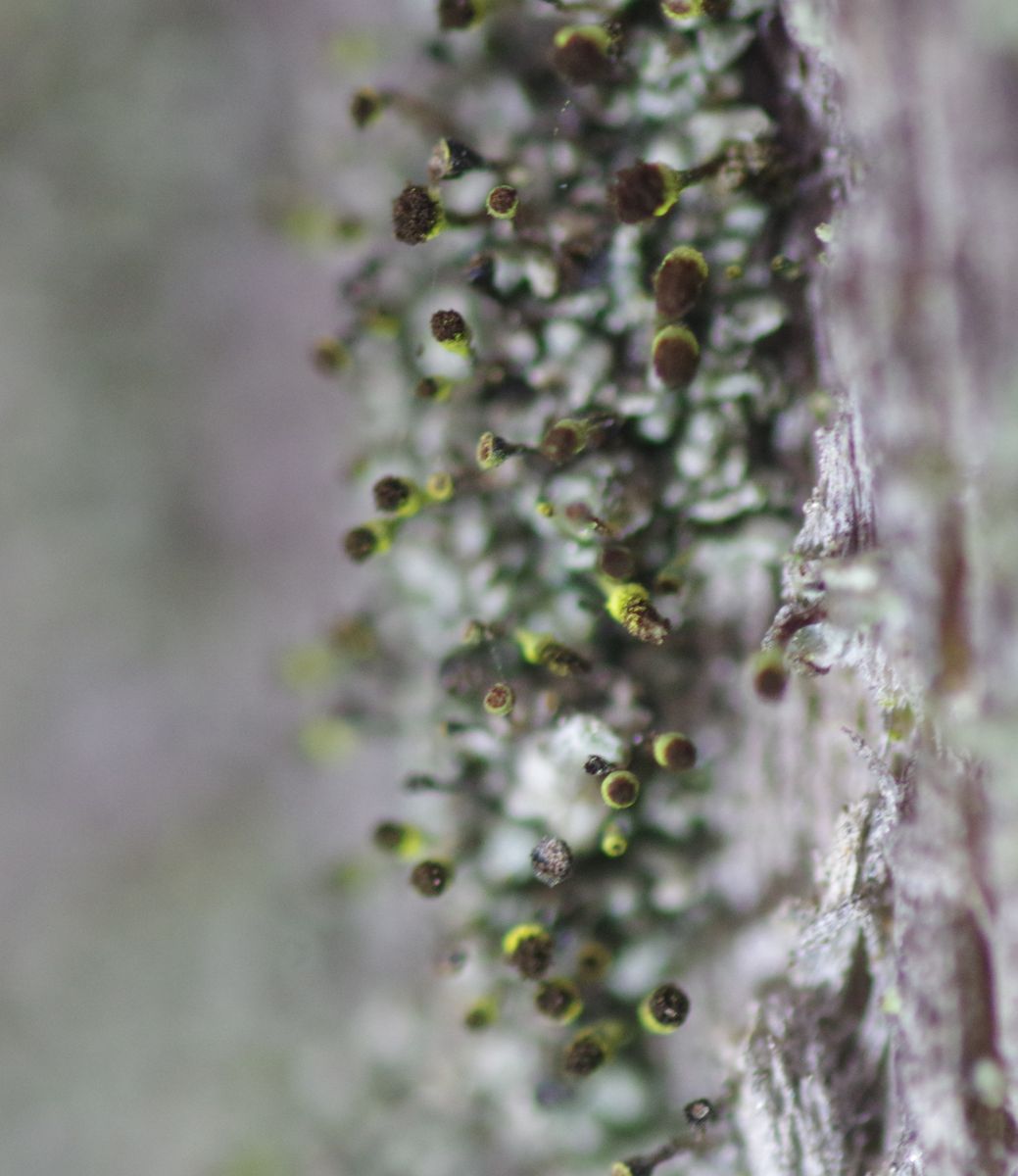 da ich gerade bei den Stecknadelflechten bin, hab ich noch eine andere Art eingesammelt. Direkt vom Hof am Brennholzschuppen (anno etwa 1980), an den oberen Fichtenbrettern. Südseite, durch das überstehende Dach regengeschützt