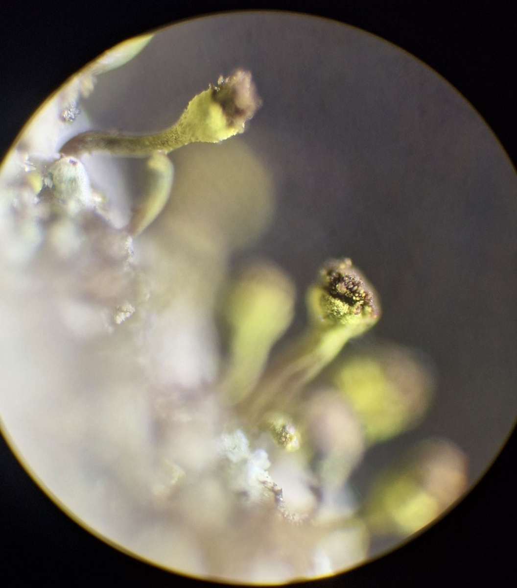 Hallo Stefan, willst Du damit sagen, dass das keine Flechte ist? Hast Du ein Beispiel für einen Pilz, der ein Mazaedium bildet und keine Flechte ist? Oder meinst Du, dass das gar keins ist, und dass das Konidiensporen sind? Ich sehe keinen prinzipiellen Unterschied zu den anderen Stecknadelflechten, die ich in den letzten Tagen angeschaut habe (viele davon auch hier gezeigt).