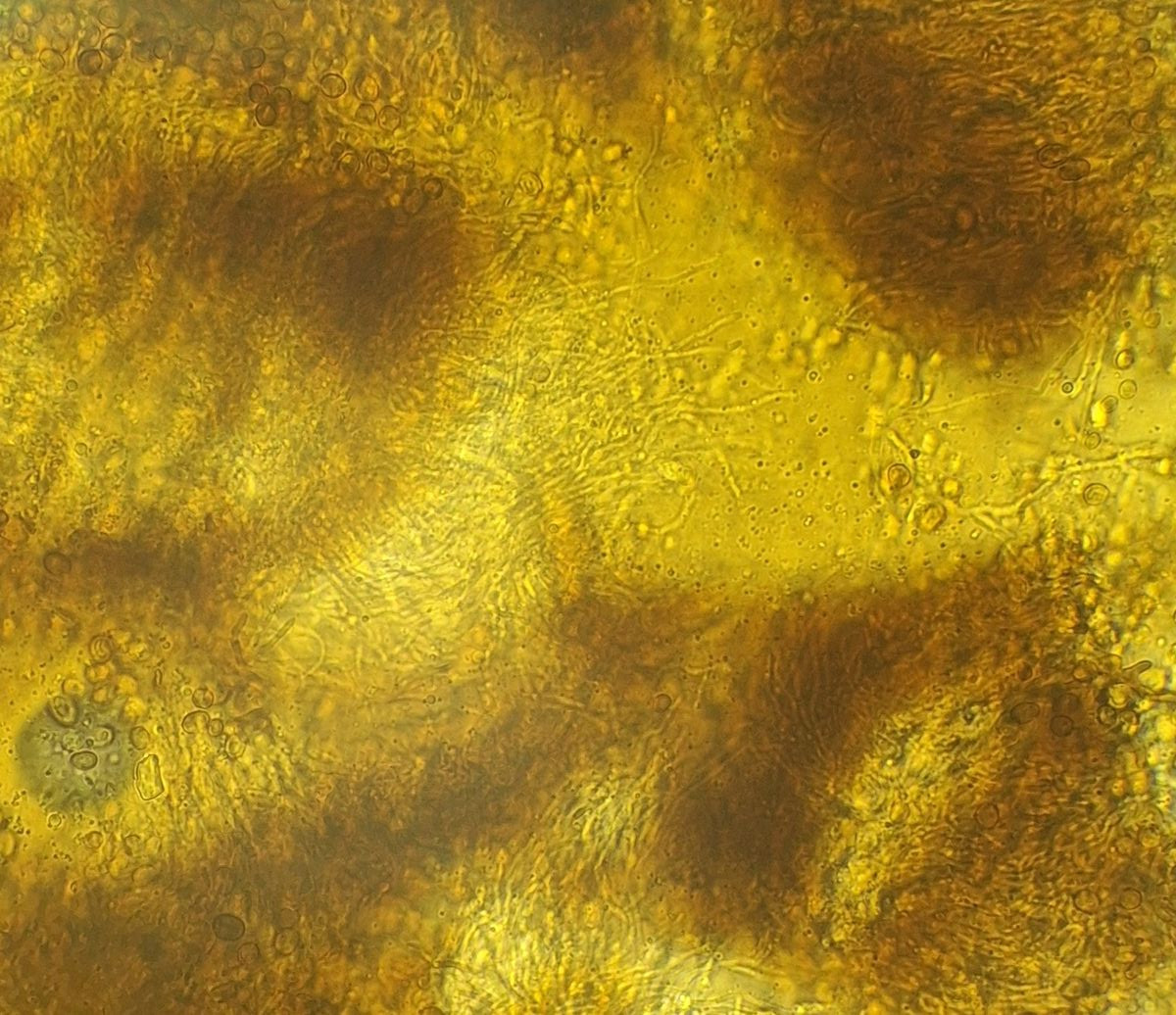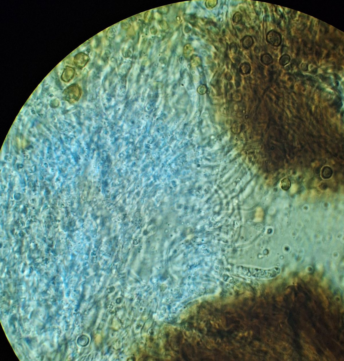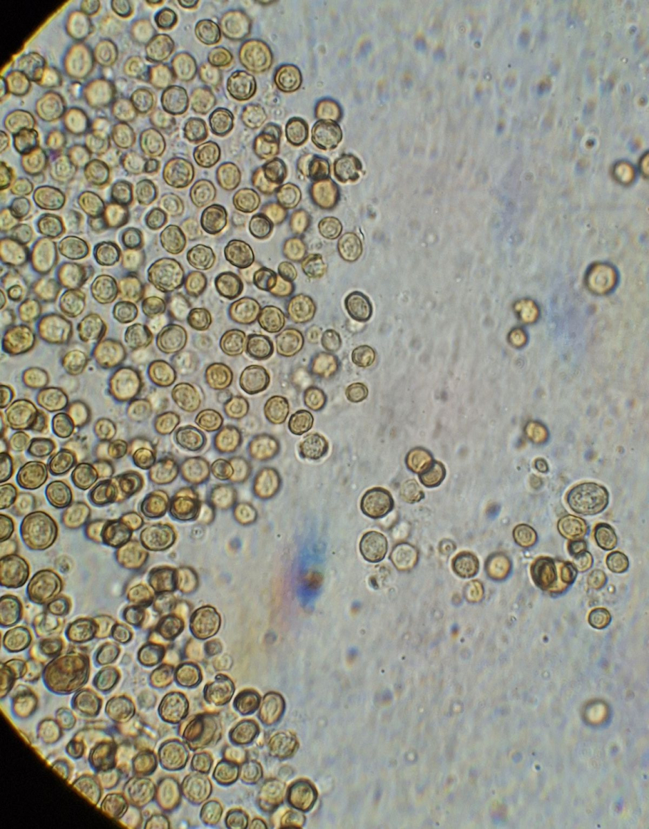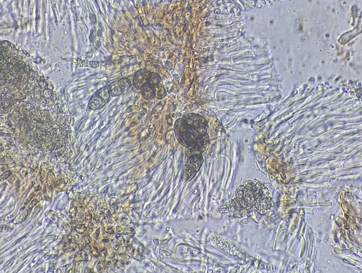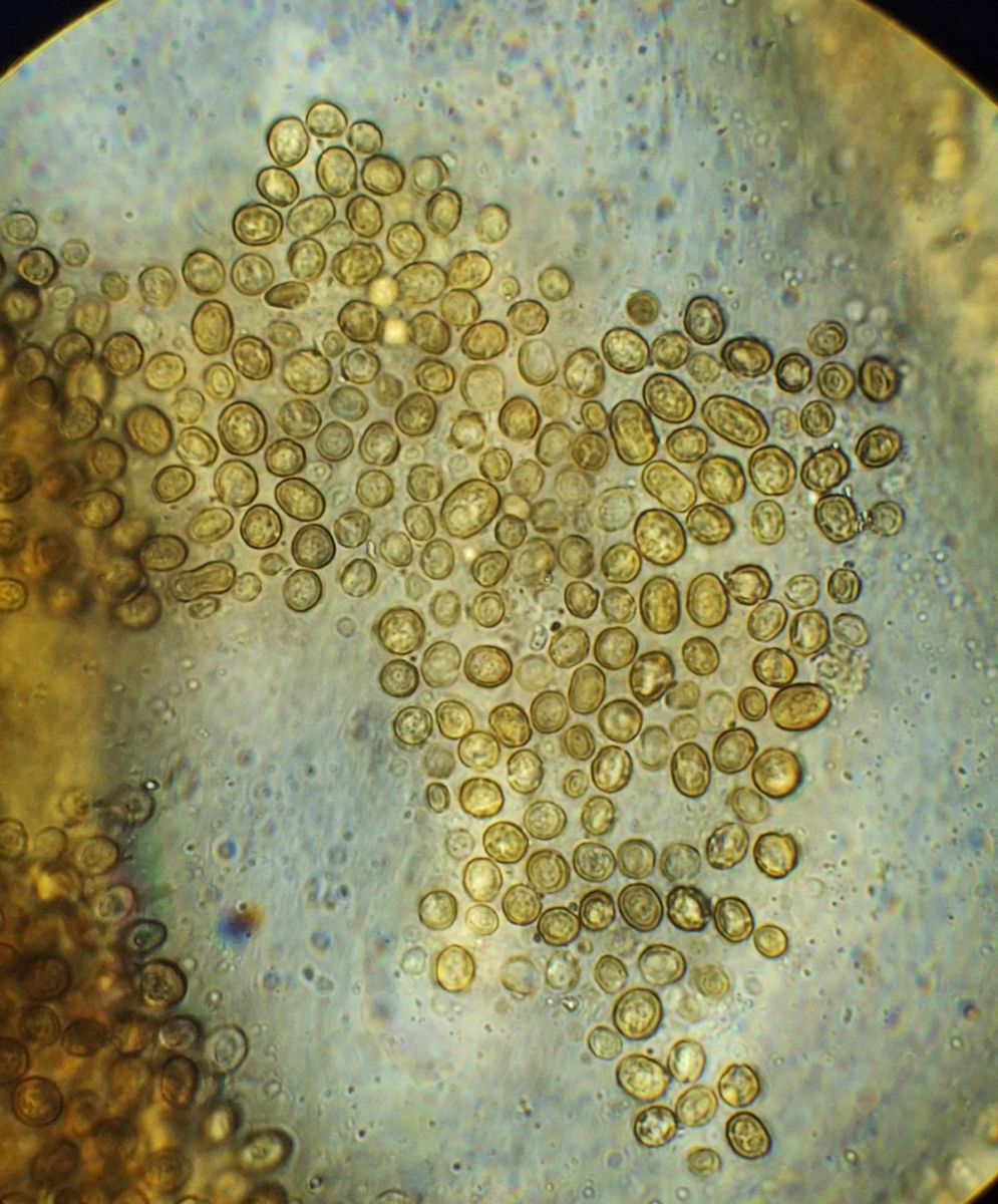 Sporen sind etwa 3 µm im Durchmesser, in erster Nährung kreisrund, glatt. Am Glas war ich mir nicht sicher, ob die Sporen pigmentiert sind oder nicht/schwach. Nach den Fotos (und Vergleich zu den anderen Arten) tendiere ich eher zu "pigmentiert".