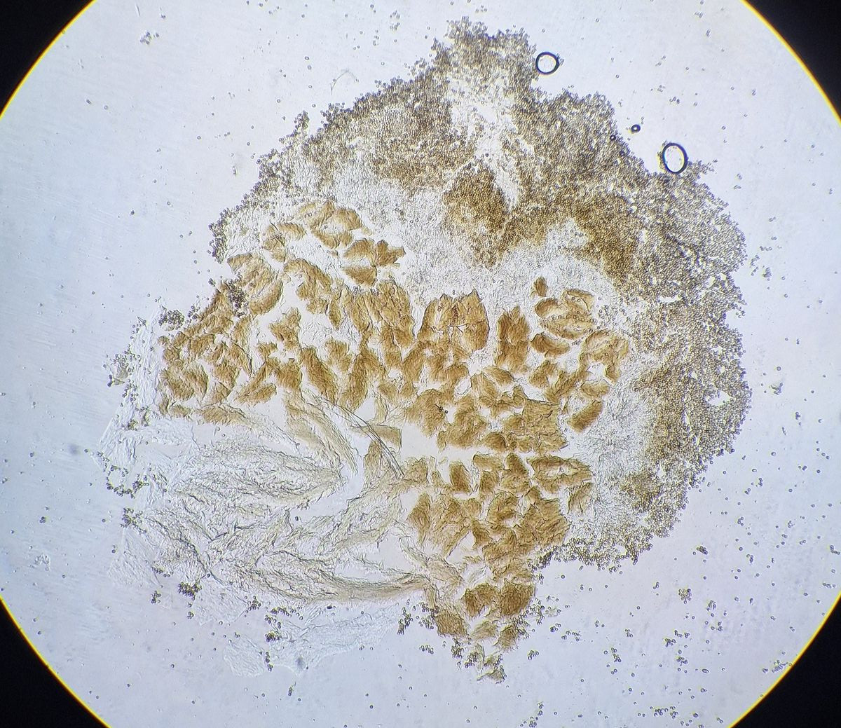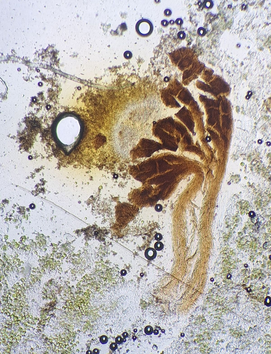 vor Ort nicht gesehen, erst unterm Mikro entdeckt, daneben ist noch eine deutlich winzigere gelbe Stecknadel auf grauem Lager