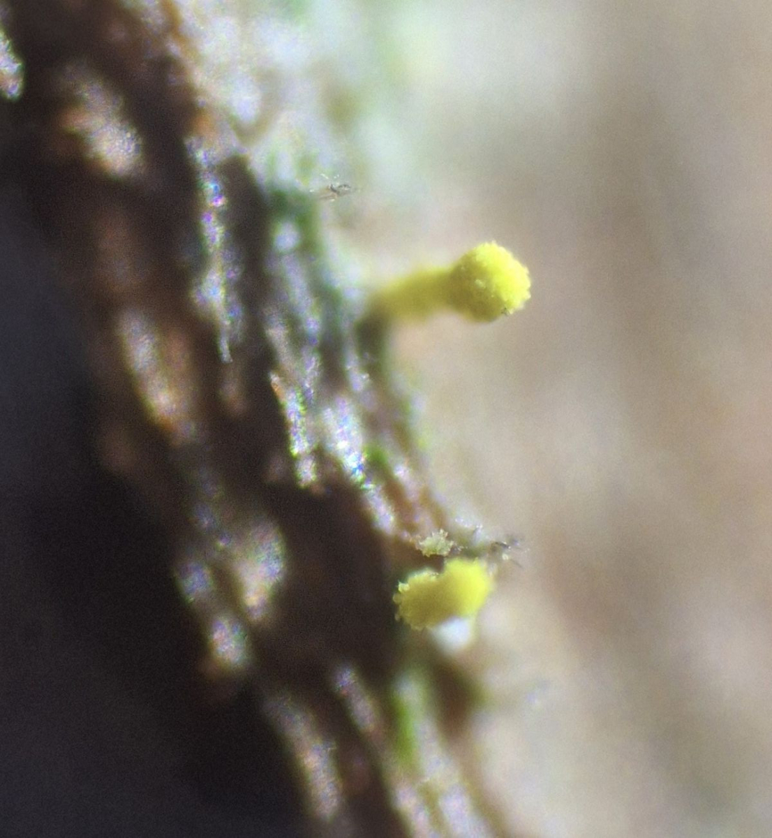 an einem Fichtenrest, der vor einigen Jahren (<10) abgebrochen ist und seitdem von Ameisen bevölkert ist, habe ich überraschend eine knallgelbe Stecknadelflechte gefunden, Südseite, ohne irgendwelchen Wetterschutz. Ohne gefärbtes Lager, wie dies bei Ch. furfuracea der Fall wäre. Zudem sind diese Stecknadeln viel kürzer gestielt. Zusammen mit dem kurzen Stiel und der Färbung ist mein Verdacht Chaenotheca brachypodia (brachypodia "Kurzfuß"), die auch das Synonym Ch. sulphurea hat, was farblich exzellent passt.