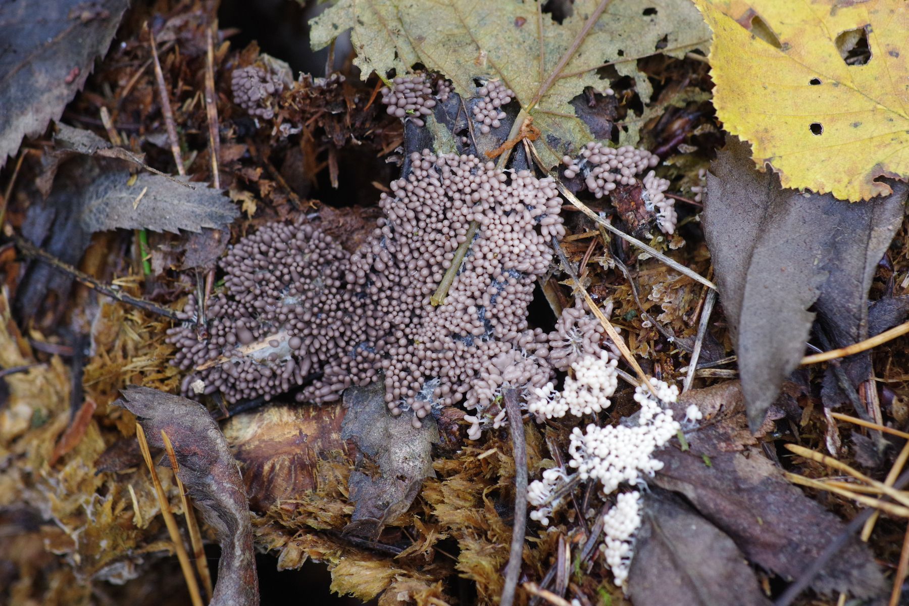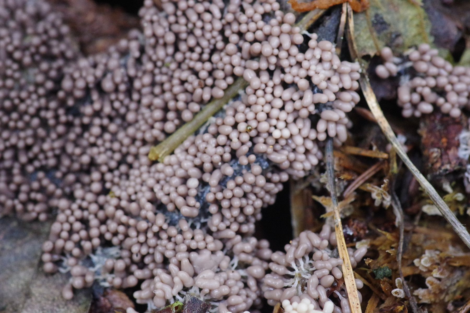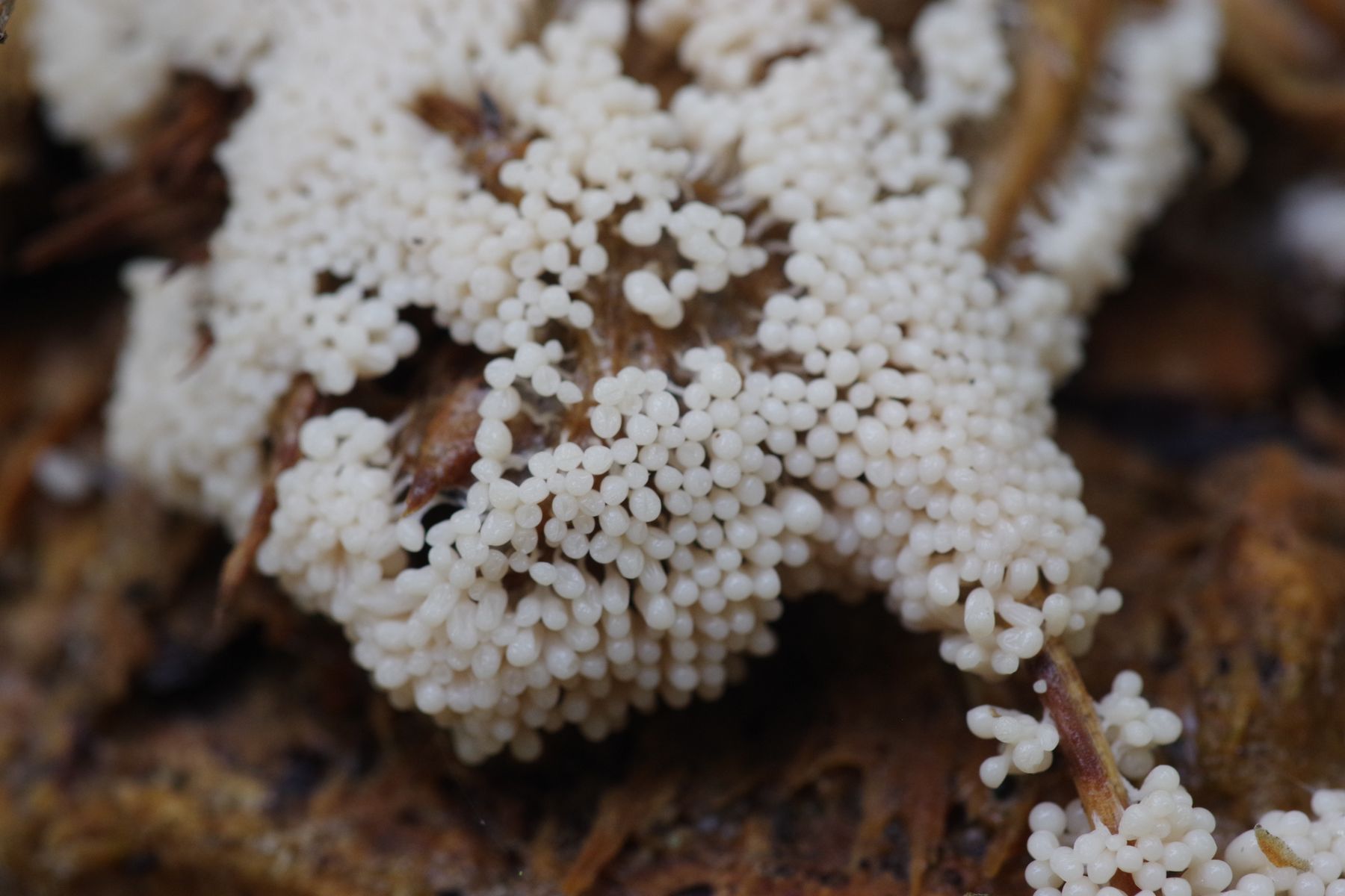 Seit Oktober sehe ich an einem relativ frischen Fichtenstubben (gefällt im letzten Winter, war aber schon abgestorben und innen verfault) einen (?) Schleimi, der zunächst leuchtend weiß war. Heute habe ich ein stück geerntet und näher angeschaut