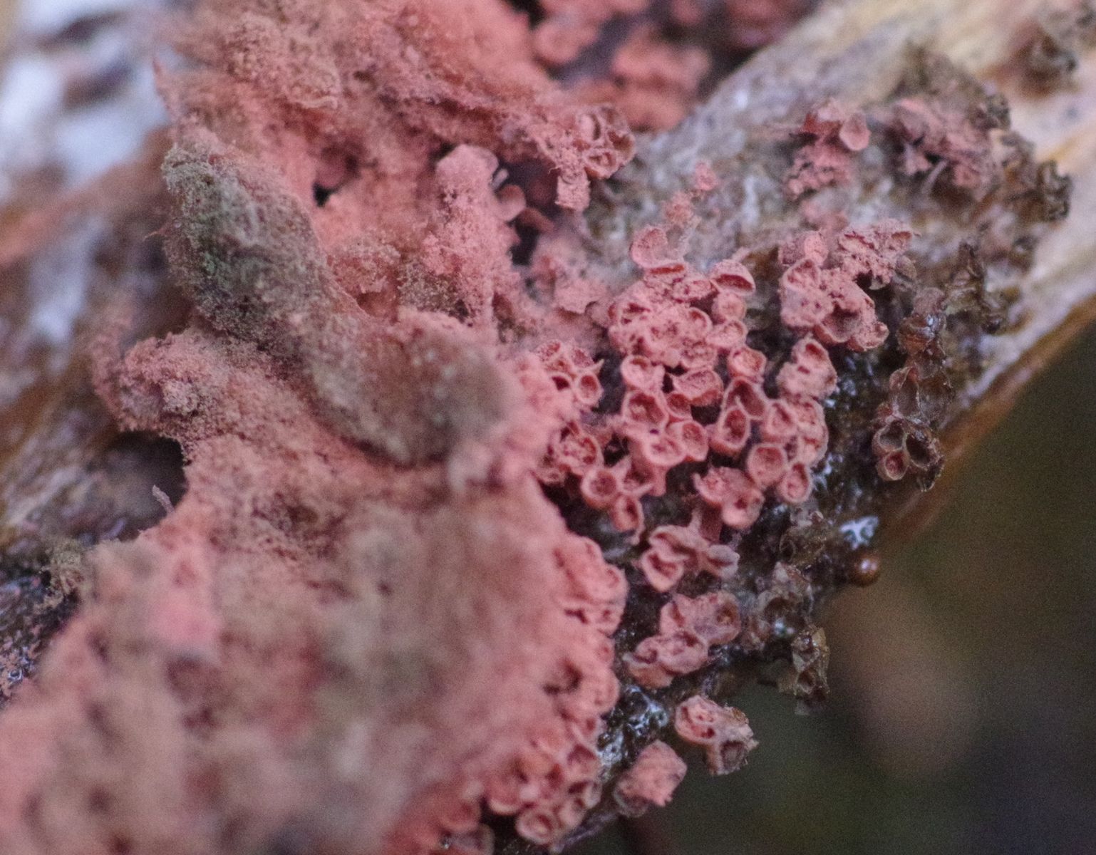 auf Kiefernscheiten, die seit einiger Zeit draußen liegen, wächst ein grelloranger Fältling.