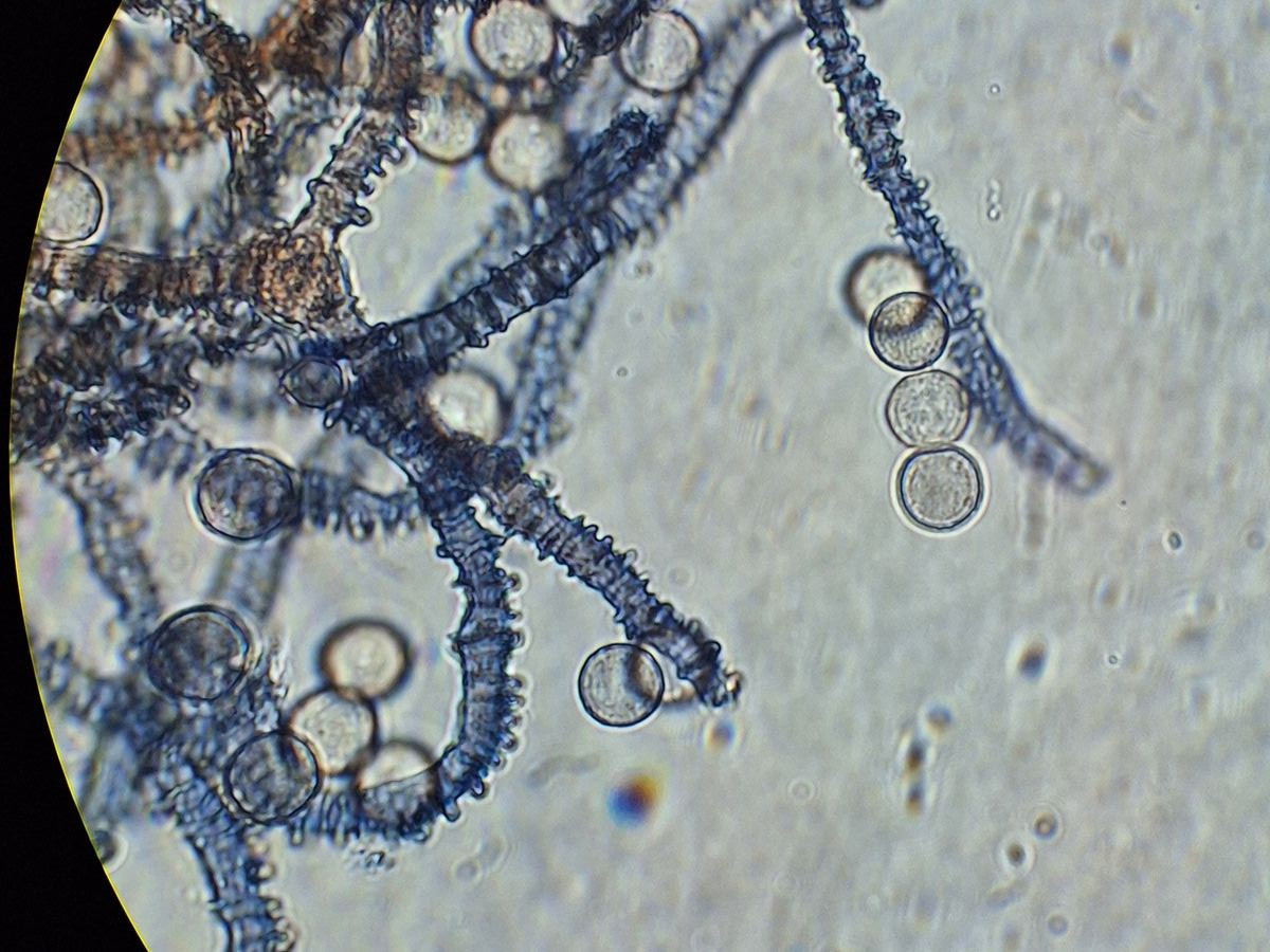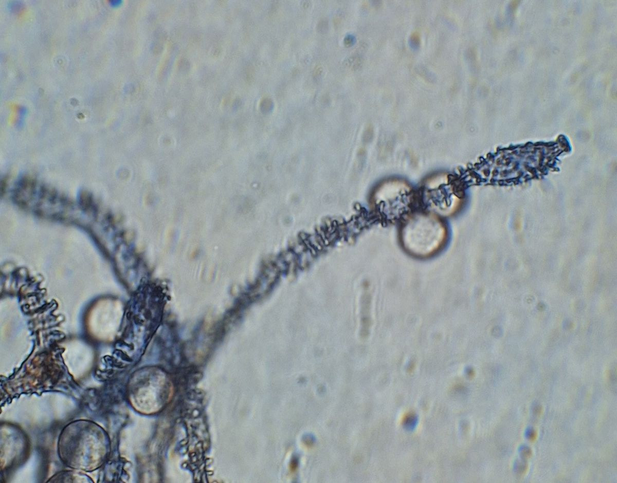 die Hyphen sind 4-5 µm dick, mit Auswüchsen, die eher nicht ringförmig sind, 1-2 µm hervorstehend, die Enden keulig verdickt 6-8 µm, ~120° Verzweigungen, nicht allzu häufig; Sporen eher glatt, rund, 8-10 µm, Warzen oder Stacheln sehe ich nicht