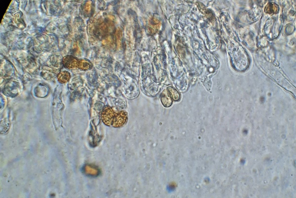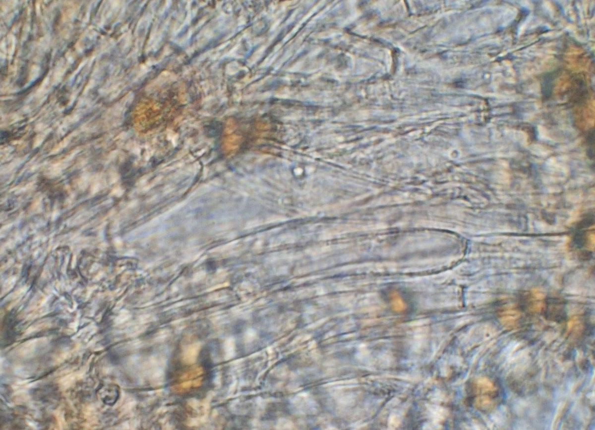 In Melzers, Sporen dextrinoid, lange kugelkopfige Strukturen (Zystiden?) vorhanden, Schnallen habe ich nicht gefunden