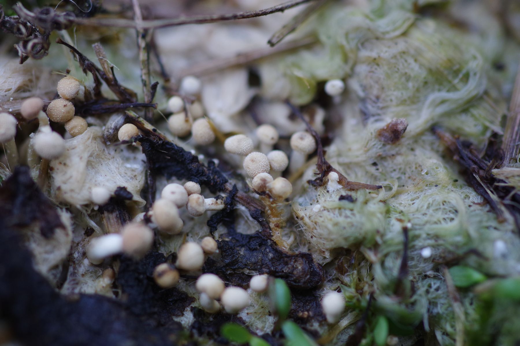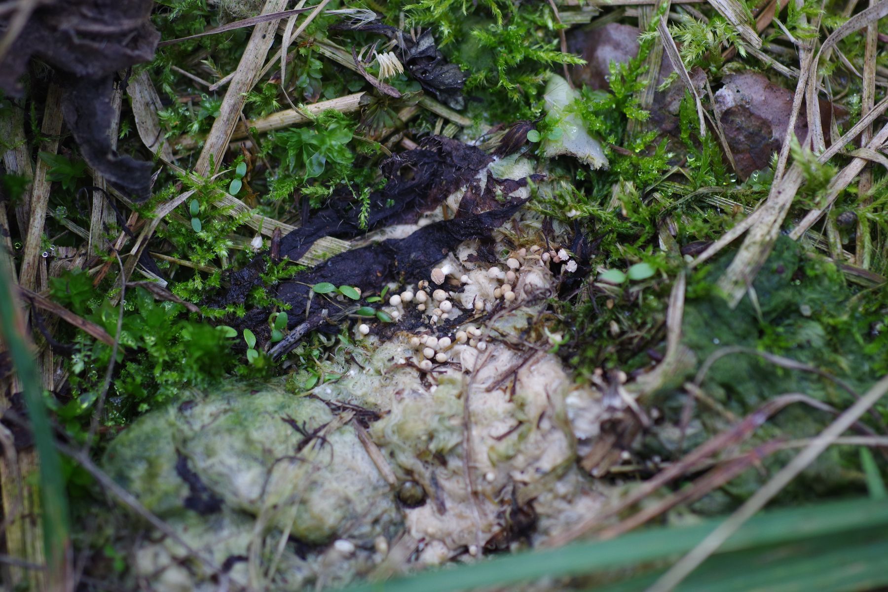 Gestern waren die Arten in unterschiedlicher Farbe aufgrund unterschiedlichem Feuchtigkeitsgehalt anzutreffen, weswegen sie mir aufgefallen war. Heute, nach Regen, ist sie ähnlich grün wie rufescens rechts. Dass die gesuchte Art gestern grüner als rufescens und damit wohl feuchter war, würde ich in der größeren Kapazität für Wasseraufnahme sehen (was ja experimentell zu be- oder widerlegen wäre, also jedenfalls die Trocknungsdauer nach Vollbad). Das ist von Nr. 1.