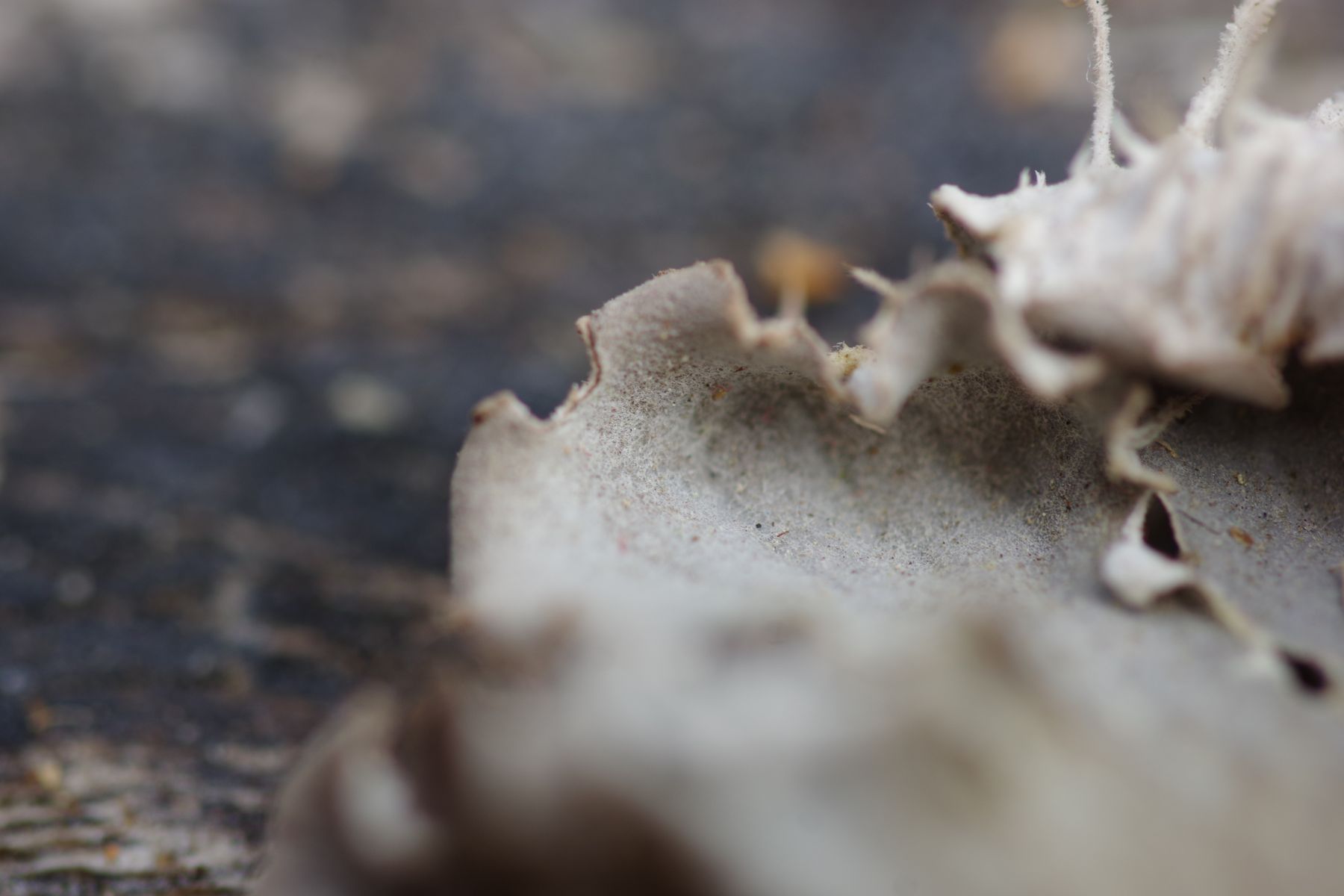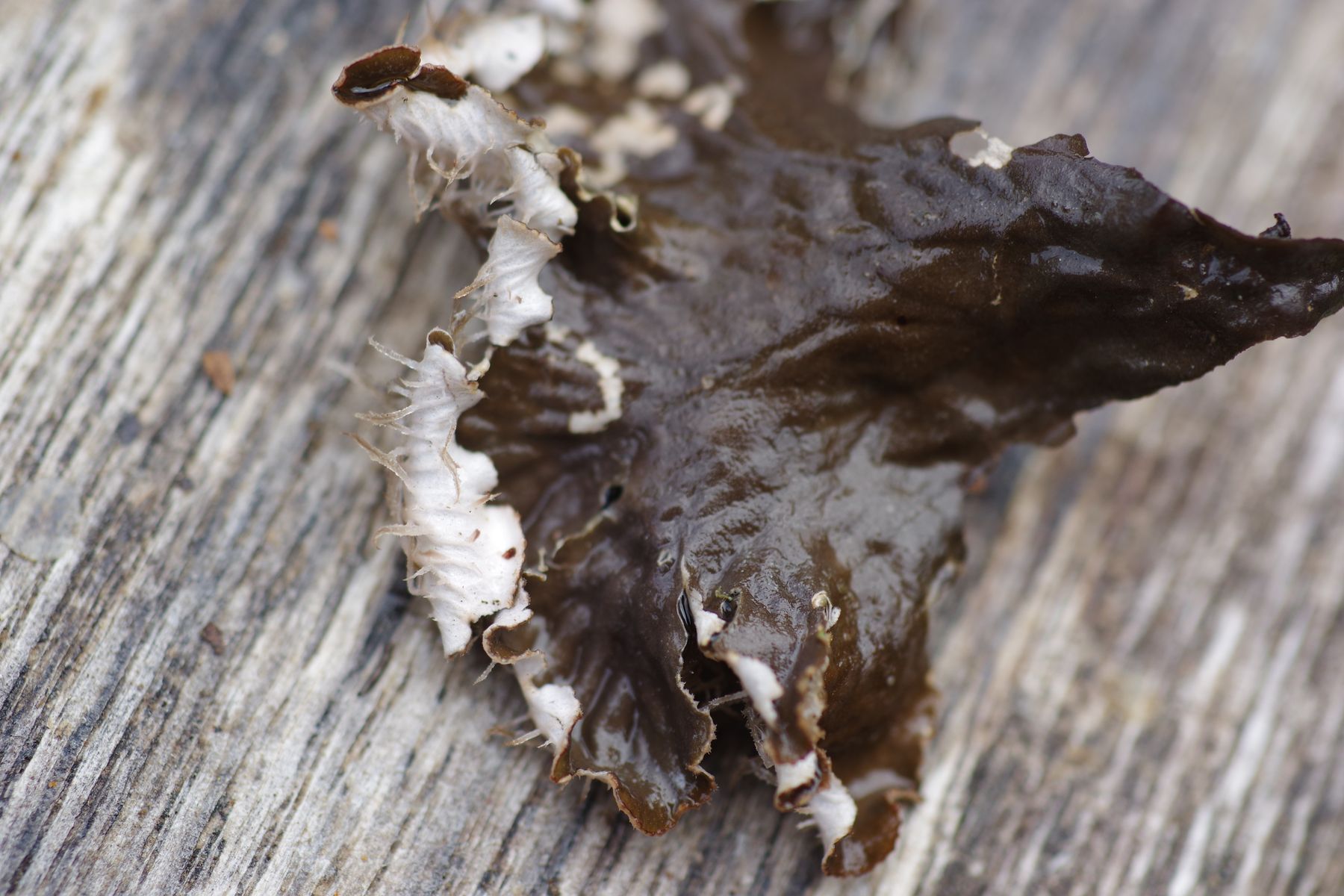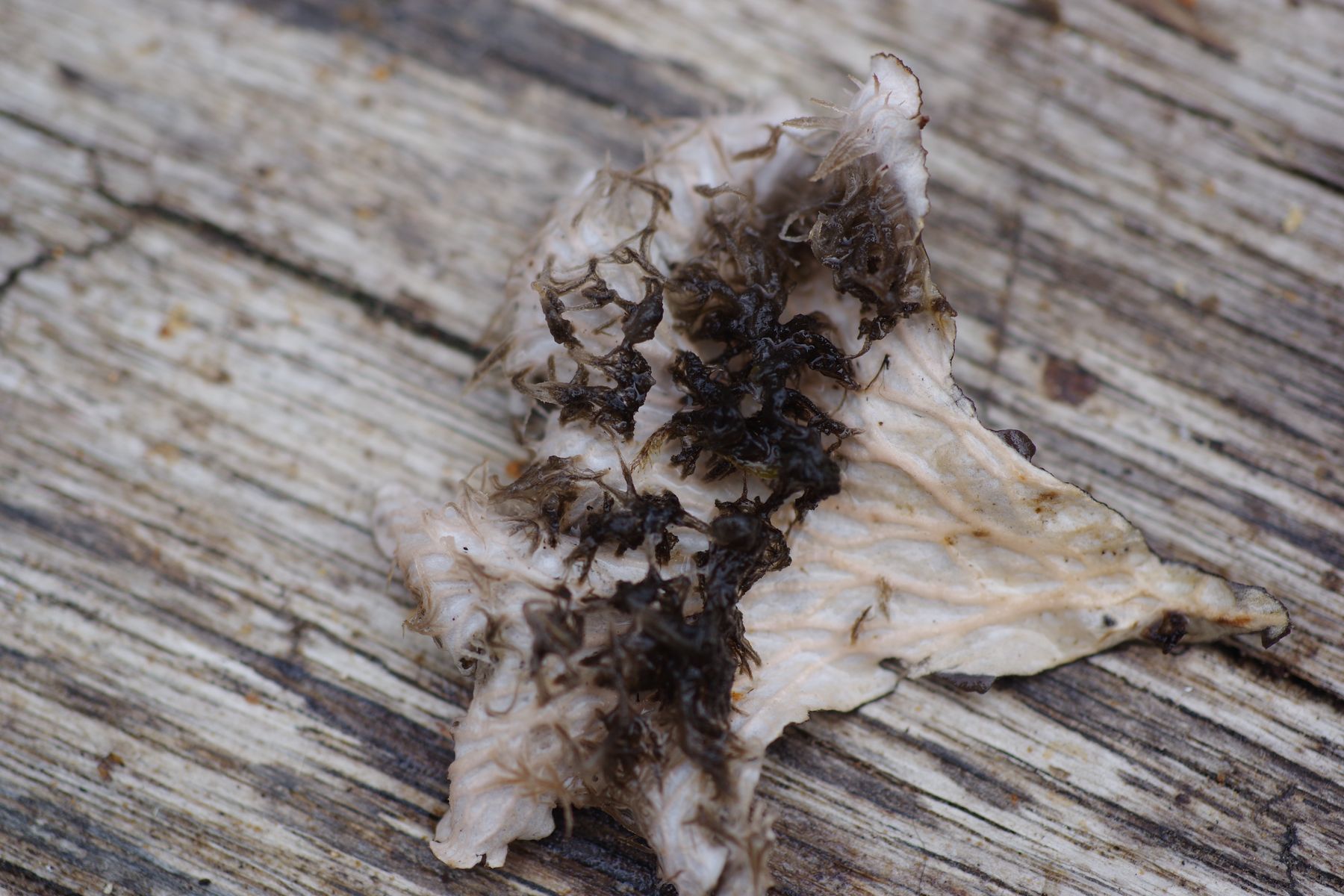 Hut bis 2 cm, faserig, mittig eingedellt und etwas dunkler, braun mit leichtem Blauschimmer. Stiel ca. 4 cm, grau, allenfalls in Hutnähe mit etwas Blautönen, unten weißer Belag, hohl nur unmittelbar am Hut. Auffallend viele Zwischenlamellen, Lamellen frei. Sporen 8-9*6-7 µm. Basidien 4 sporig, ca. 40 µm lang. HDS mit scharz/braun pigmentierten. Der gehört wohl zu Leptonia - mit dem Schlüssel von 2014 für die Leptonien komme ich aber zu keinem Ergebnis.