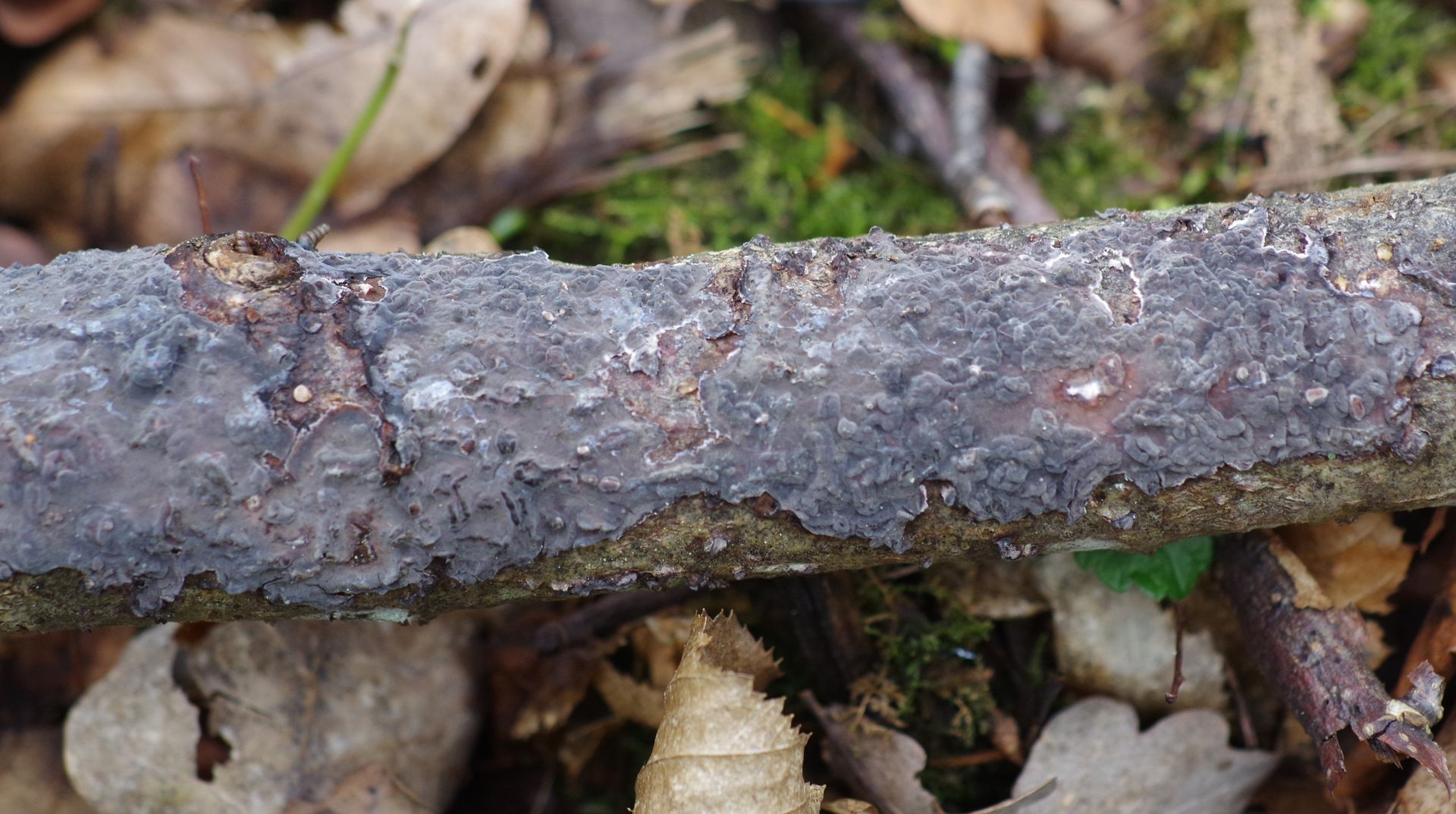 an einem Lindenzweig in der Laubstreu habe ich diesen Rindenpilz mit ~3 mm langen Stacheln gefunden. Nur resupinat, über etwa 30 cm, kaum fleckig. Farblich und stachelig hat mich der an Gloidon strigosus erinnert, aber die Hutbildung fehlt und das Wachstum im Dunkeln ist auch nicht so passend. Die alten Stacheln sind schwarz.