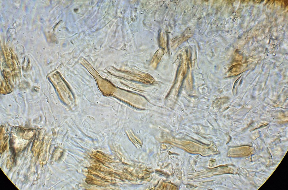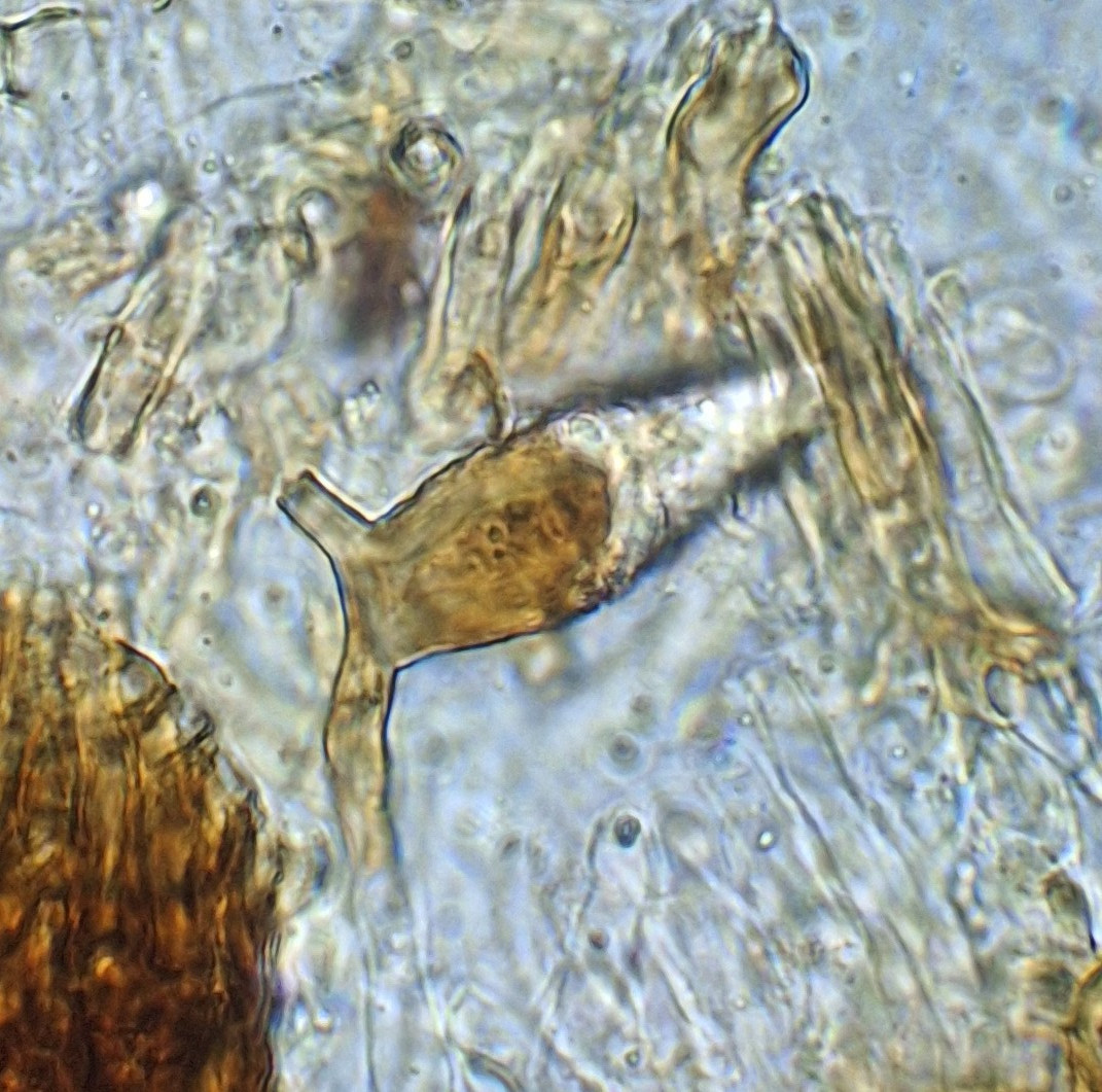 Die Sporen sind etwa 4,5*2 µm groß, ganz vereinzelt sind Basidien als solche zu erkennen, mit 4 Sterigmata. Schnallen habe ich keine gesehen.