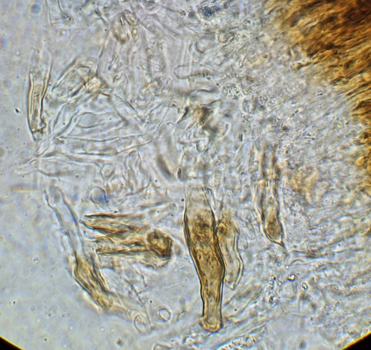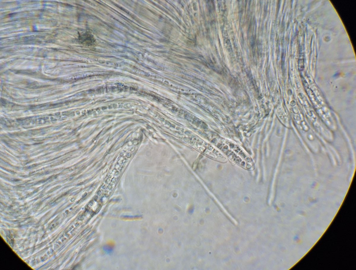 Es gibt Stränge verschiedener Stärken und auch langsam ausdünnende Hyphen, aber keine Verzweigungen, wo etwas Dünneres von einem Hauptstrang weggeht. Verzweigungen sind sowieso selten. Die Präparate dieses Exemplars neigen sehr zum Klumpen, diese Hälfte ist schon mehrfach freigepustet, und die gezeigten Stellen sind auch die mit den wenigsten Sporen