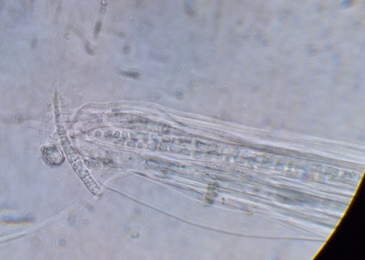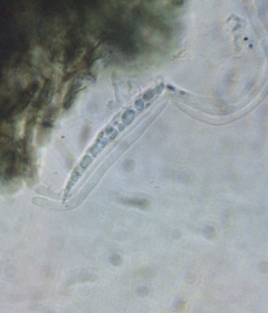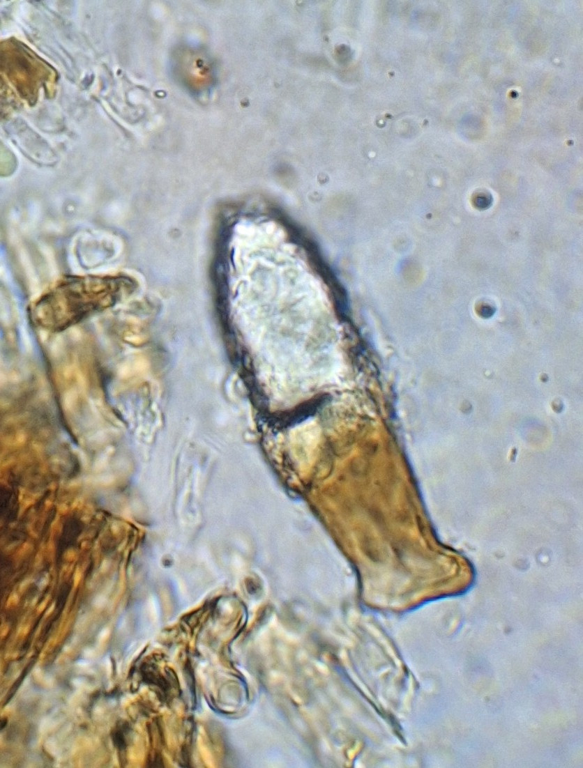 Das könnte ein Ascus sein mit länglichen Sporen drin, oder auch nicht. Freie Sporen waren nicht zu sehen