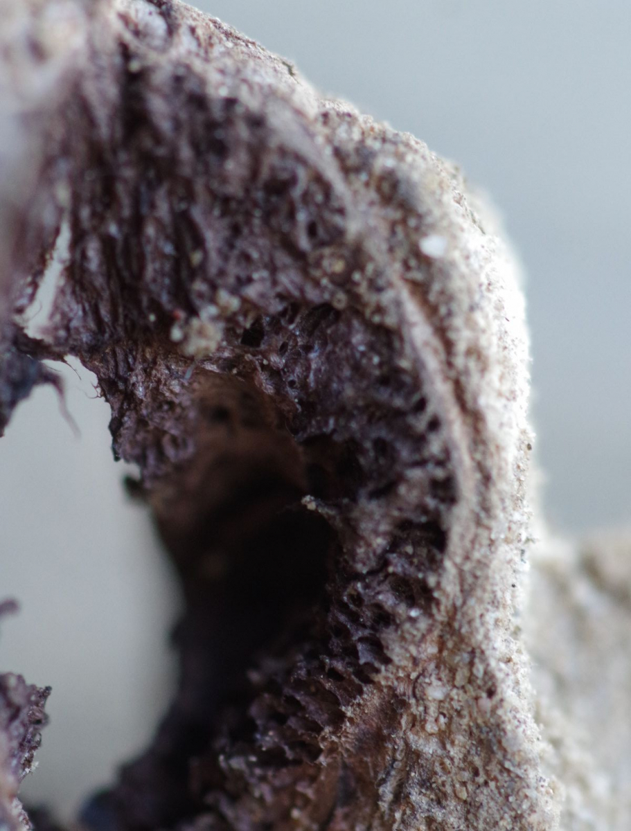 Mikromerkmale, sehr dunkel, keine Septen, Blasen, dicke Ränder ohne Unterbrechungen, teils außen mit angelagerten Kristallen