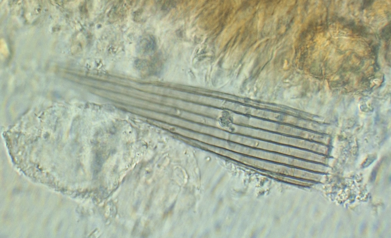 Sporen habe ich nur an einer Stelle gefunden, mit der Größe um 3 µm passt das aber zur erwarteten Art L. resinaria, und schließt eigentlich alle anderen aus.