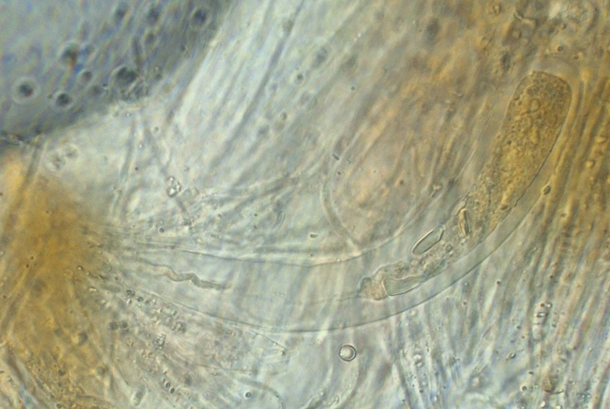 Die Cheilozystiden haben eine auffällige Form, teils mit kugelförmiger Spitze von 4-7 µm, die Länge kann ich selten erkennen, in den wenigen Fällen sind es 26-28 µm. Basidien wenigstens teilweise mit 4 Hörnern.