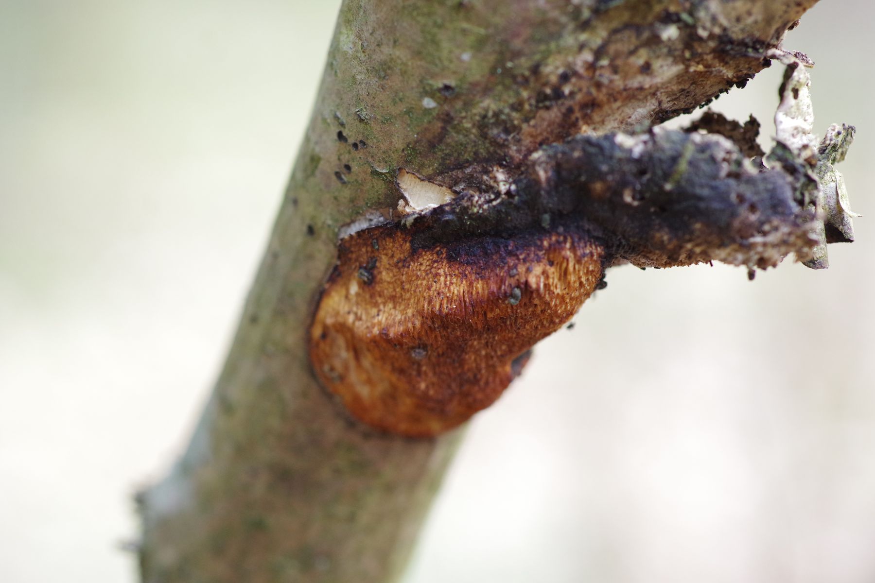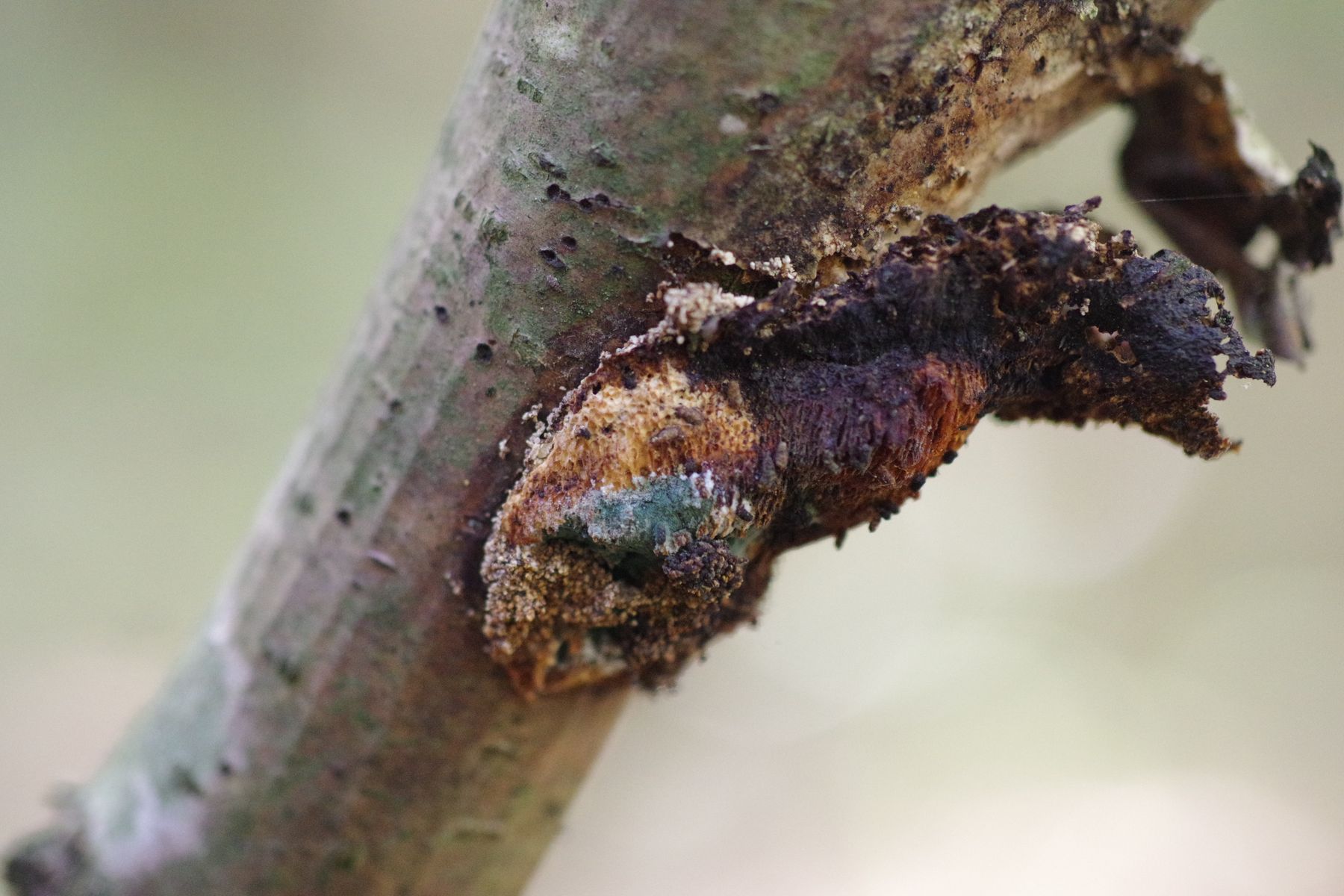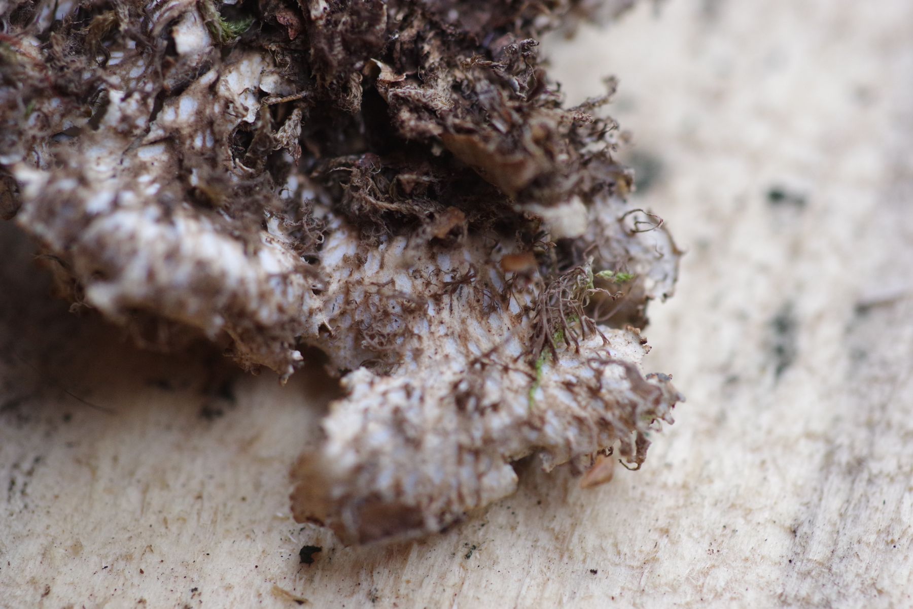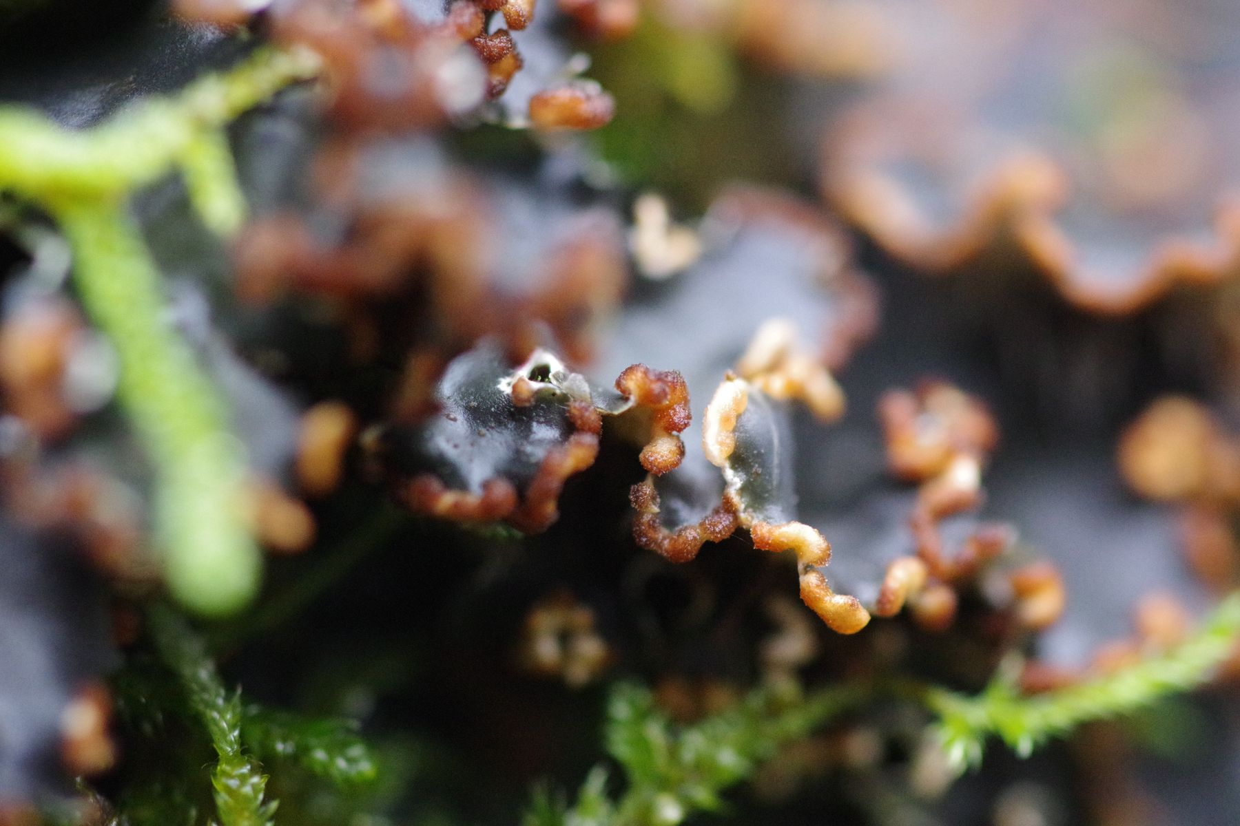 gestern konnte ich auf einer bemoosten, liegenden Esche eine Peltigera finden, die sich deutlich von der gleich daneben befindlichen P. praetextata unterschied. Die Lappen nur etwa halb so groß, keine Isidien auf der Oberfläche, keine Apothecien trotz erheblicher Ausdehnung, Knubbel an den Lappenkanten, die ich als Bortensorale ansehe. allerdings sind die nicht grau, wie in der Literatur meist angegeben und auch nicht durchgehend. Unterseits sind die Adern erkennbar, aber nicht sehr erhaben und ockerfarben. Die Rhizinen sind einfach, bis 4...5 mm lang.