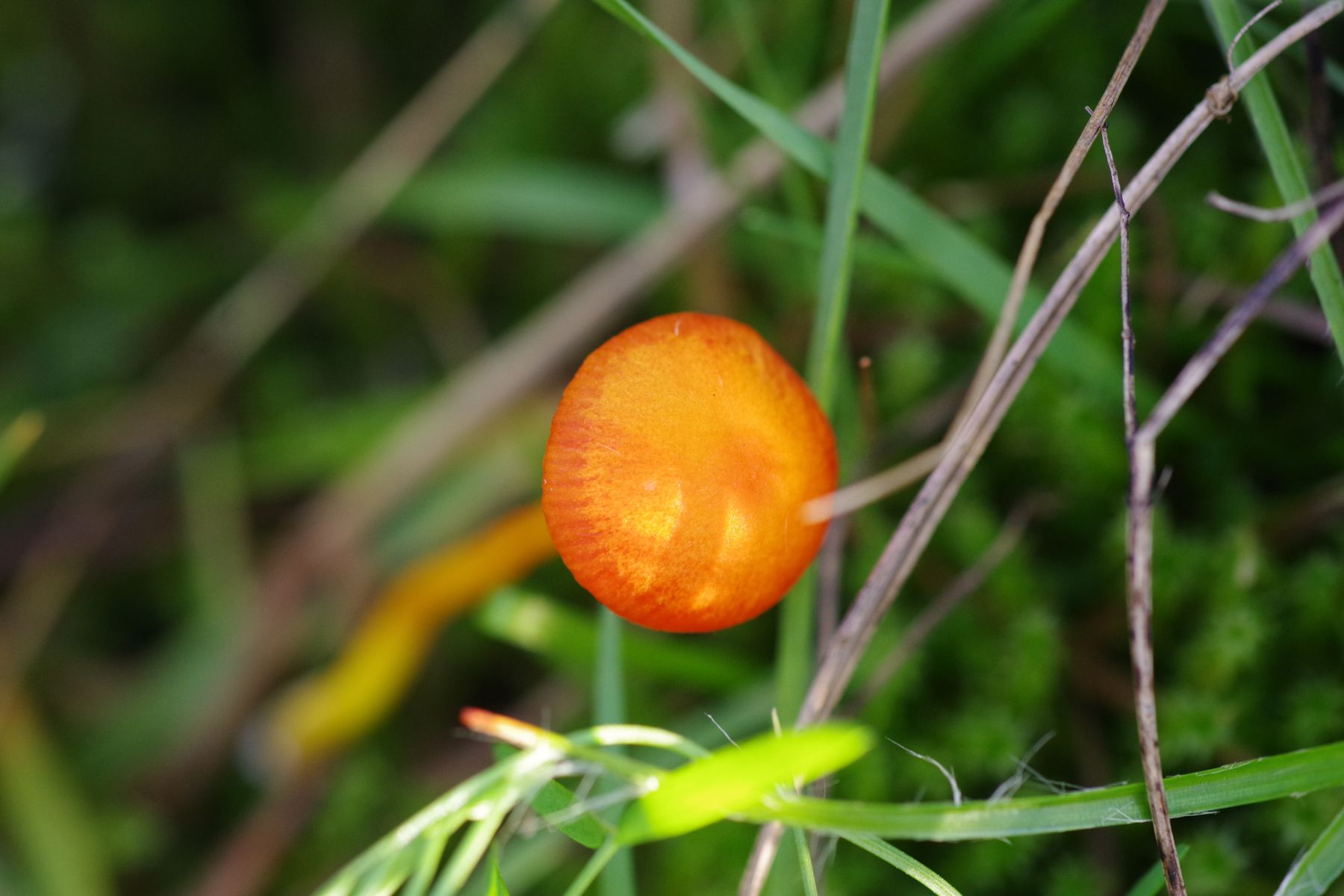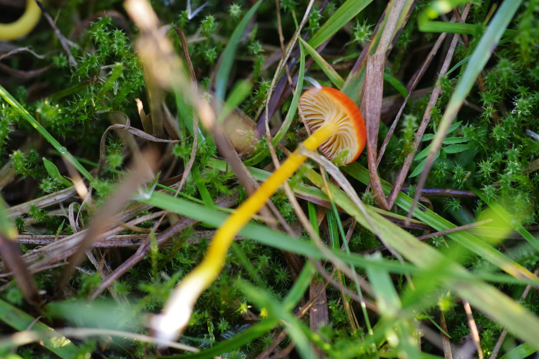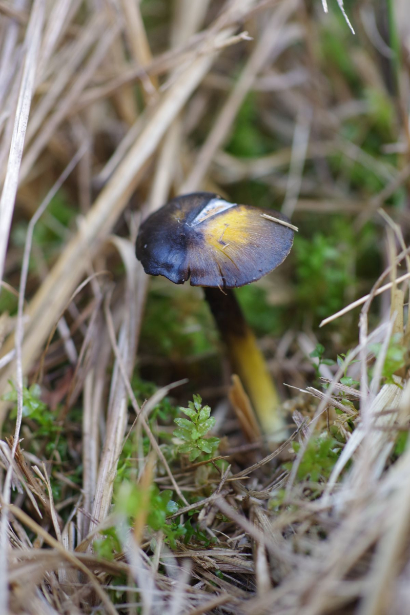 2) dann ein ziemlich großer Saftling, der aussieht, als ob er schwärzen müsste, stattdessen aber heller wird, 1 älteres Exemplar, die kleinen Gelben mit dem sehr langen&spitzen Hut gehören vielleicht dazu