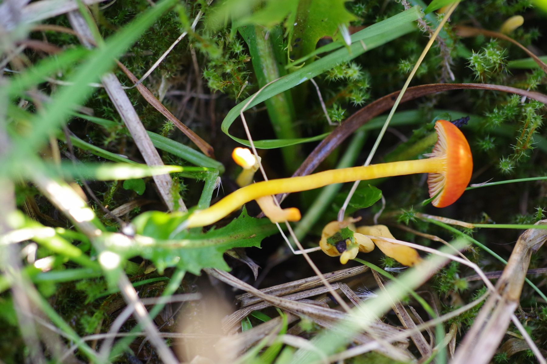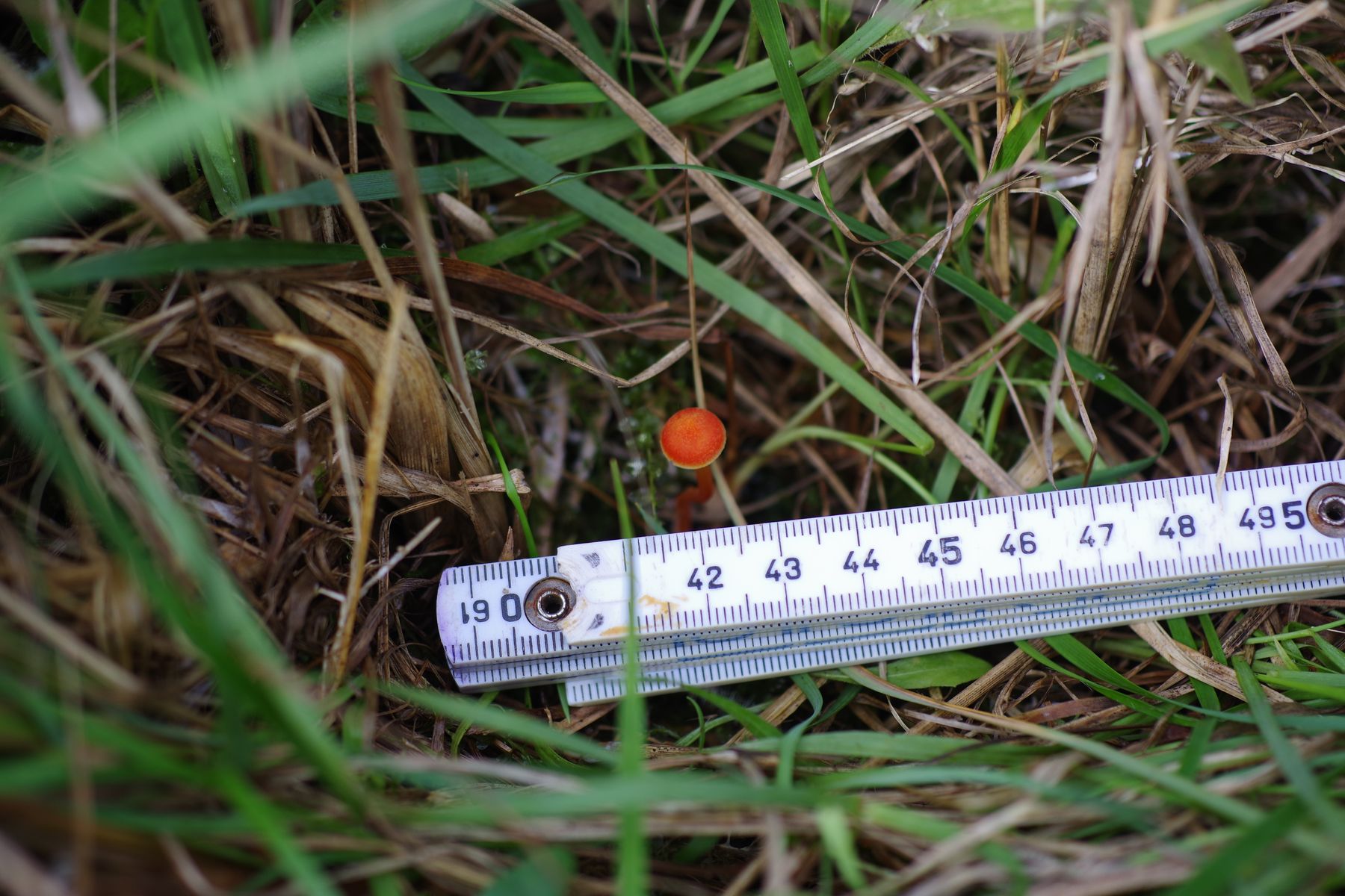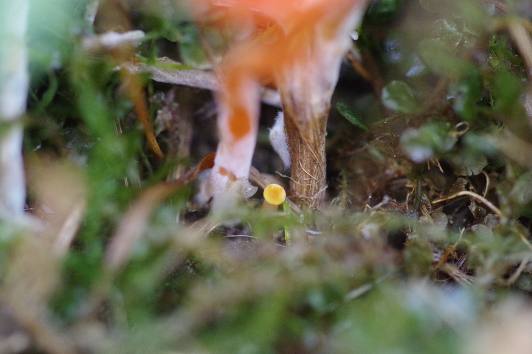 1) eine gestielte sehr schlanke sattgelbe Keule, vielleicht in Richtung Clavaria flavipes oder Clavaria flavostellifera, die 2015 beschrieben wurde. Die scheinen erst zu kommen, aktuell sehr winzig und schwer ranzukommen, ohne die zu beschädigen. Beim nächsten Termin muss die Pinzette mit.
