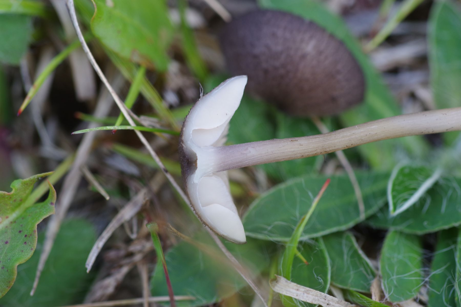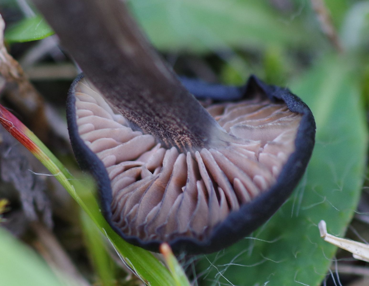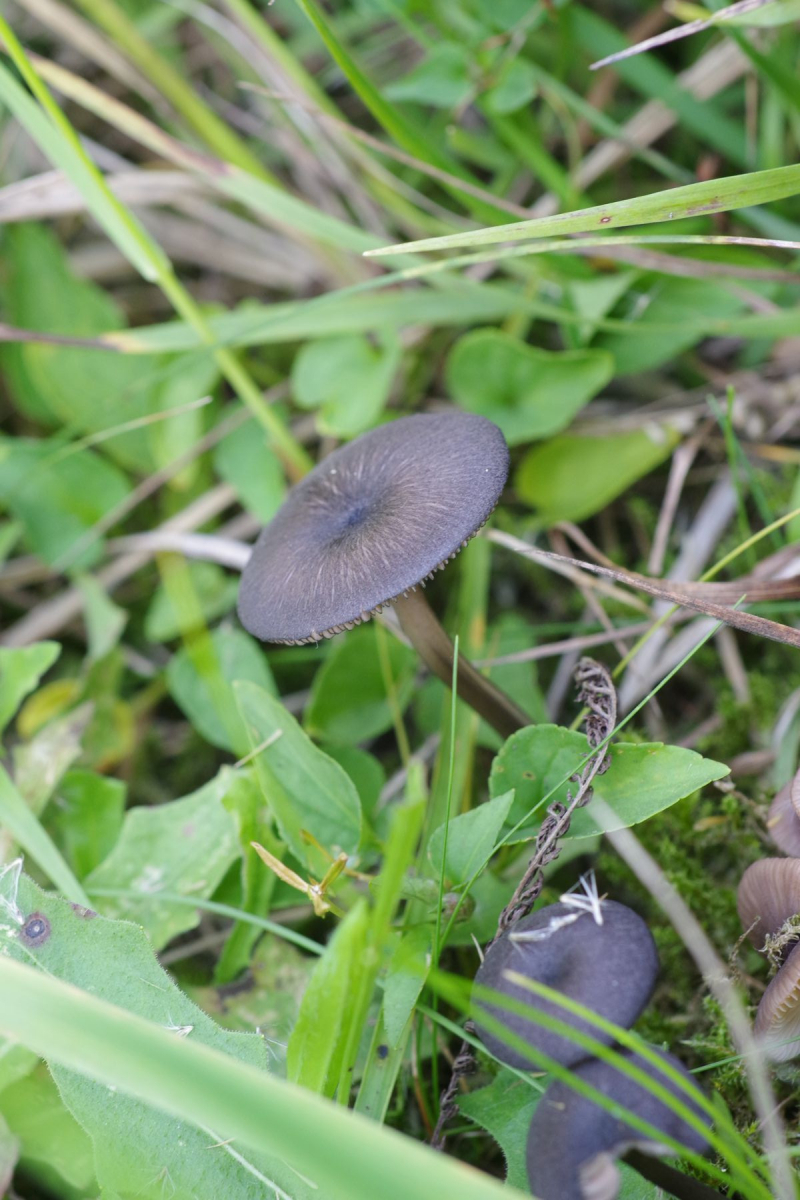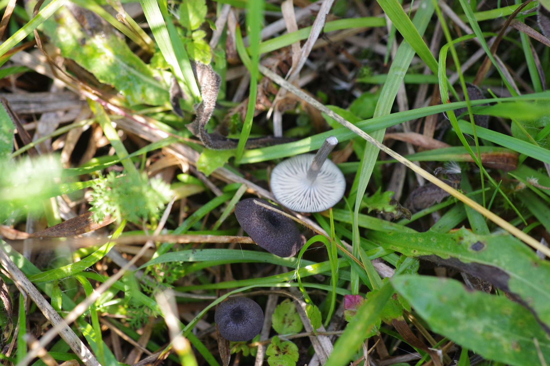 11) dunkelbraun-schwarz, matt, weiße Lamellen, heller Stiel mit bestenfalls leichtem Blauton am Hut