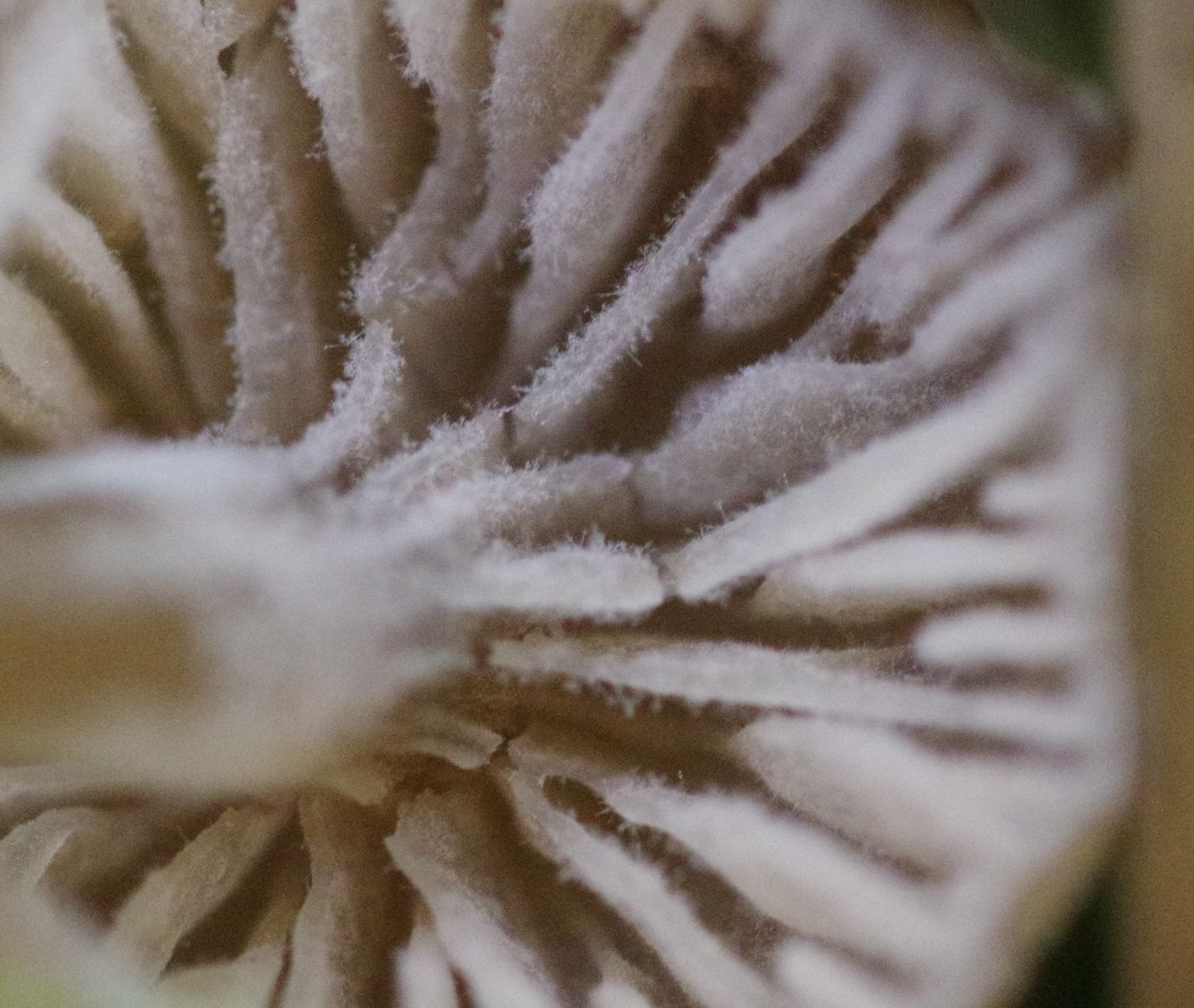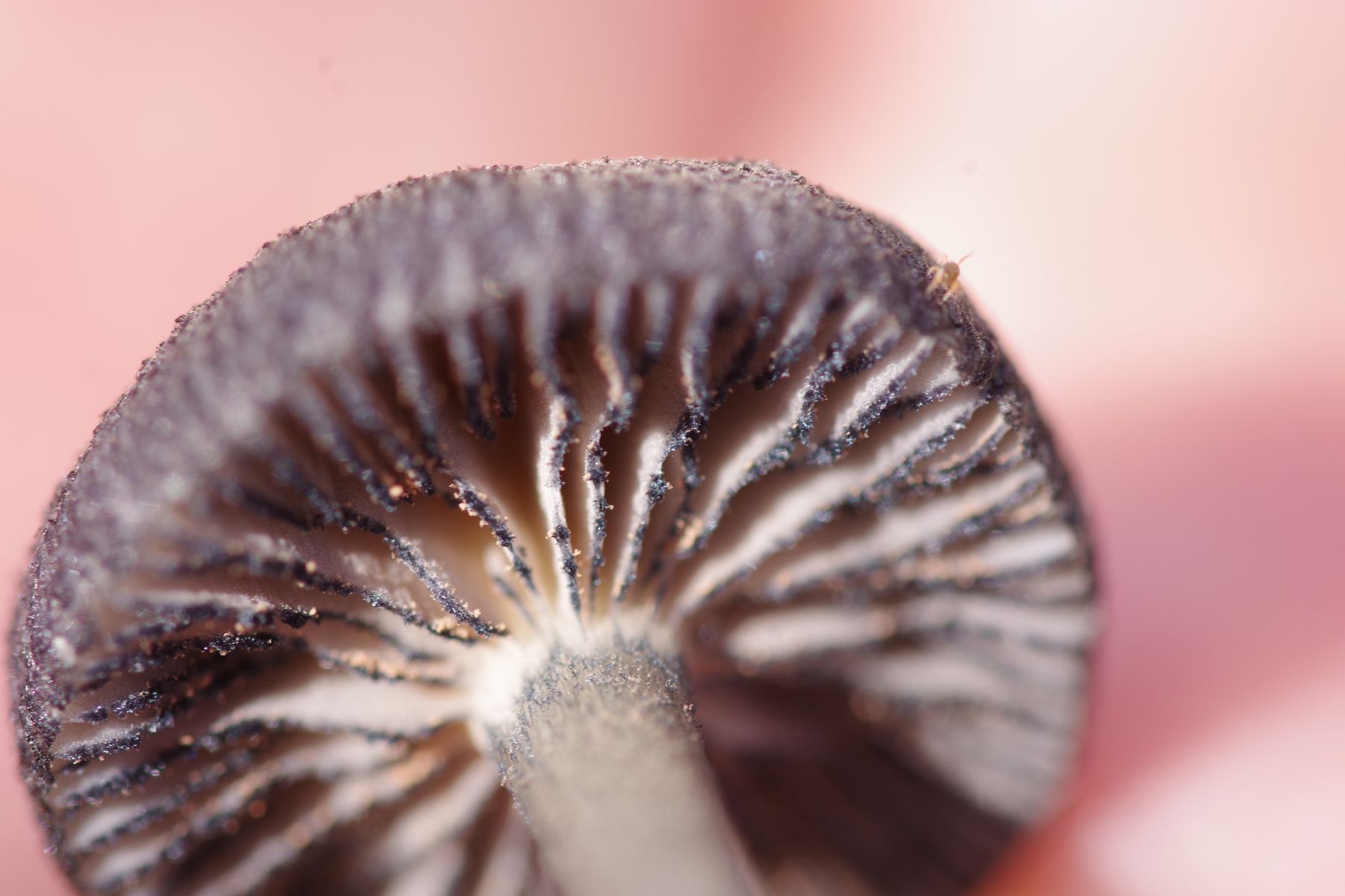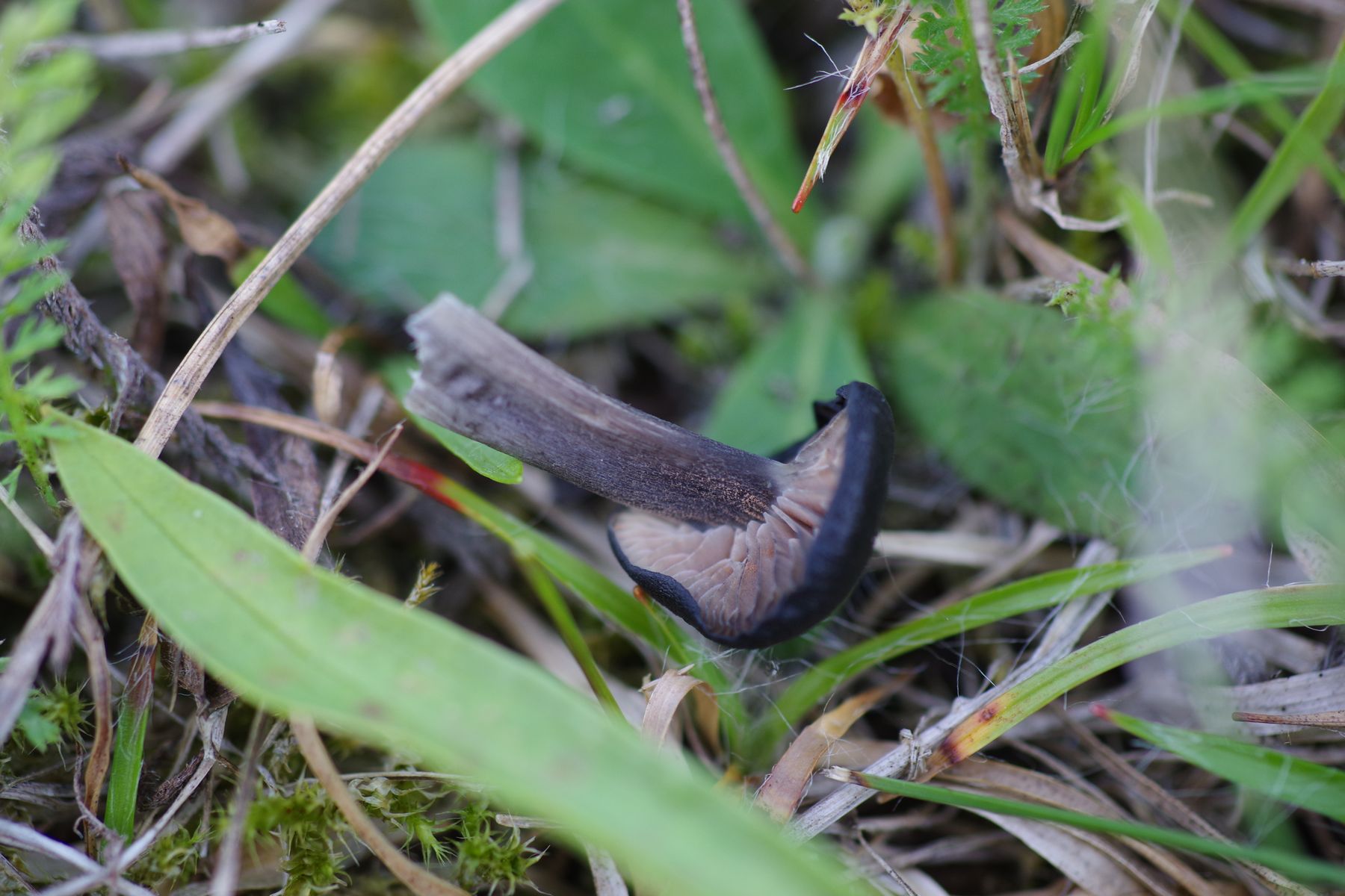 11) dunkelbraun-schwarz, matt, weiße Lamellen, heller Stiel mit bestenfalls leichtem Blauton am Hut