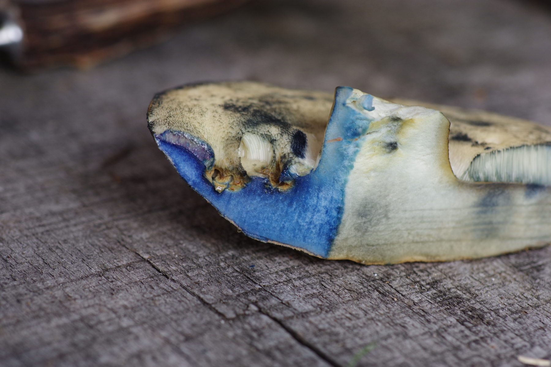 12) eine auffälig langstielige Entoloma mit blauen Lamellenkanten