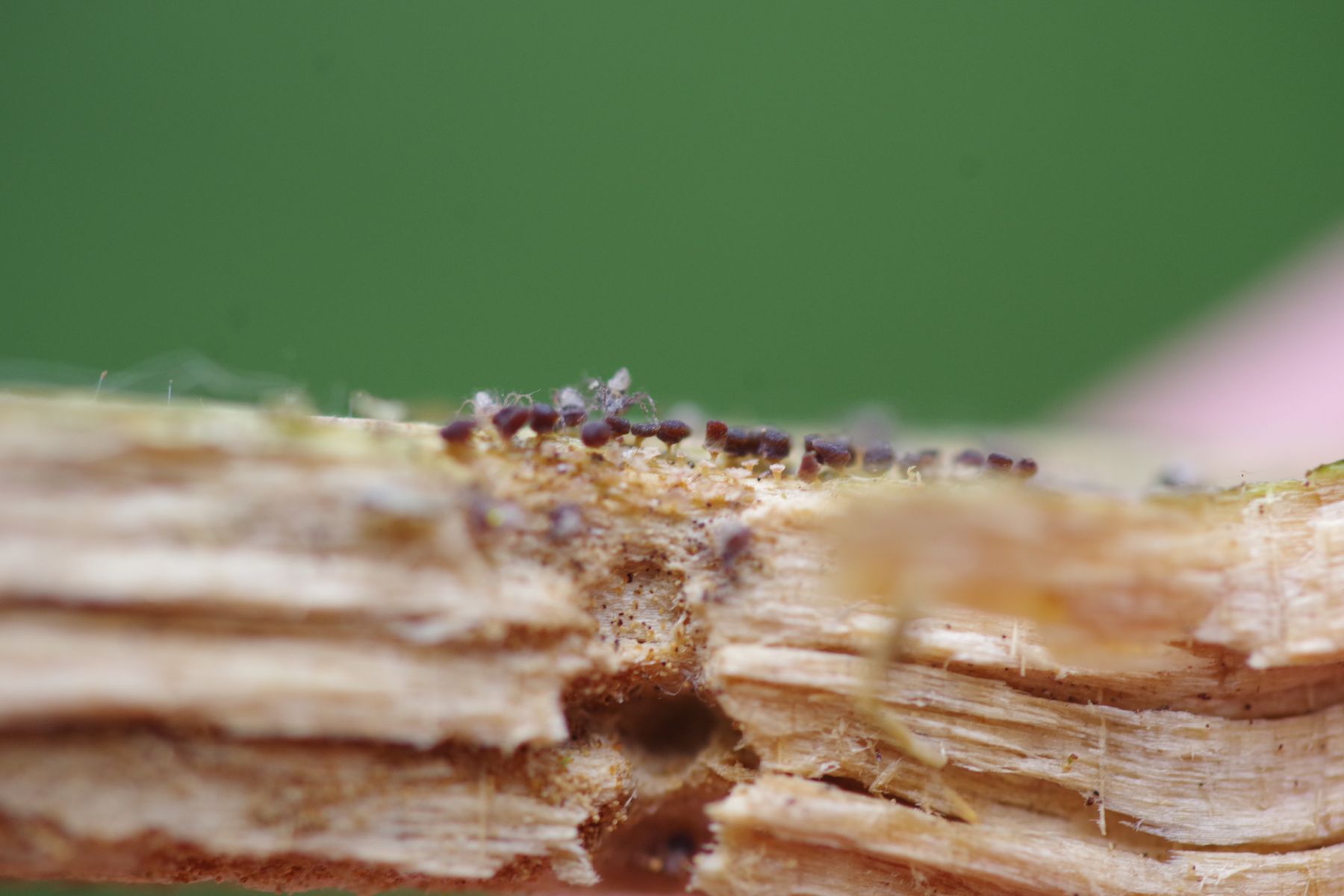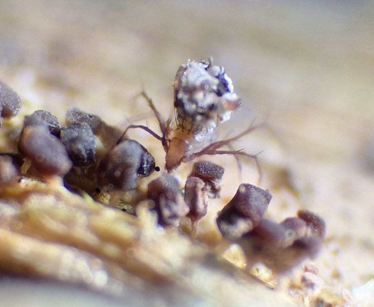 Mangels Stacking ist auf den Auflichtfotos auch nicht viel mehr zu erkennen. Immerhin kann man messen, hoch bis max. 1 mm, die breitesten Köpfchen sind 0,4 mm breit.