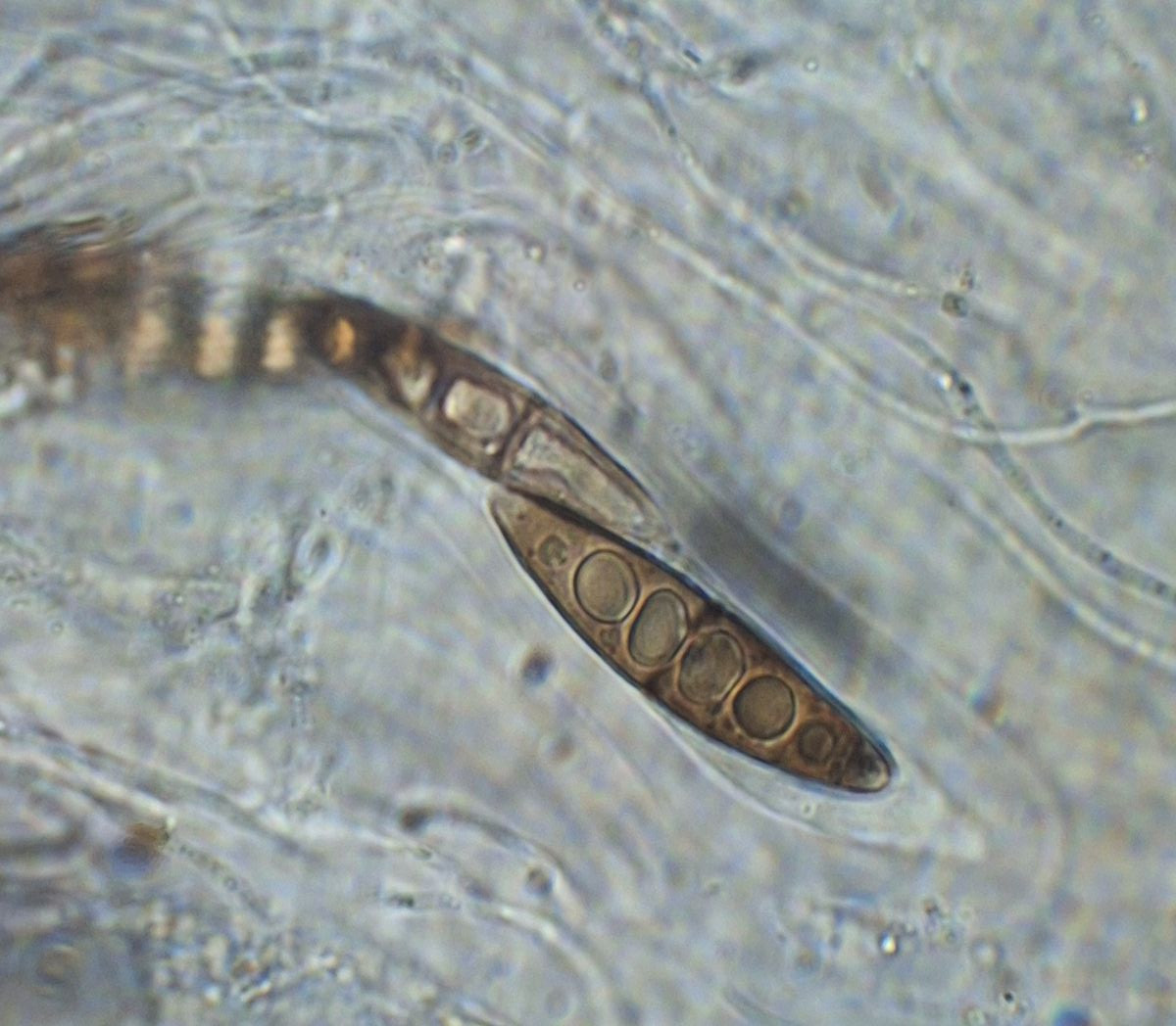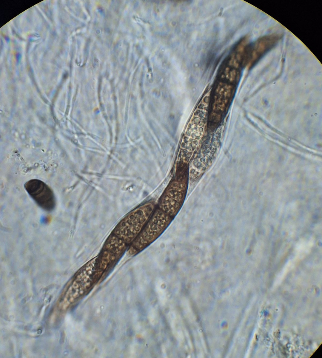 Unterm Mikroskop ist es mir nicht gelungen, Asci zu separieren und sauber abzubilden. Nach dem wass man erahnen kann, sind sie etwa 40-45 mm lang. Die Sporen sind nicht separiert, hellbraun, glatt, länglich
