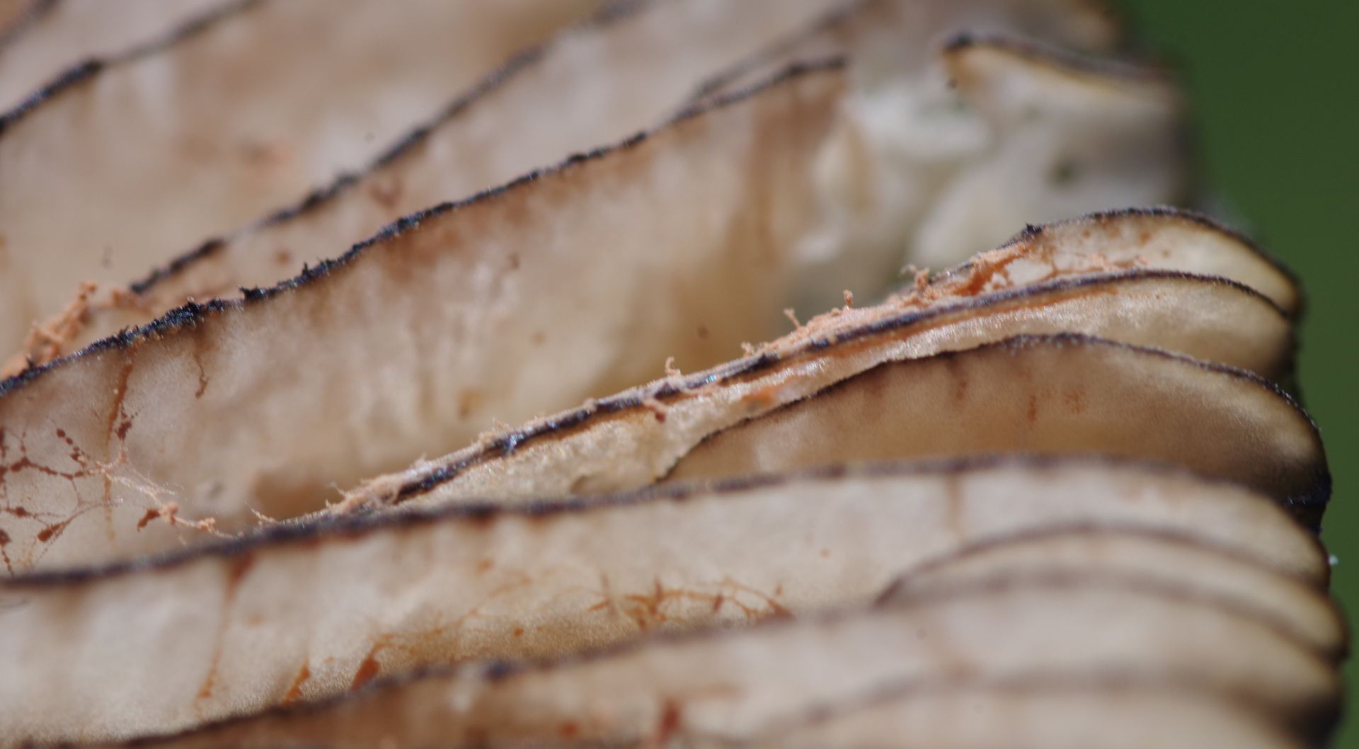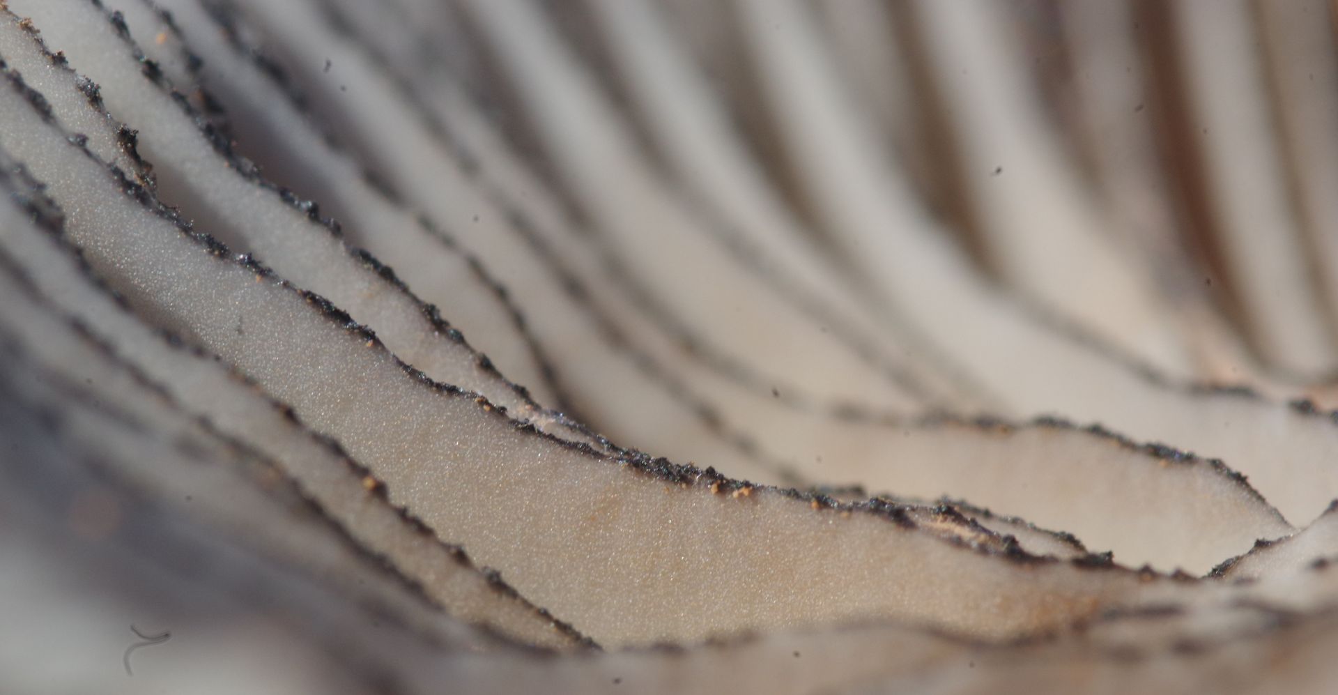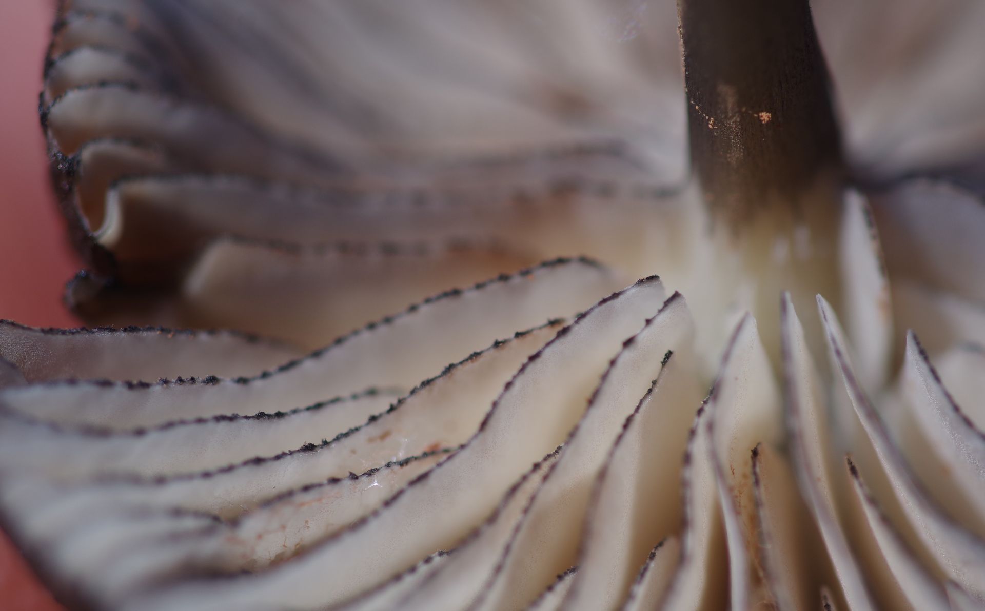 und mit reifen Sporenansammlungen, die die Lamellenkante rötlich färbt