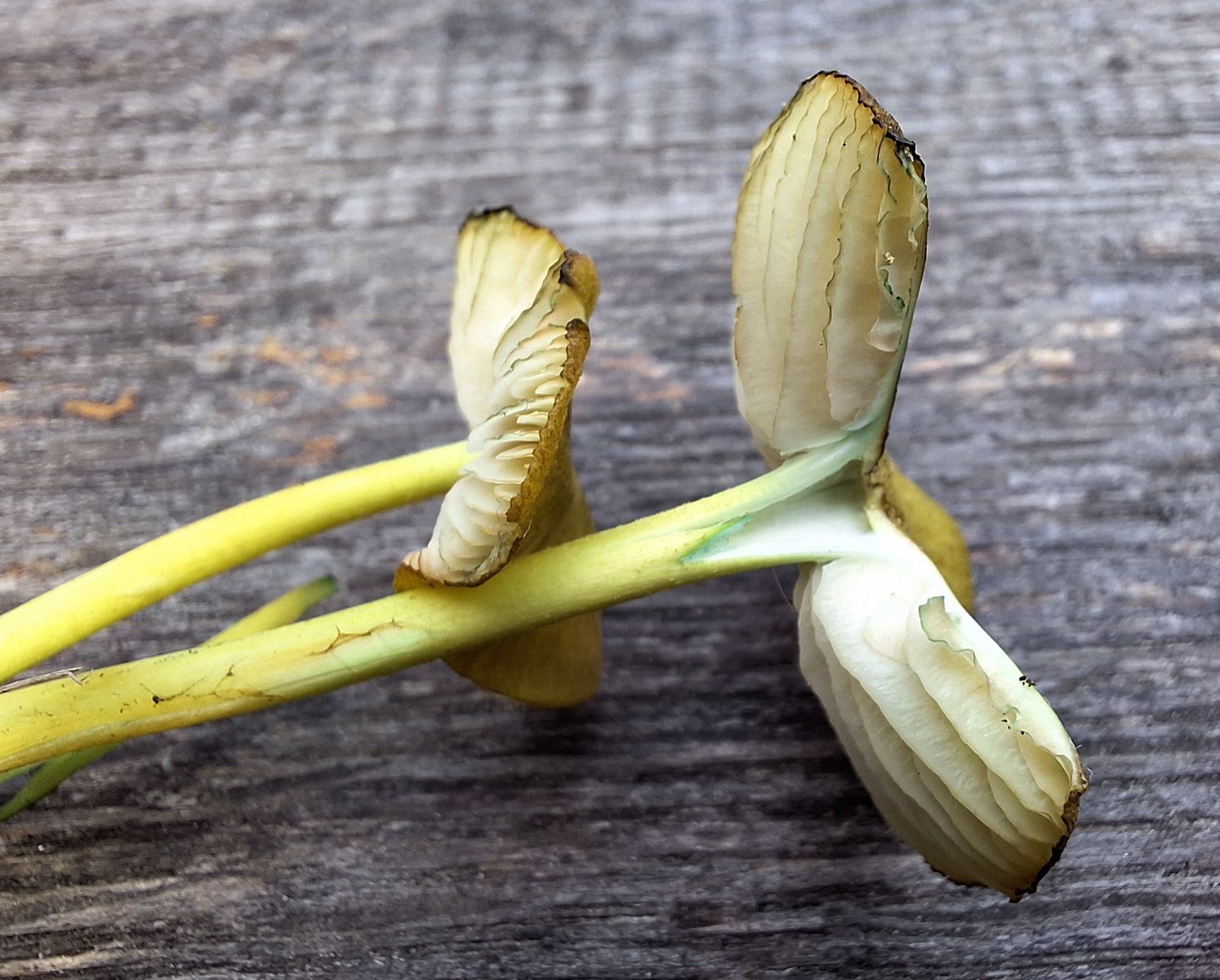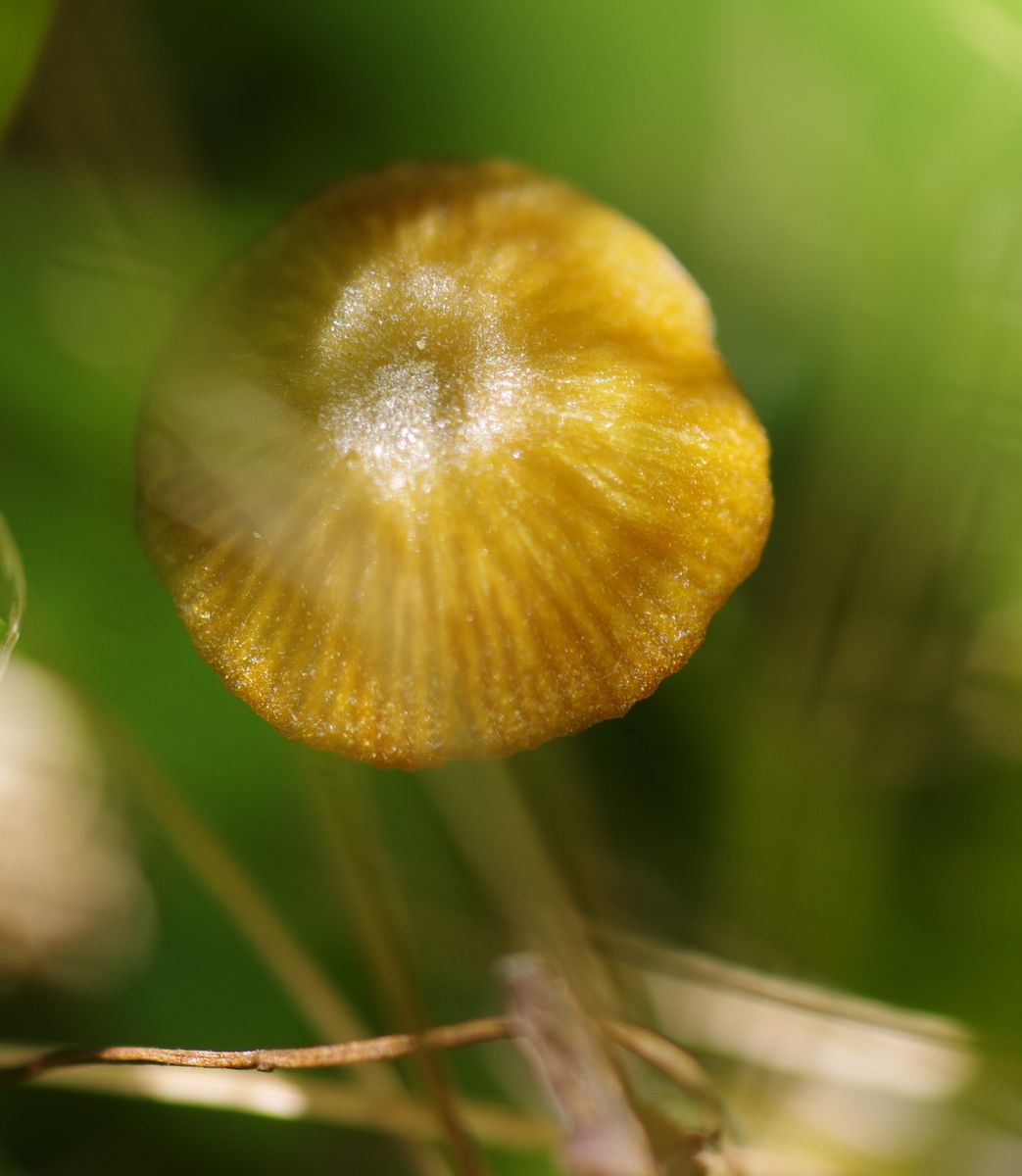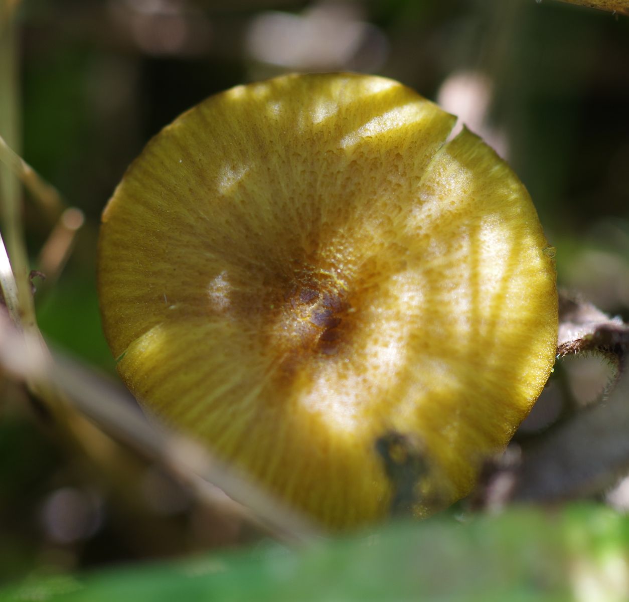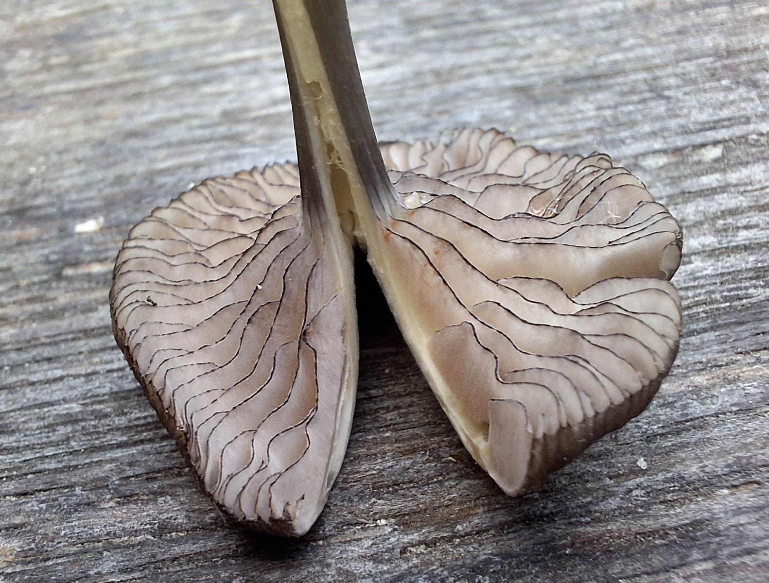 und mit reifen Sporenansammlungen, die die Lamellenkante rötlich färbt