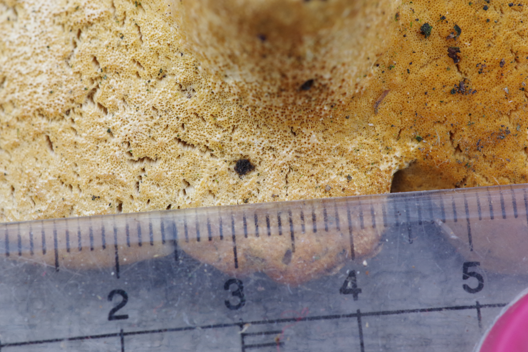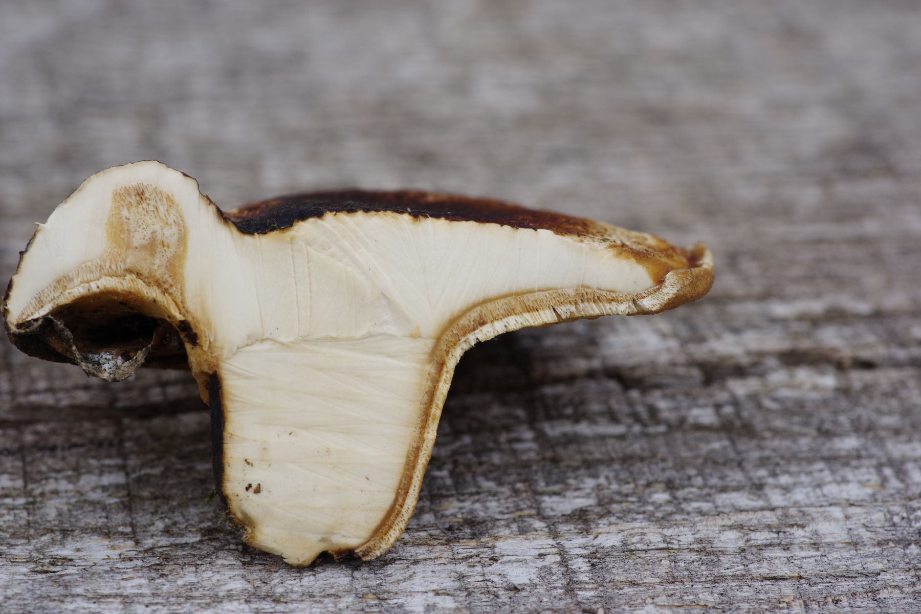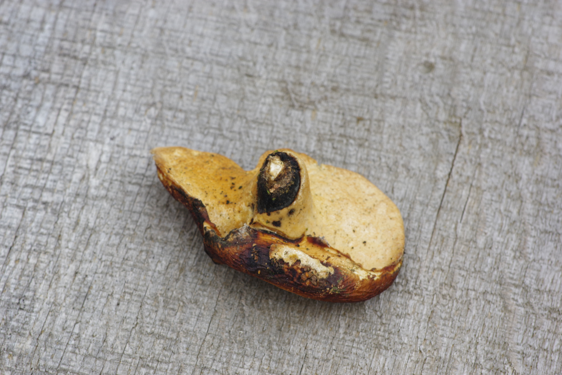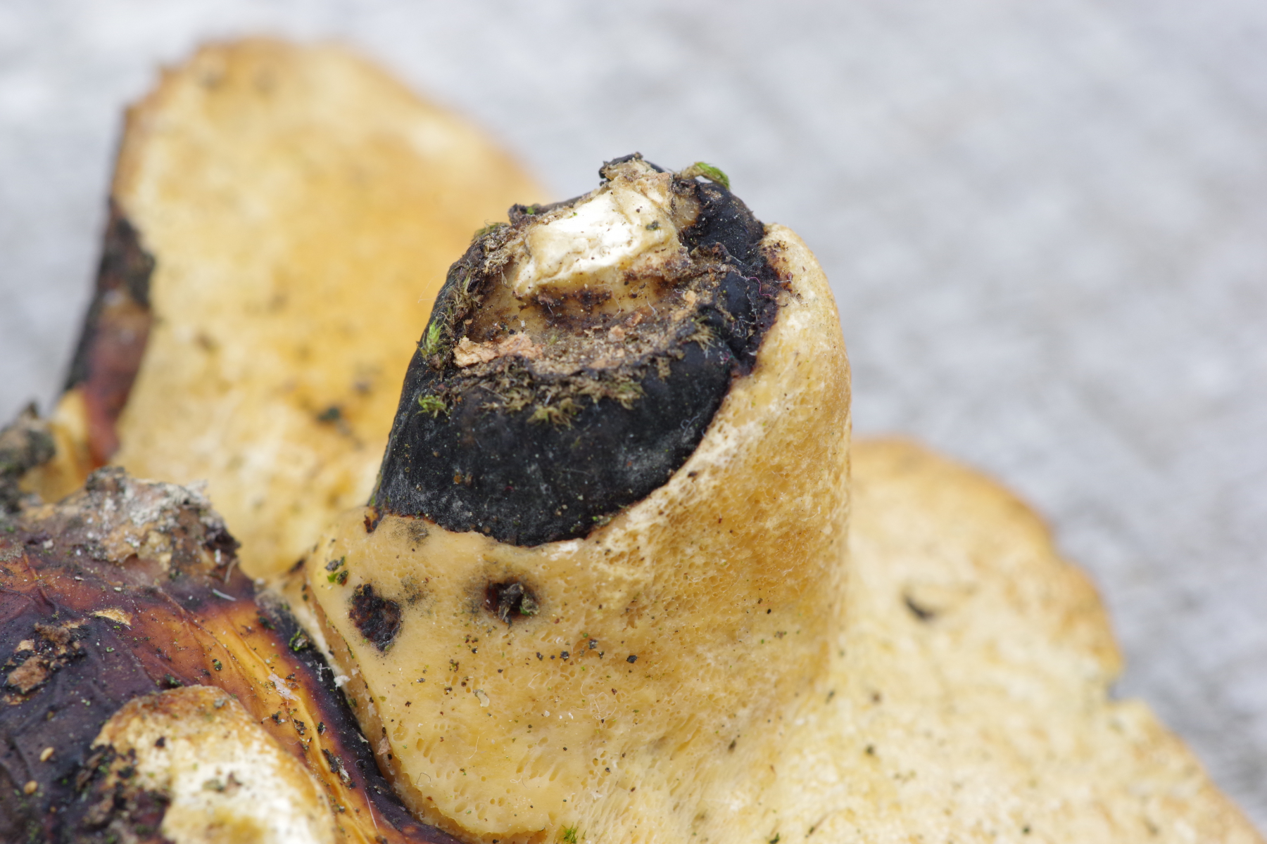 (2c) Ein Polyporus mit schwarzem Stiel, sehr engen Poren und hellem ockerfarbigen Hut, evtl. P. leptocephalus