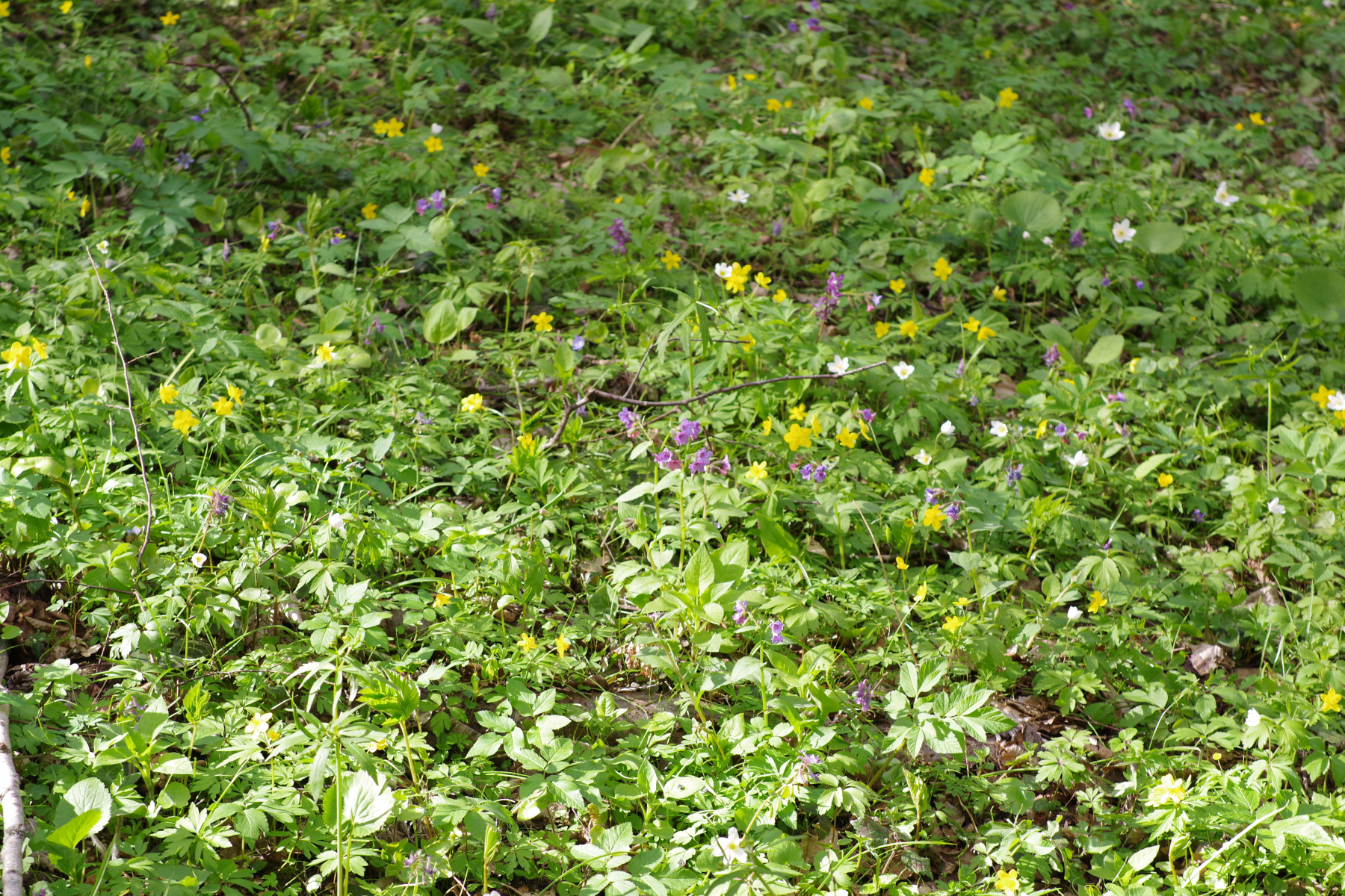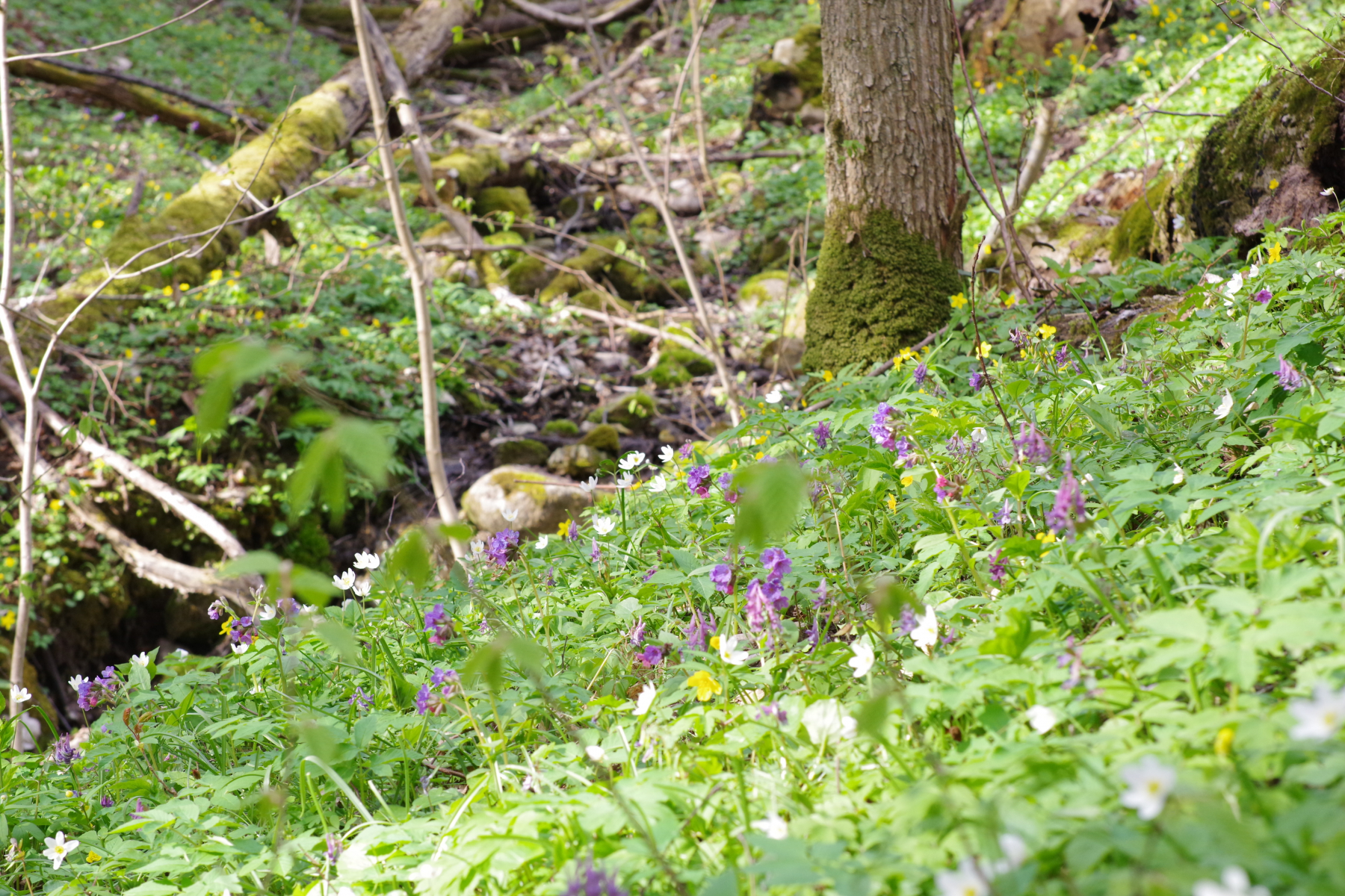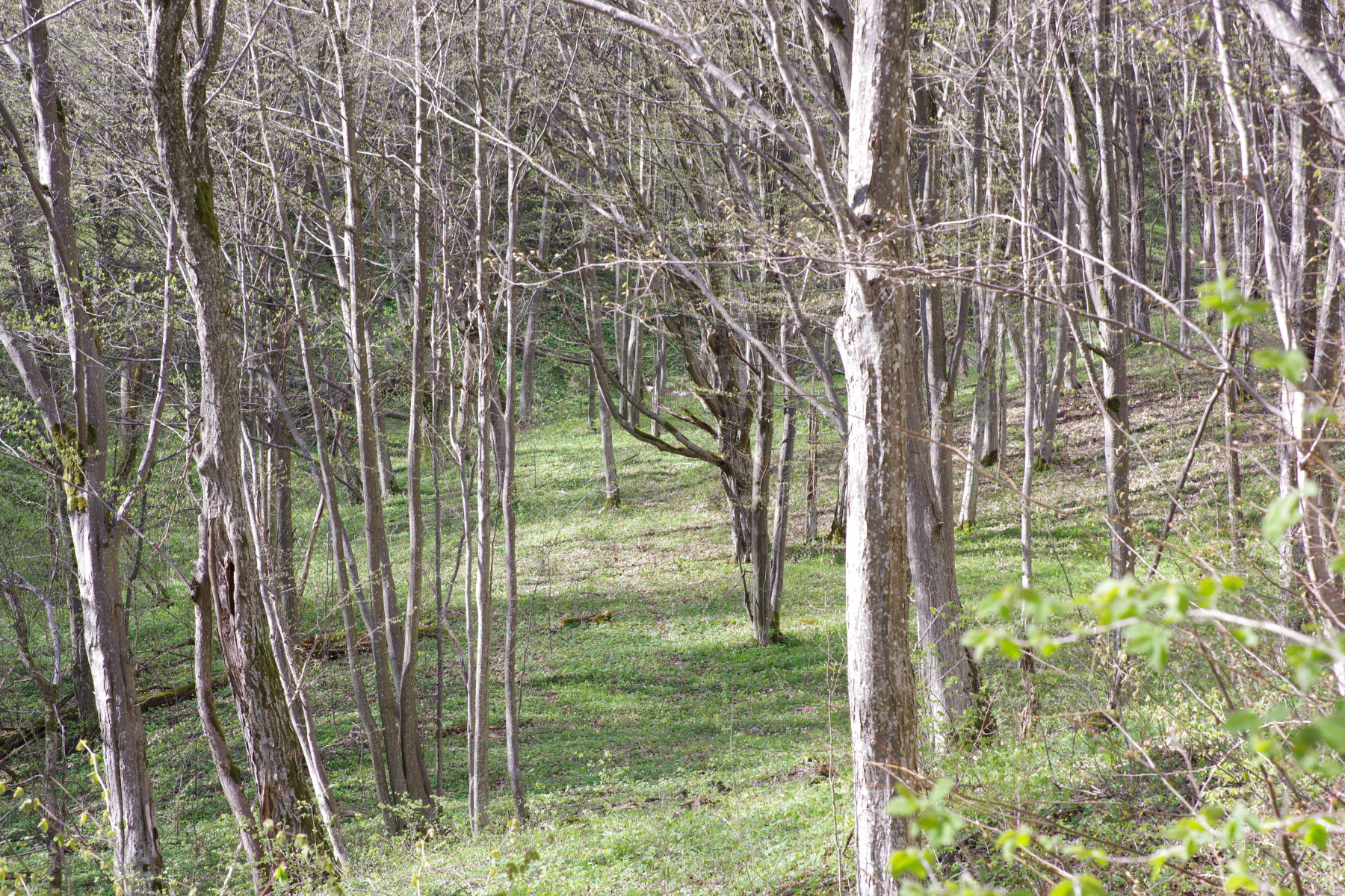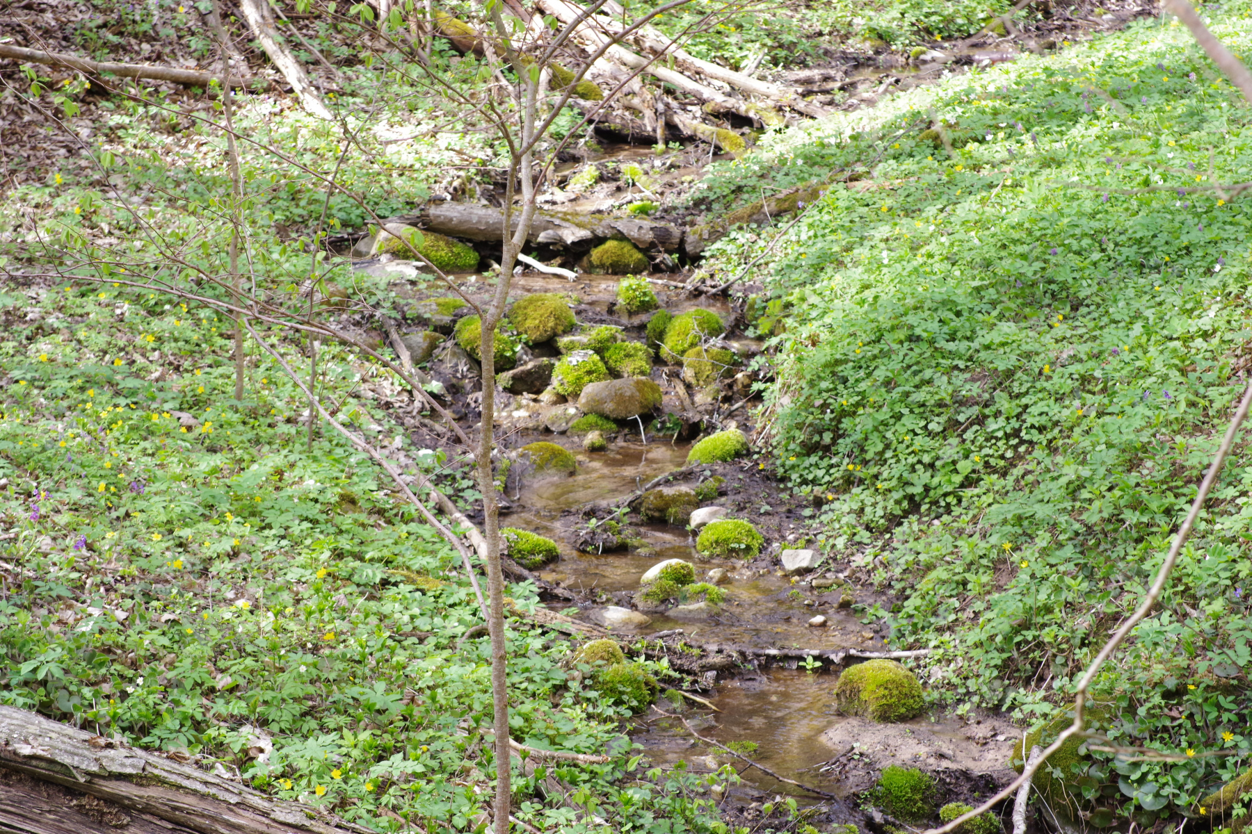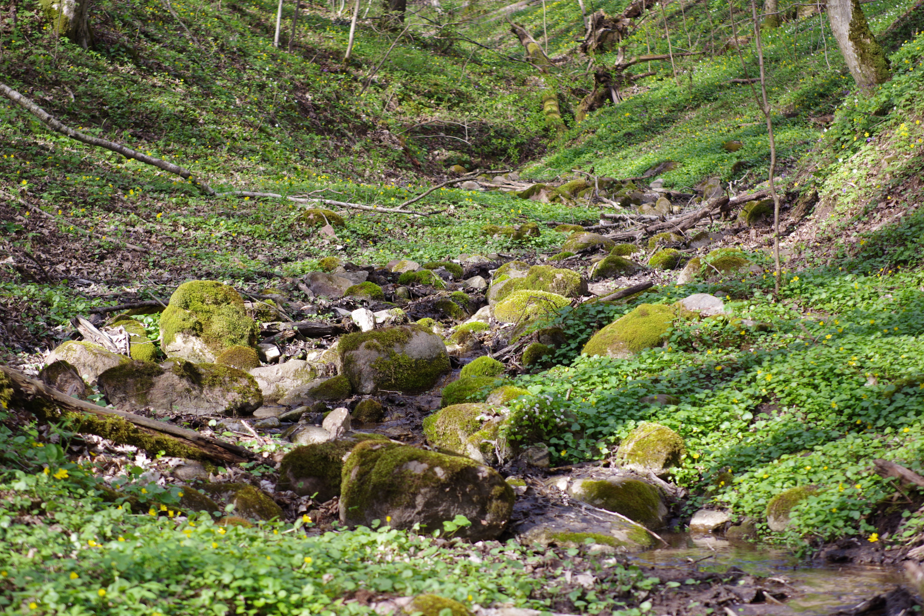 (1) Überwiegend Hainbuche mit einzelnen etwas älteren Eichen, anscheinend Privatwald, parkähnlich aufgeräumt, mit dem Kraut in voller Blüte und dem Bächlein sehr schick