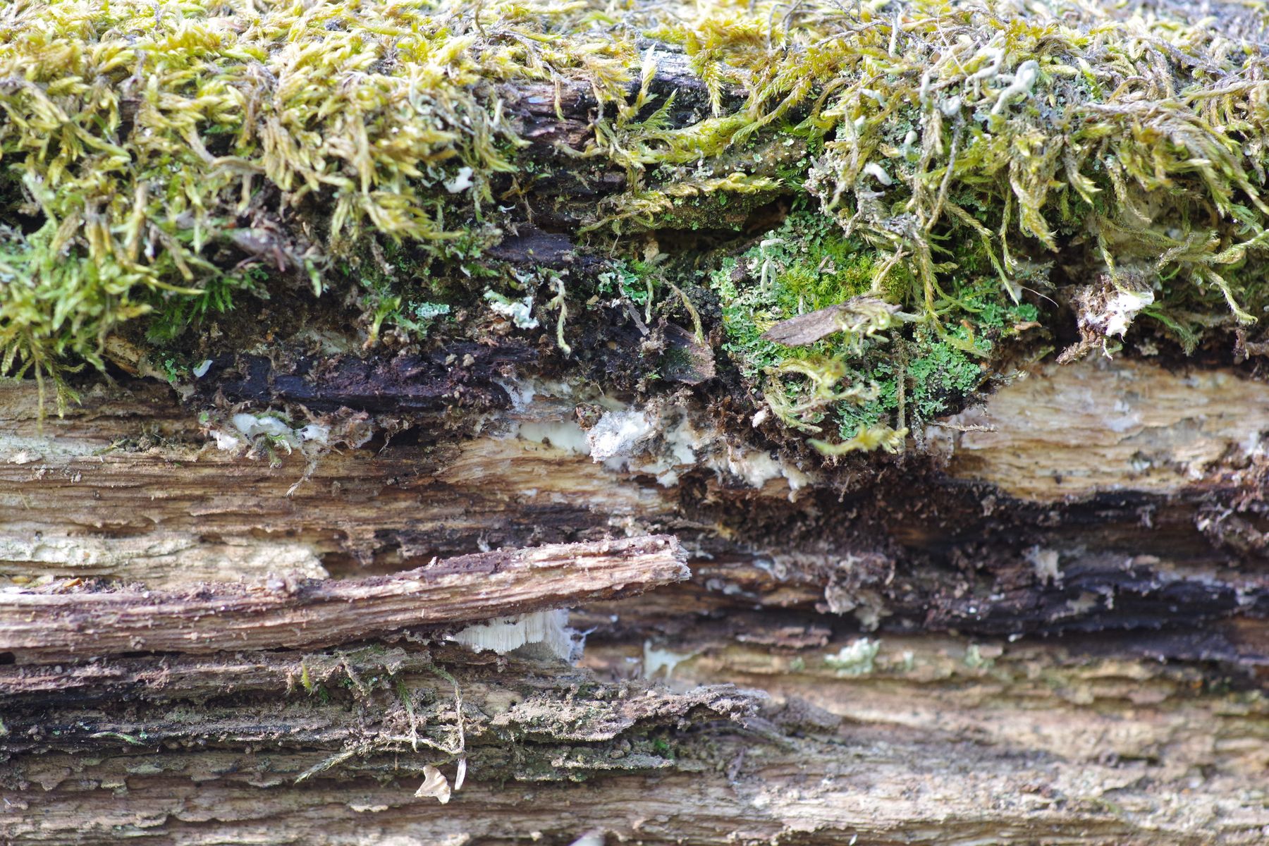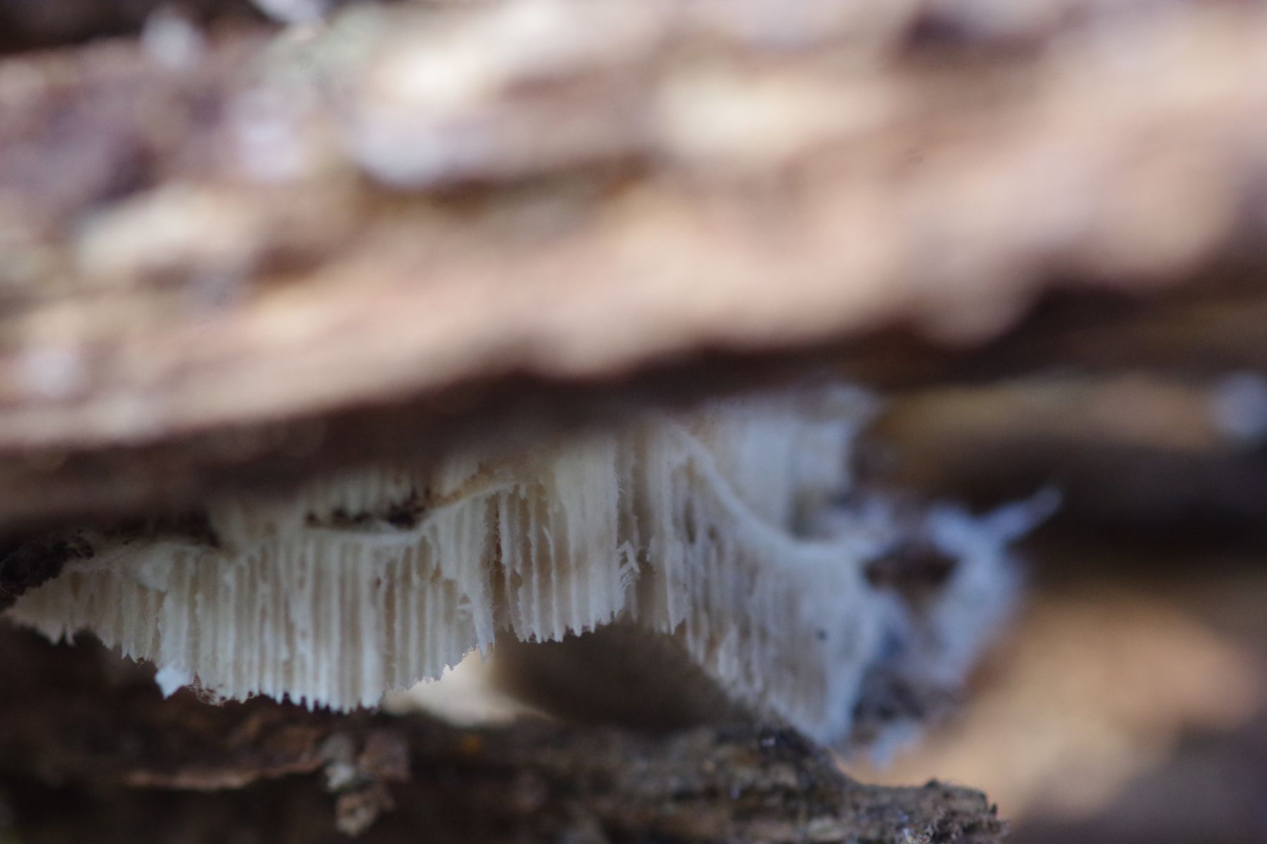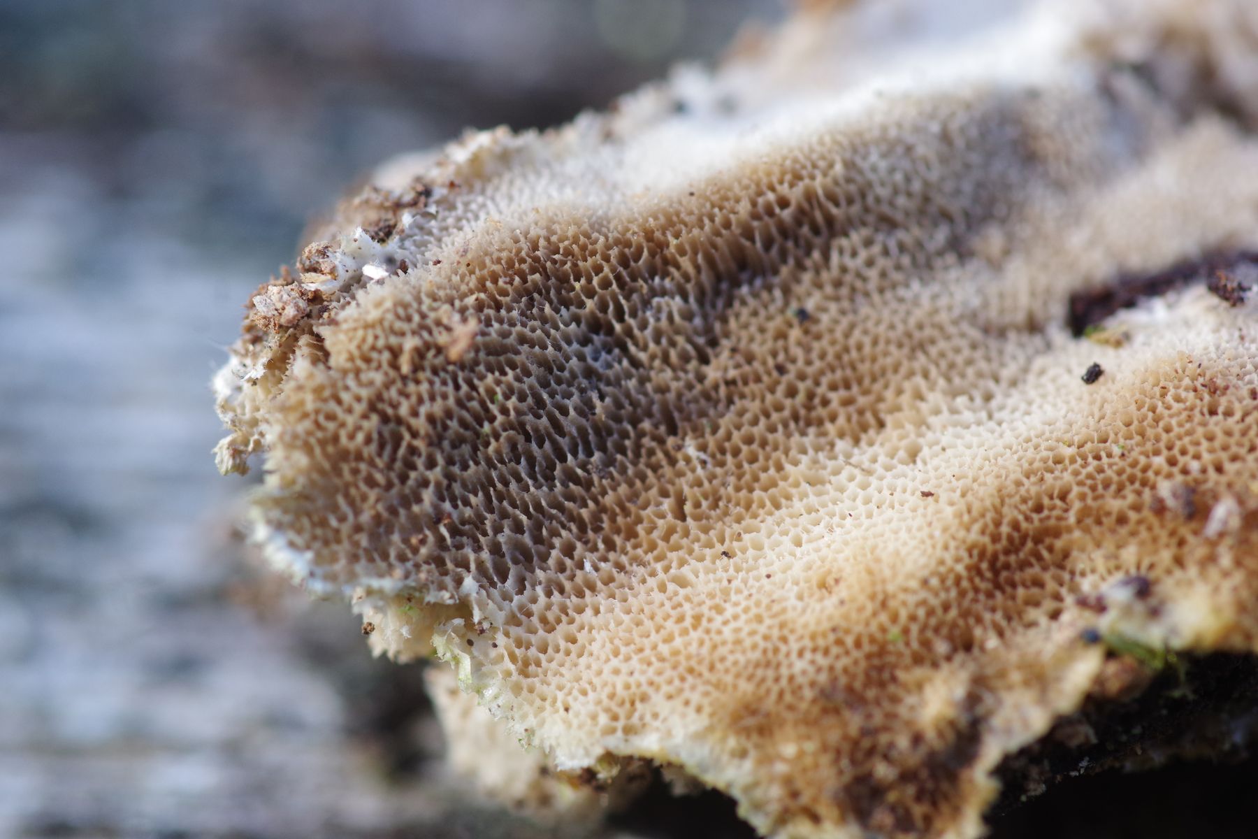 an einem liegenden Eichenstück habe ich überraschenderweise unter dem Moos einen weißen Porling entdeckt. Der war vor dem Abnehmen des Mooses nicht zu sehen. Knapp 2 Poren je mm. Eine Oberseite kann ich nicht erkennen. Die Röhren, bis 3 mm Länge, sehen aus, als wären sie mehrschichtig.