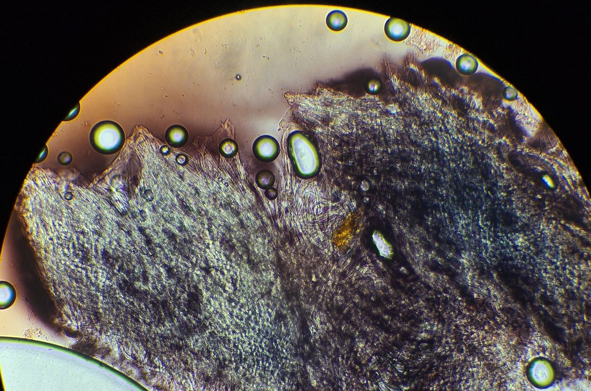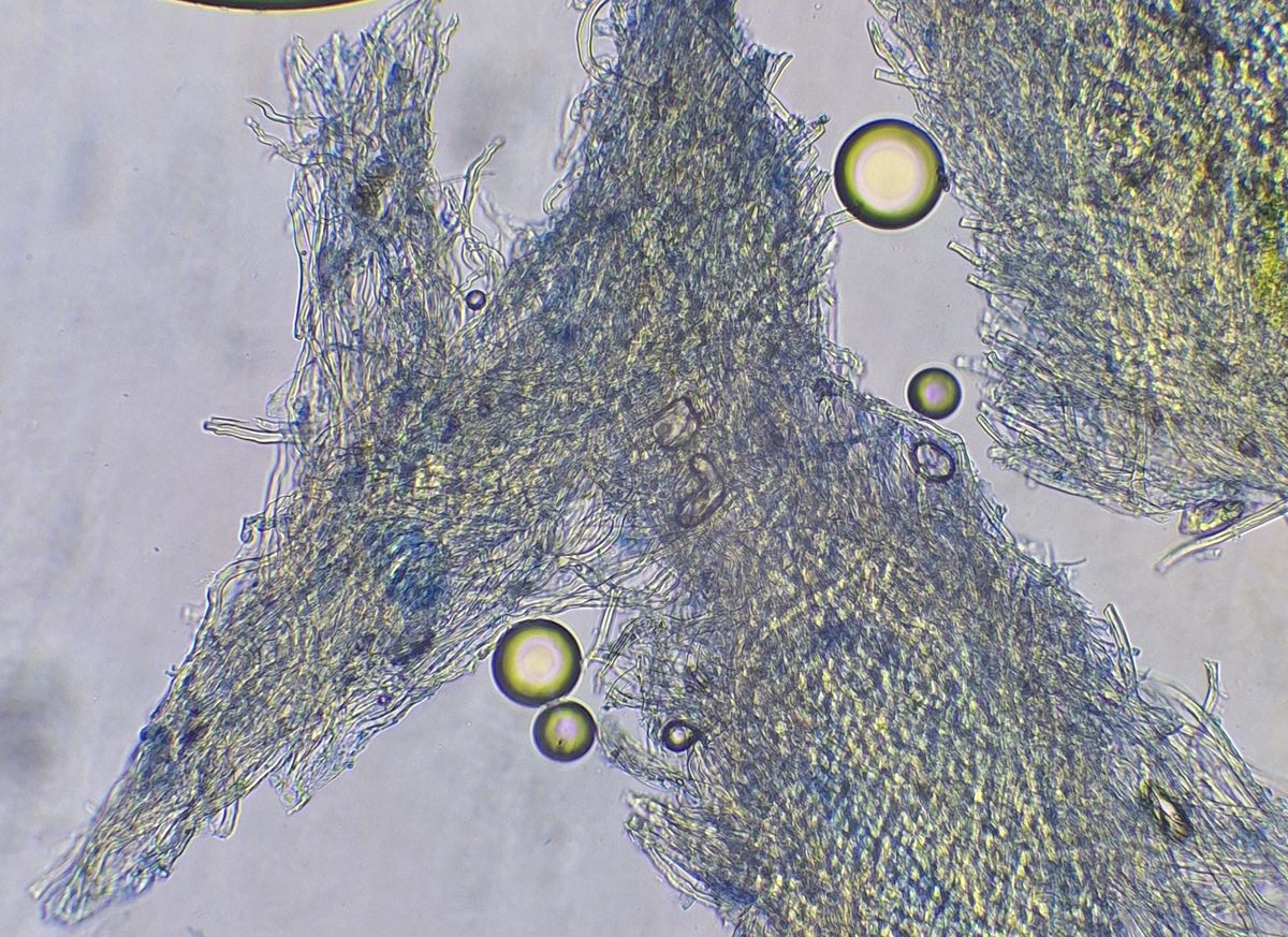 Mikroskopisch kann ich nicht viel erkennen. Nur eine Art von Hyphen, keine Septen, keine Schnallen. Basidien sehe ich aber auch nicht.