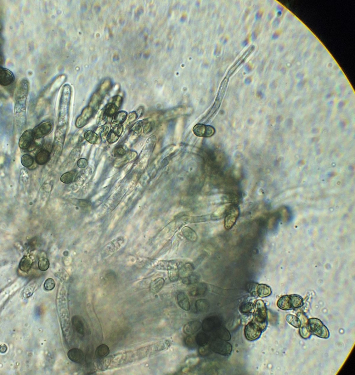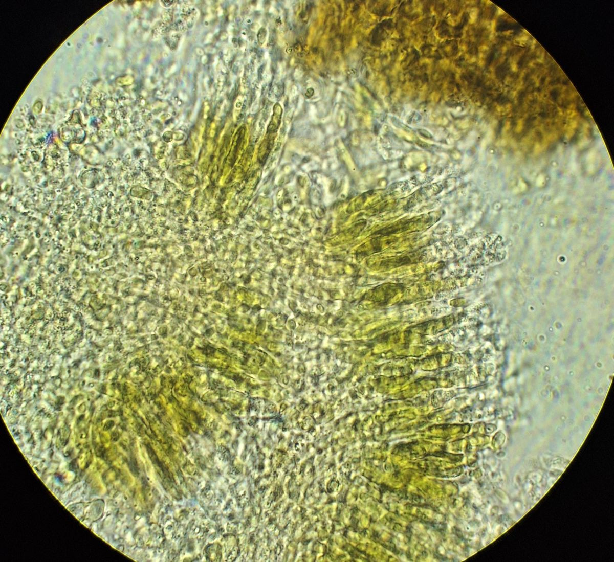 Mikroskopisch ist nicht viel zu sehen, nur vereinzelt Sporen, ca. 5*2 µm. Allerdings fällt es mir sehr schwer, die ohne Stereolupe auszuwählen und unters Mikroskop zu bringen und bisher hatte iich anscheinend nur überreife Exemplare.