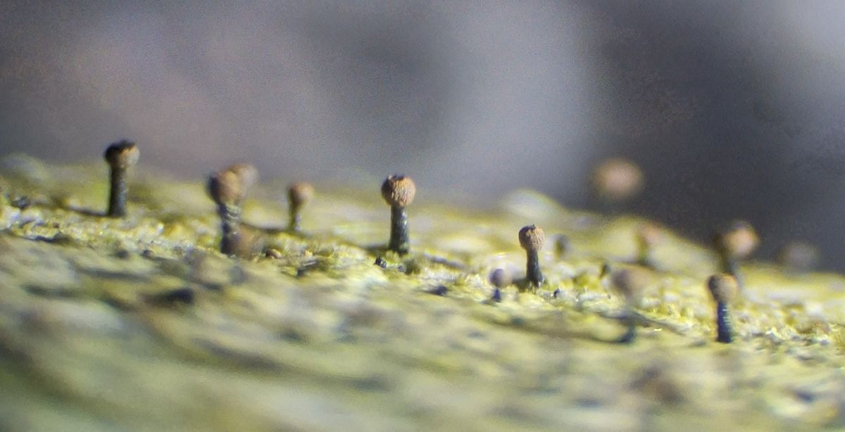 aus dem Moorwald, von einem Kiefernstamm, der kurz vorm Umfallen steht, stammt folgende sehr filigrane Stecknadelflechte. Am Stamm zusammen mit weiteren Arten der Gattungen Calicium und Chaenotheca.
