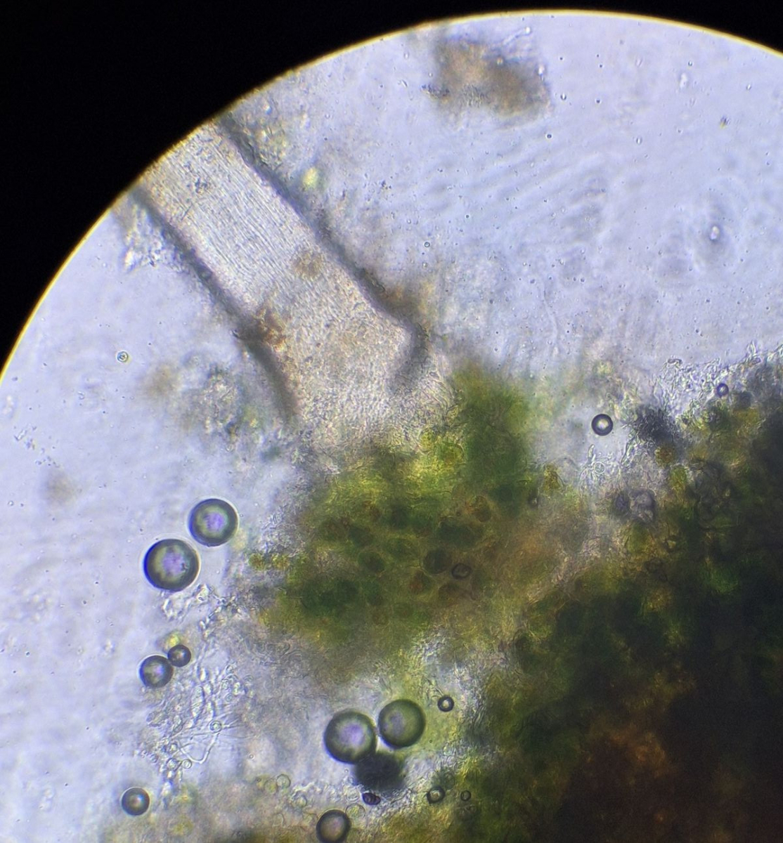 Mitsamt Substrat in KOH 3%: An Algen sind runde grüne und Trentepohlia vorhanden