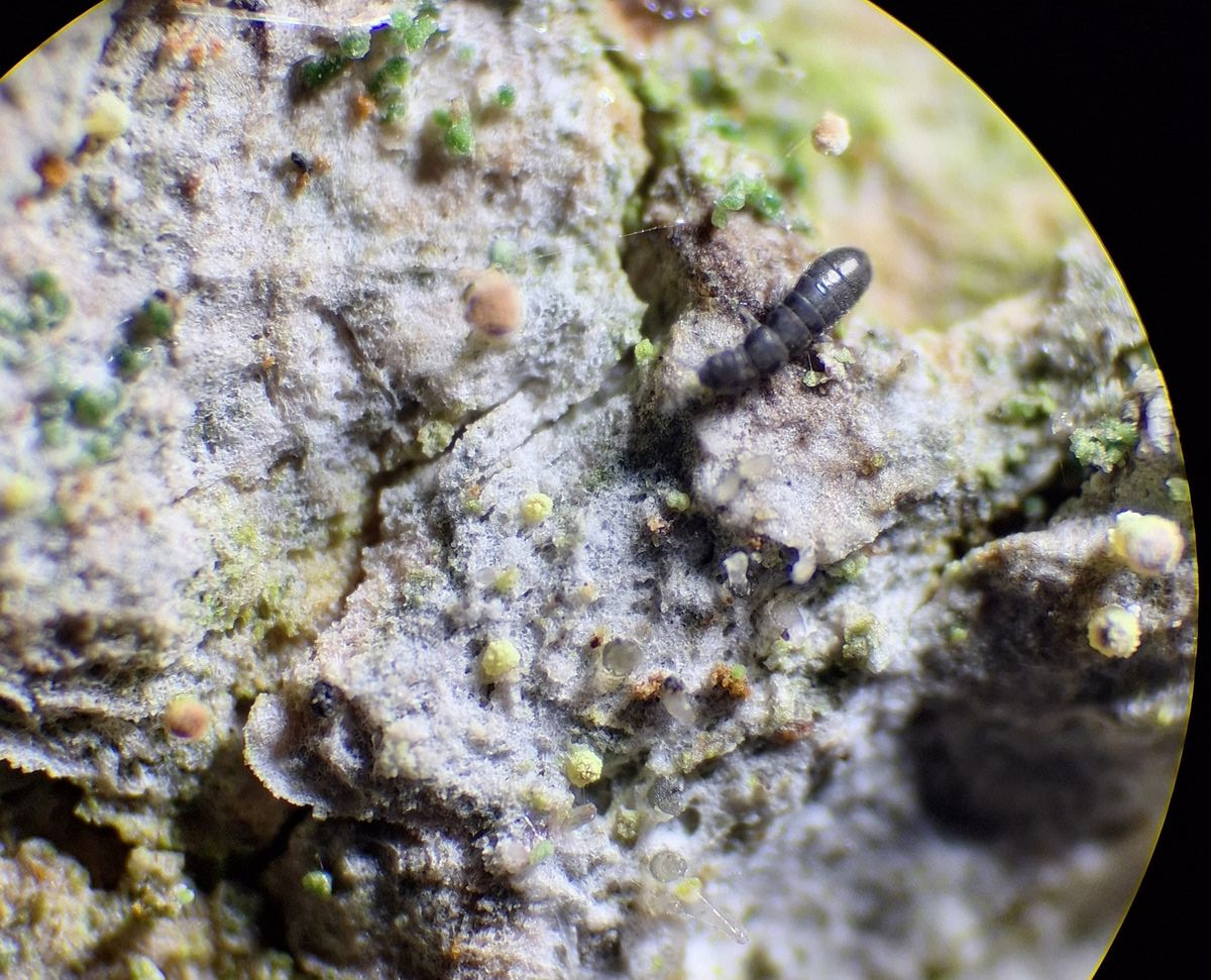 Auflicht (mit Springschwanz) - die Köpfchen sind dreifarbig, nach meinem Verständnis jung gelblich, älter und sehr alt durch die Paraphysen bräunlich, im reifen Zustand durch die Sporenmasse weißlich