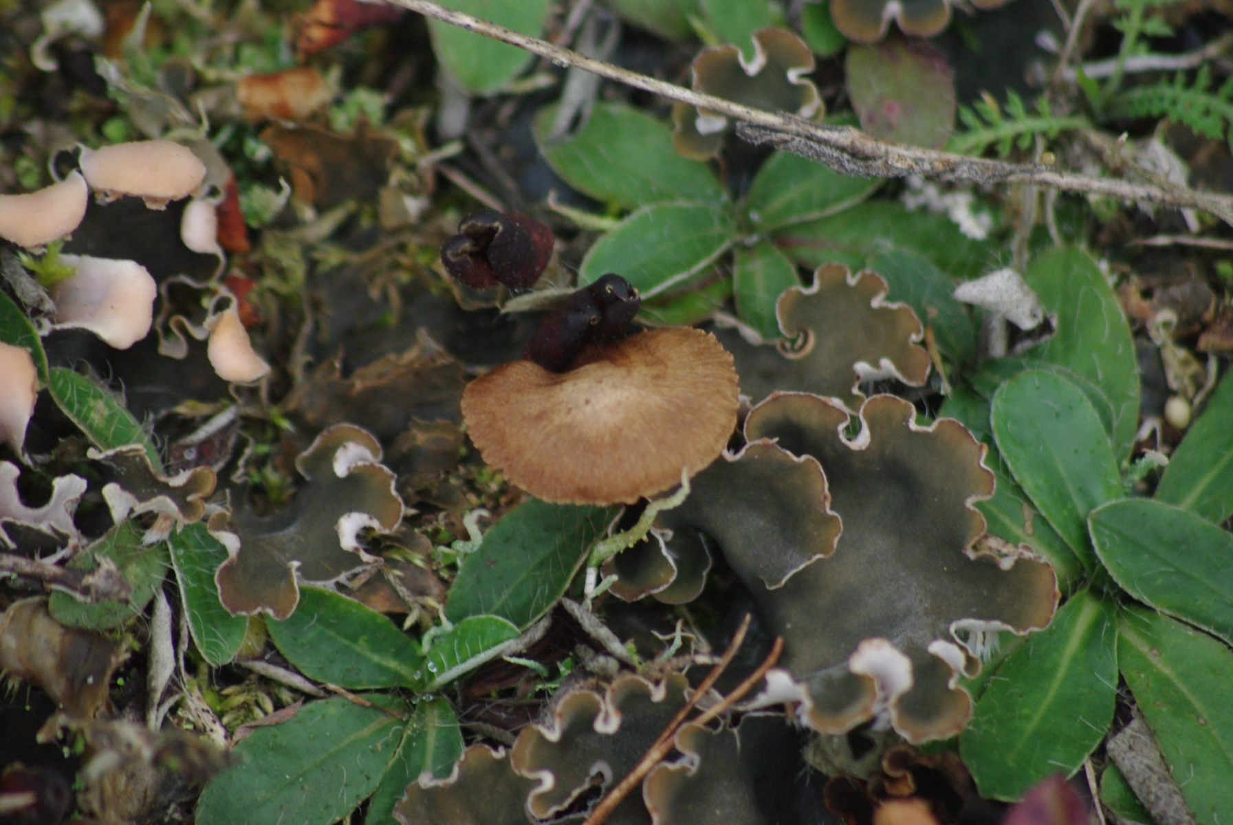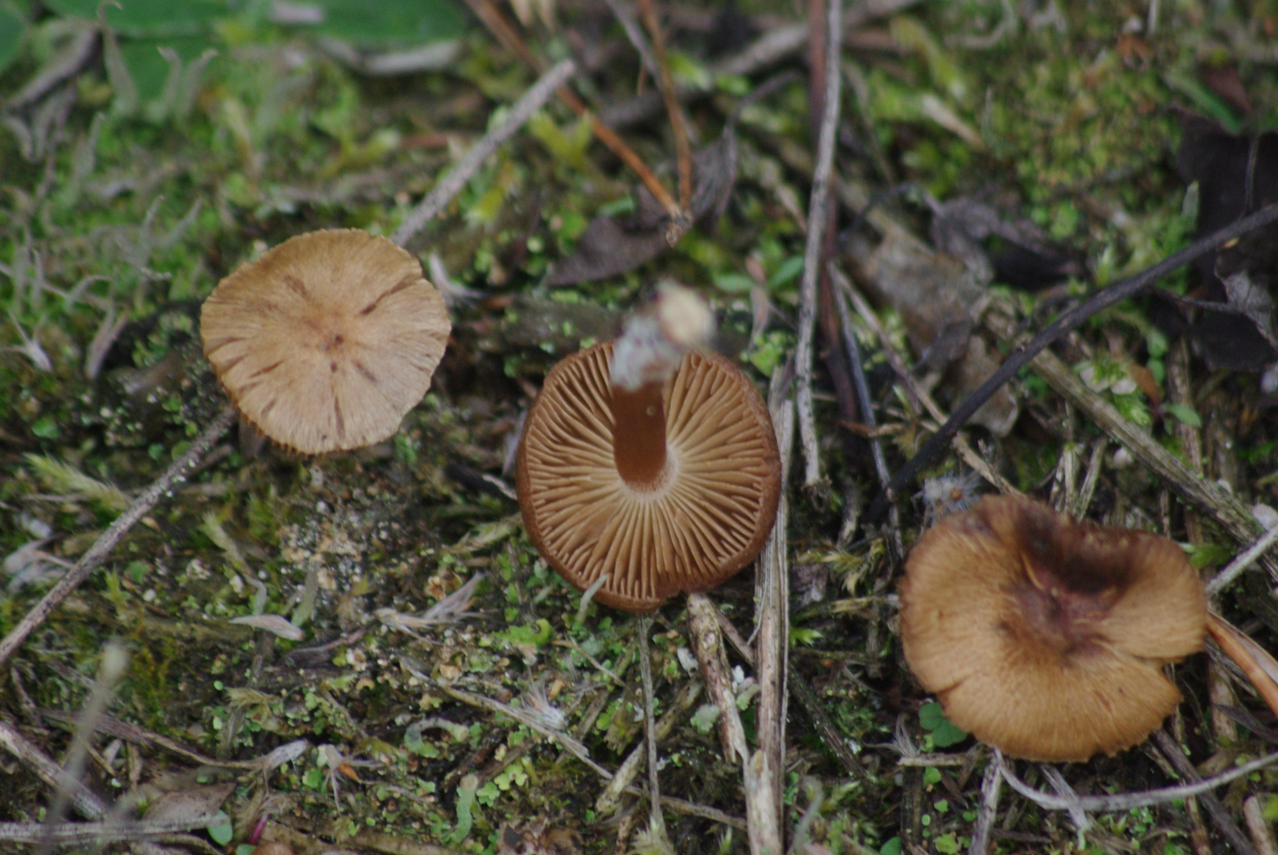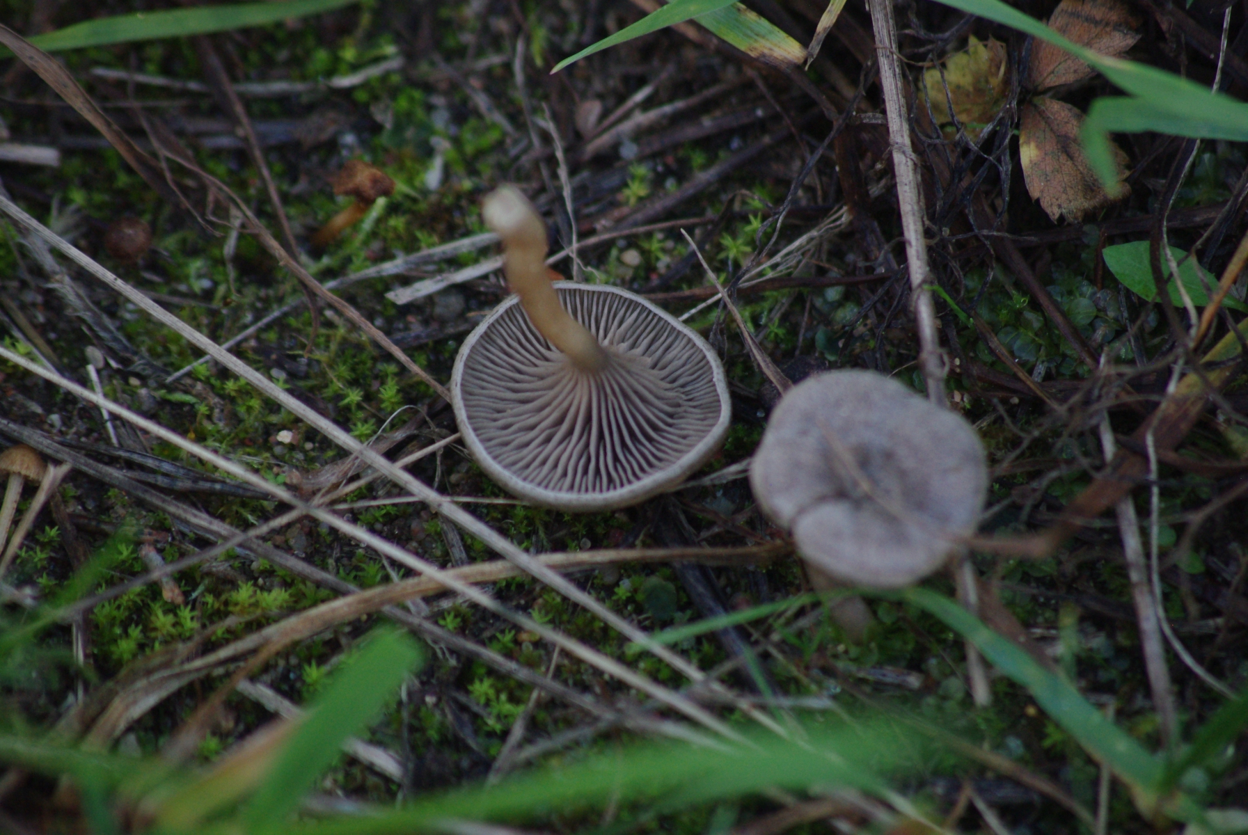 1) hier denke ich an Omphalina/Arrhenia, nur dass man von oben keine durchscheinenden Lamellen bzw. Riefen sieht. So um die 2 cm im Durchmesser, der Hut mittig oder teils auch fast komplett trichterförmig, leichte Krempe, Lamellen herunterlaufend. Geruch unangenehm, Geschmack eher nicht vorhanden.