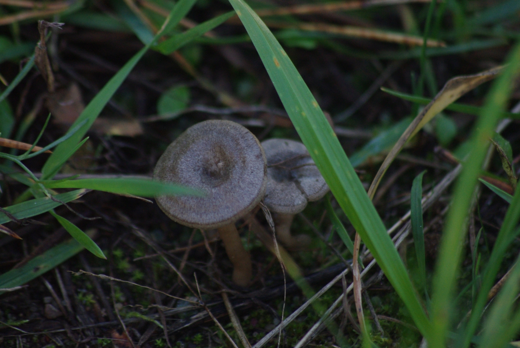 2) klein und orange, am mageren Standort bis 2 cm, an etwas fetteren Stellen auch bis 3 cm, Lamellen frei. Vielleicht Richtung Entoloma?