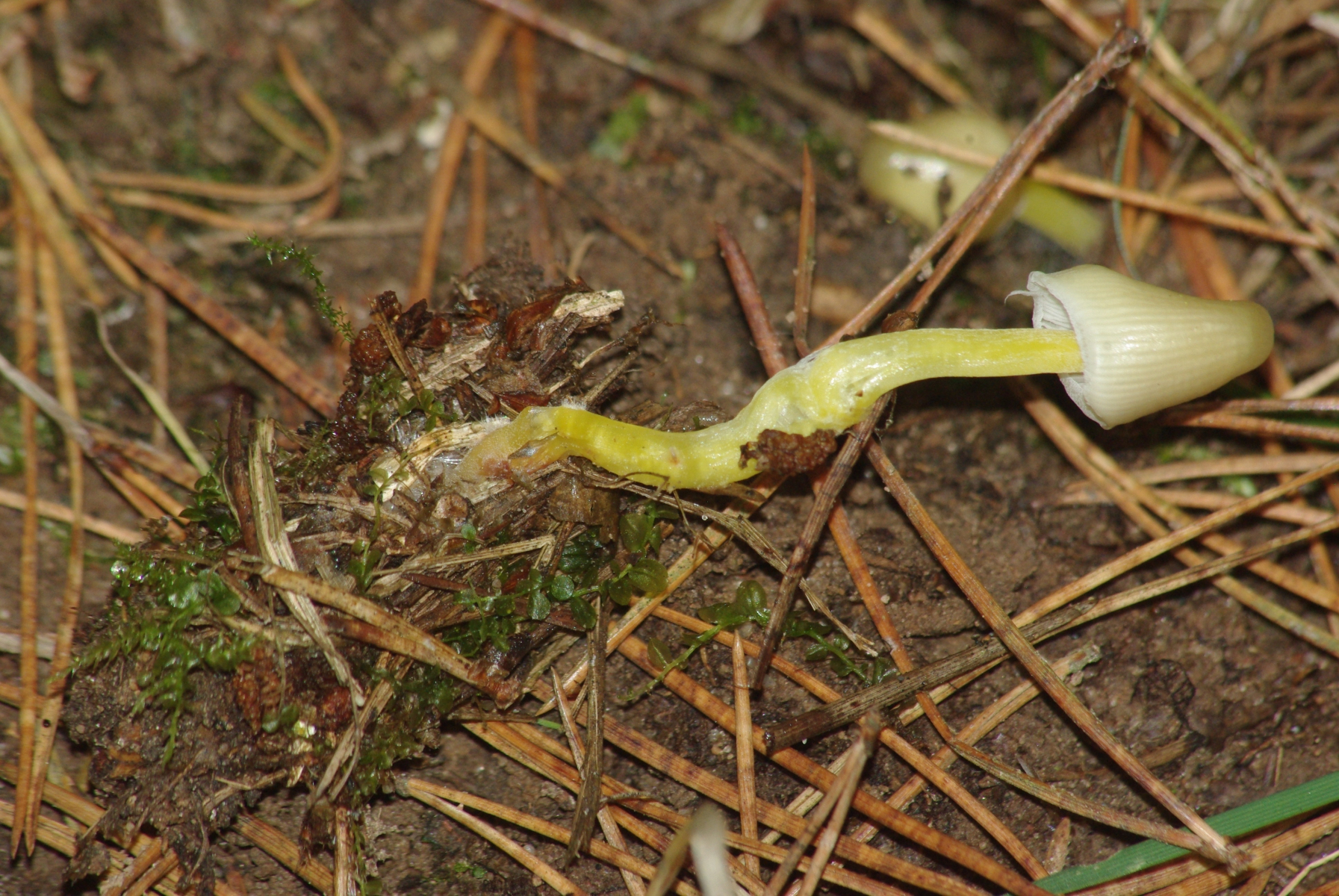 Hallo allerseits, dieser kleine (Höhe über alles, siehe Bild 3, etwa 5 cm) Pilz wächst unter jungen Kiefern, dem Aussehen nach wäre flavipes ein prima Nachname. Mycena flavipes/renati wächst aber büschelig und an Laubholz. Auch Mycena inclinata wächst büschelig. Der Geruch ist leicht muffig, der Geschmack etwas fruchtig. Vielleicht auch keine Mycena?