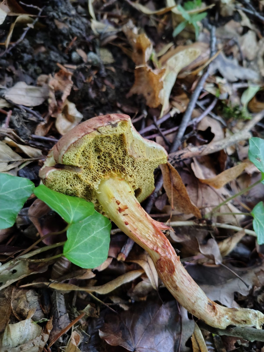 3. Achtung Bild mit Rotstich: Wieder Butyriboletus appendiculatus, im meilenweit nadeldominierten Wald in der Nähe einer kleinen Buche.