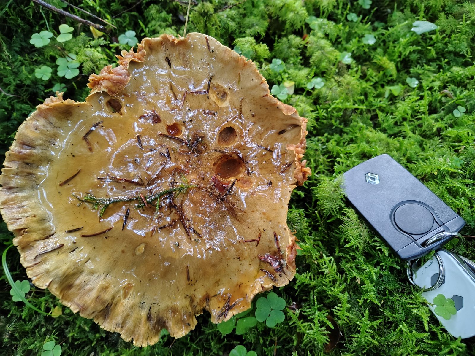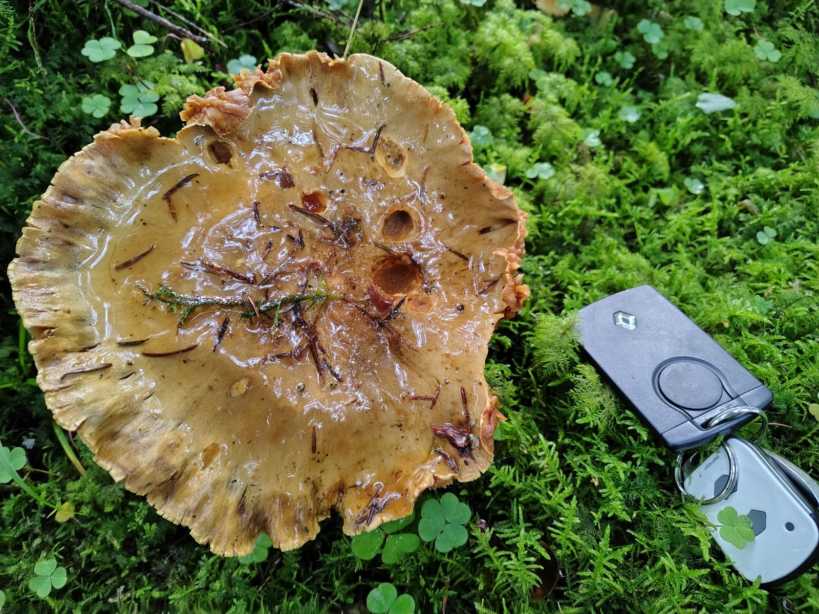 1. Den habe ich gestern im reinen Kalknadelwald bei Fichte und Tanne gefunden. Ein absoluter Riese von Klumpfuß, man beachte beim alten Exemplar den Autoschlüssel als Größenvergleich. Geruch deutlich nach Rettich, für mich nicht nach Aschenbecher. Stiel violett überhaucht, sogar noch bei dem alten Exemplar zu erkennen. Hutfarben komisch beige-/olivbraun.